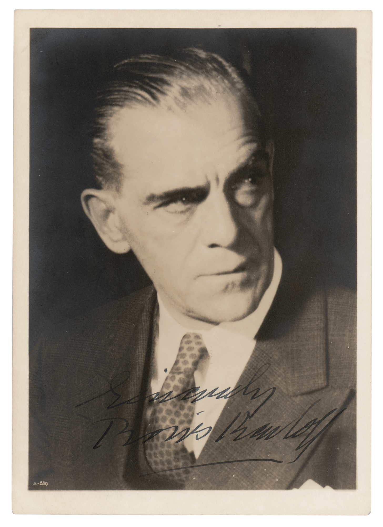 Vintage matte-finish 5 x 7 photo of the famed character actor casting a suspicious glare, signed in fountain pen, “Sincerely, Boris Karloff.” In fine condition, with silvering to the dark background.