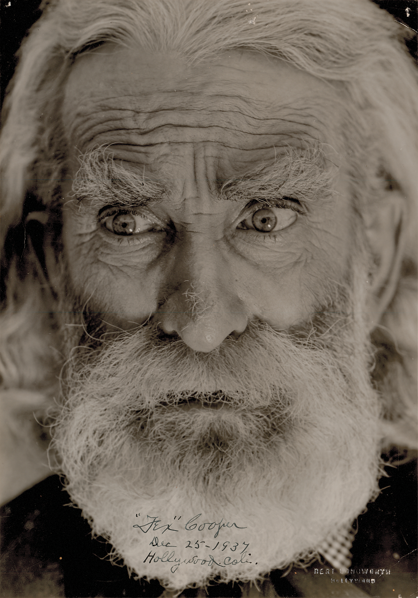 Cowboy and actor (1876–1951) who performed in Wild West shows for the Miller Brothers (101 Ranch) and ‘Buffalo Bill’ Cody before heading to Hollywood and making over 200 movies, the majority B Westerns. Vintage semi-glossy 9 x 13 silver gelatin photo of Tex Cooper, pictured with an intense up-close by the Bert Longworth Studio of Hollywood, signed in fountain pen, "'Tex' Cooper, Dec. 25-1937, Hollywood, Cali." The lower right corner bears the studio photography blindstamp. In fine condition, with tack holes to the corners.