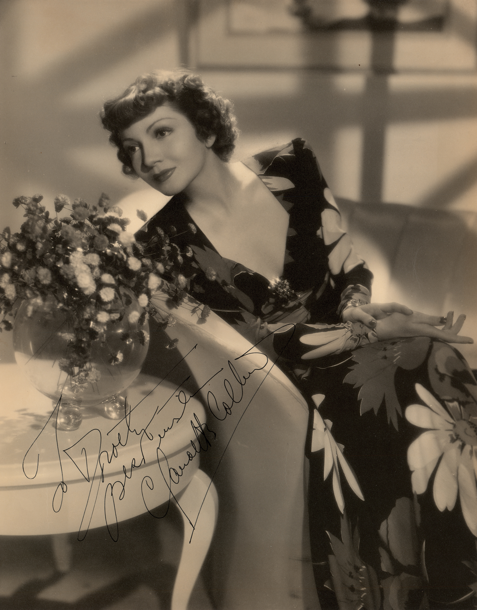 Vintage matte-finish 10.5 x 13.25 photo of the Oscar-winning actress in a lovely seated pose next to a bowl of flowers, signed and inscribed in fountain pen, "To Dorothy, Best wishes, Claudette Colbert.” In very fine condition.