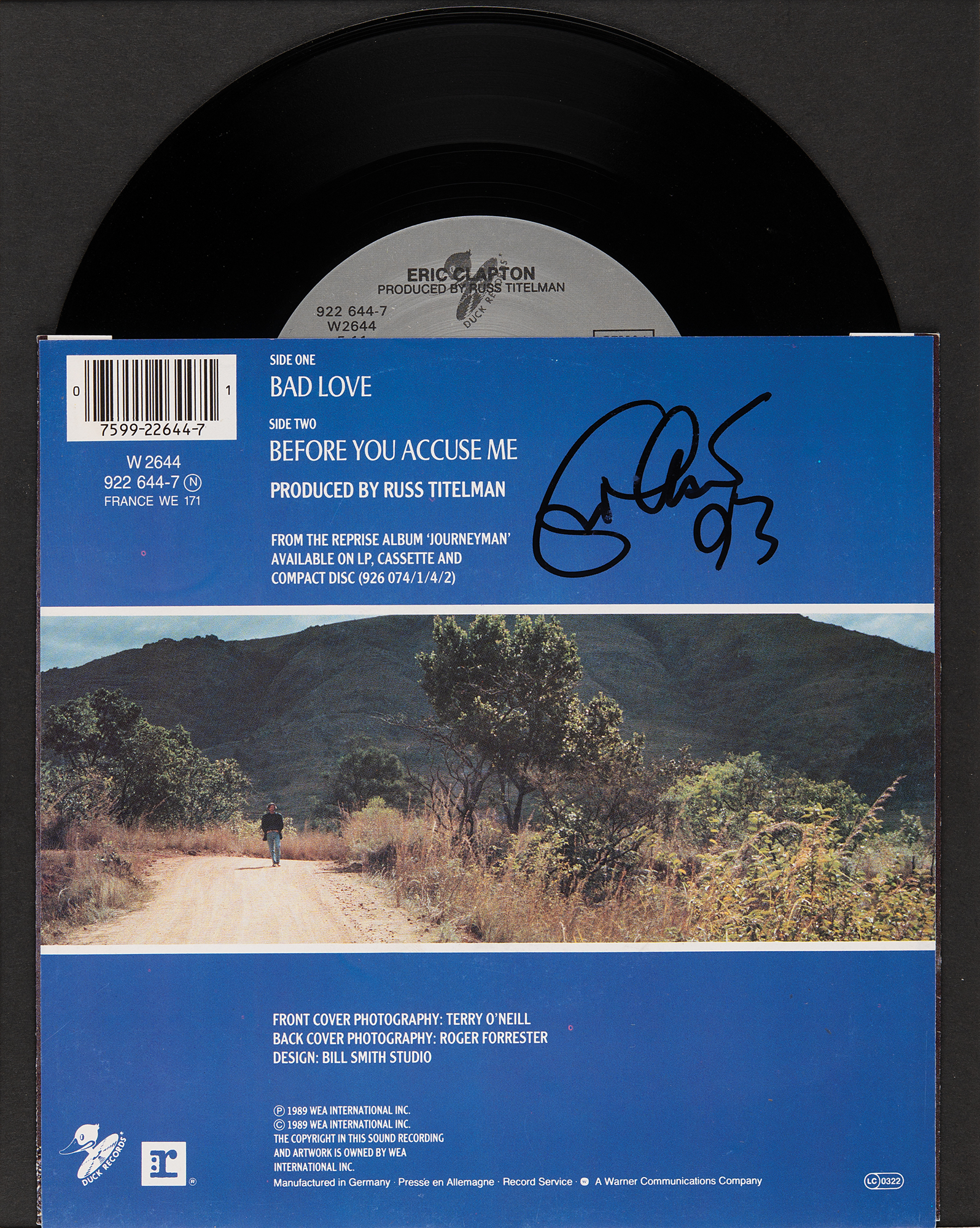Reprise Records / Duck Records German 45 RPM record of the single ‘Bad Love / Before You Accuse Me’ by Eric Clapton, who has signed the back cover in black felt tip and added the year, “93.” Matted with its 45 RPM record and a photo of Clapton to an overall size of 19.5 x 15.75. In fine condition.