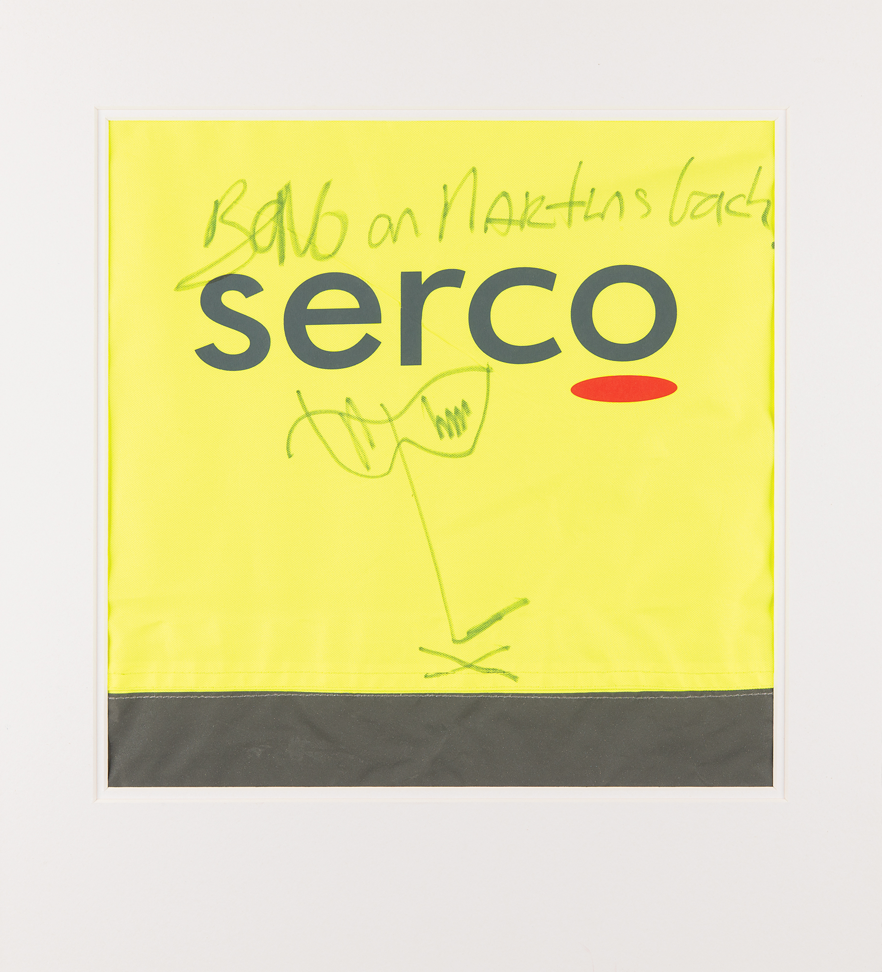 Section of a fluorescent yellow Serco safety vest, 12 x 12, signed and inscribed in black felt tip, “Bono on Martin’s back,” with the U2 singer adding a large self-portrait sketch below. Double-matted to an overall size of 16 x 17.5. In fine condition, with some light creasing from wear. Accompanied by a page from Serco transportation packet for a private flight, which lists of a group of five passengers that includes Paul Hewson (Bono), his wife, his bodyguard, and politician Douglas Alexander.