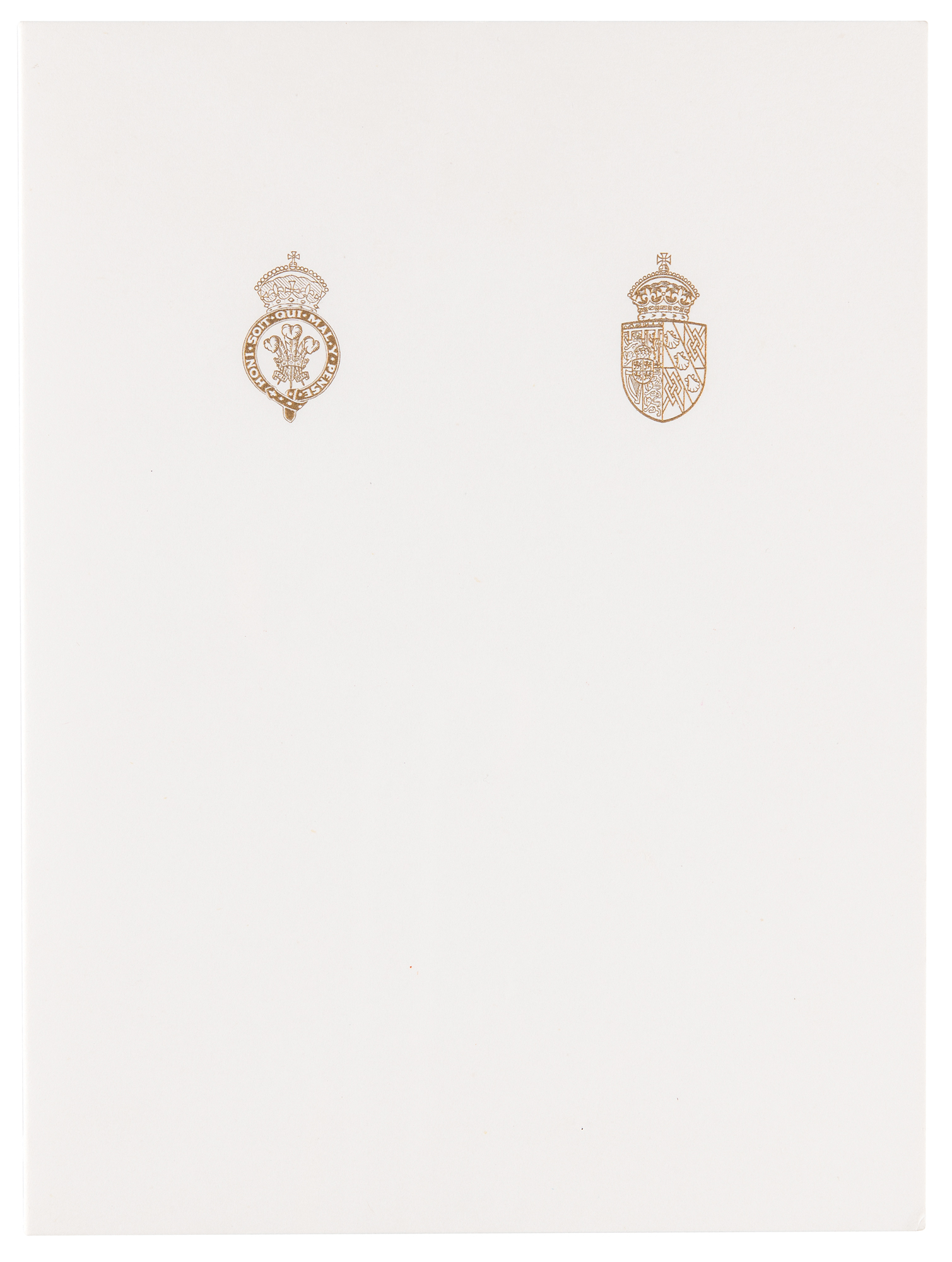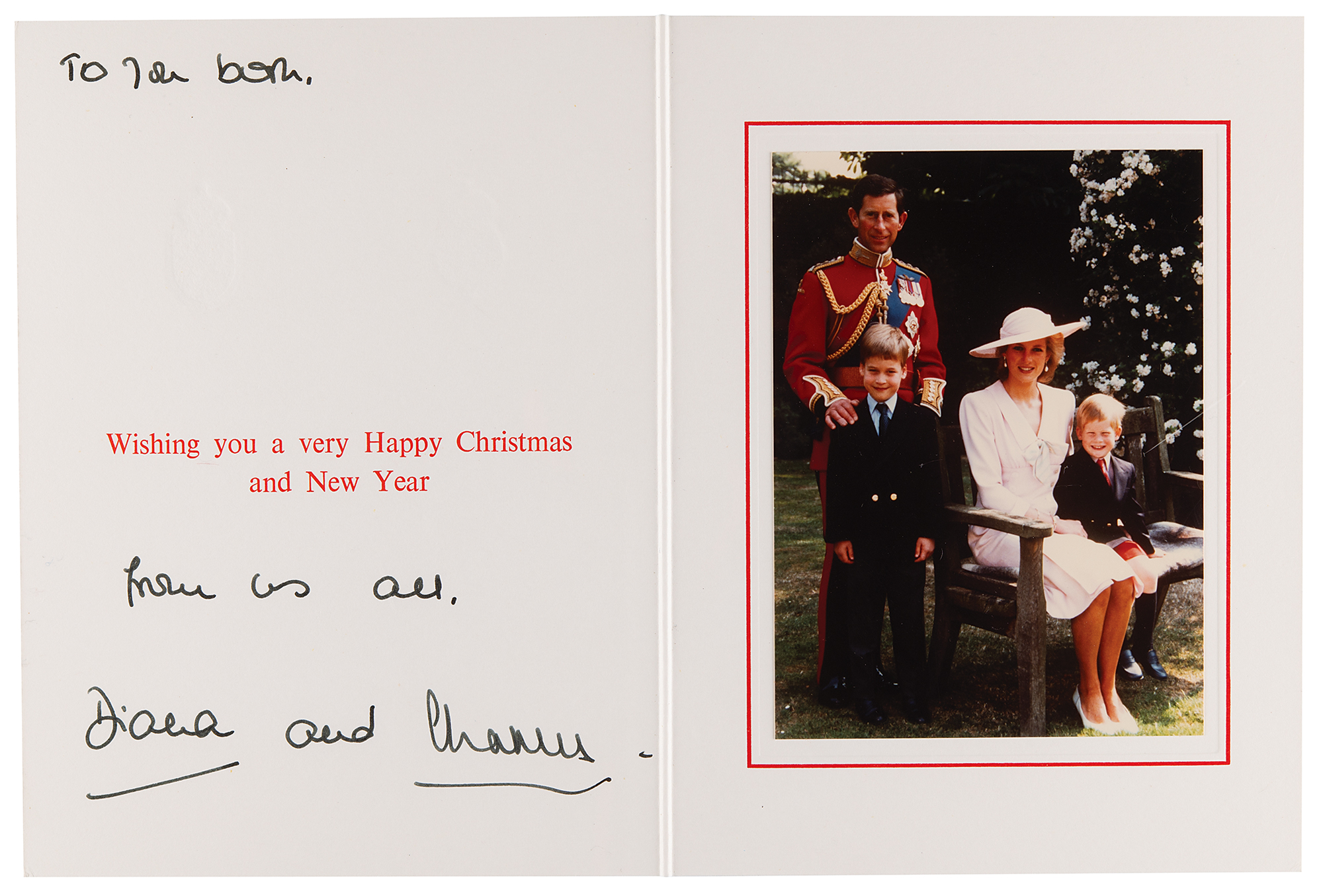 Royal Christmas card from 1989, embossed on the front with the Prince of Wales’s feathers and Order of the Garter motto and the Spencer family arms, measuring 12 x 8 open, featuring an affixed color photo of the royal couple posing with their young sons William and Harry, signed and inscribed in fountain pen, “To you both, from us all, Diana and” and “Charles.” In very fine condition. An uncommon signed Christmas card, examples of which are typically inscribed by Charles.