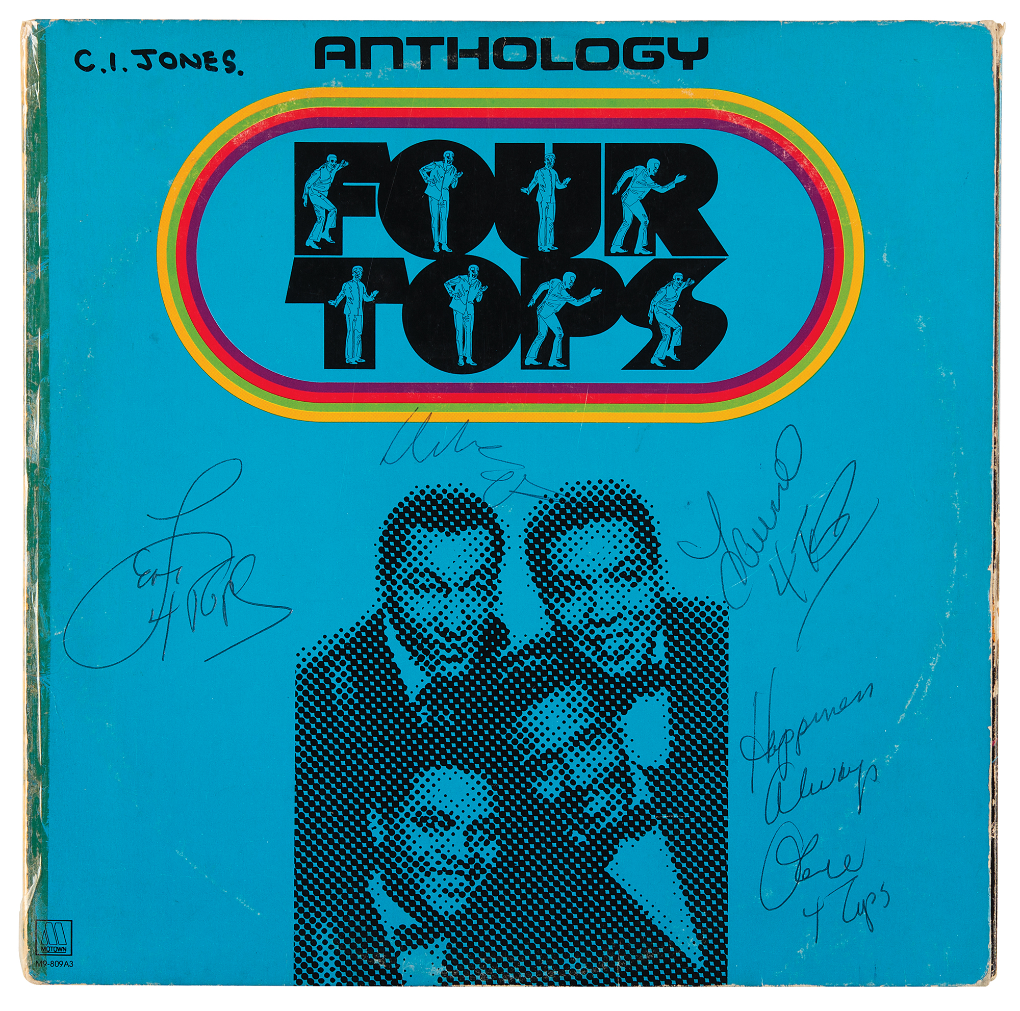 Four Tops Anthology compilation album, signed on the front cover in black ballpoint by Obie Benson, Levi Stubbs, Lawrence Payton, and Duke Fakir. The back cover is signed by an unidentified member of the band. In very good condition, with scuffing, edge wear, and old tape along the worn spine. The record is not included.