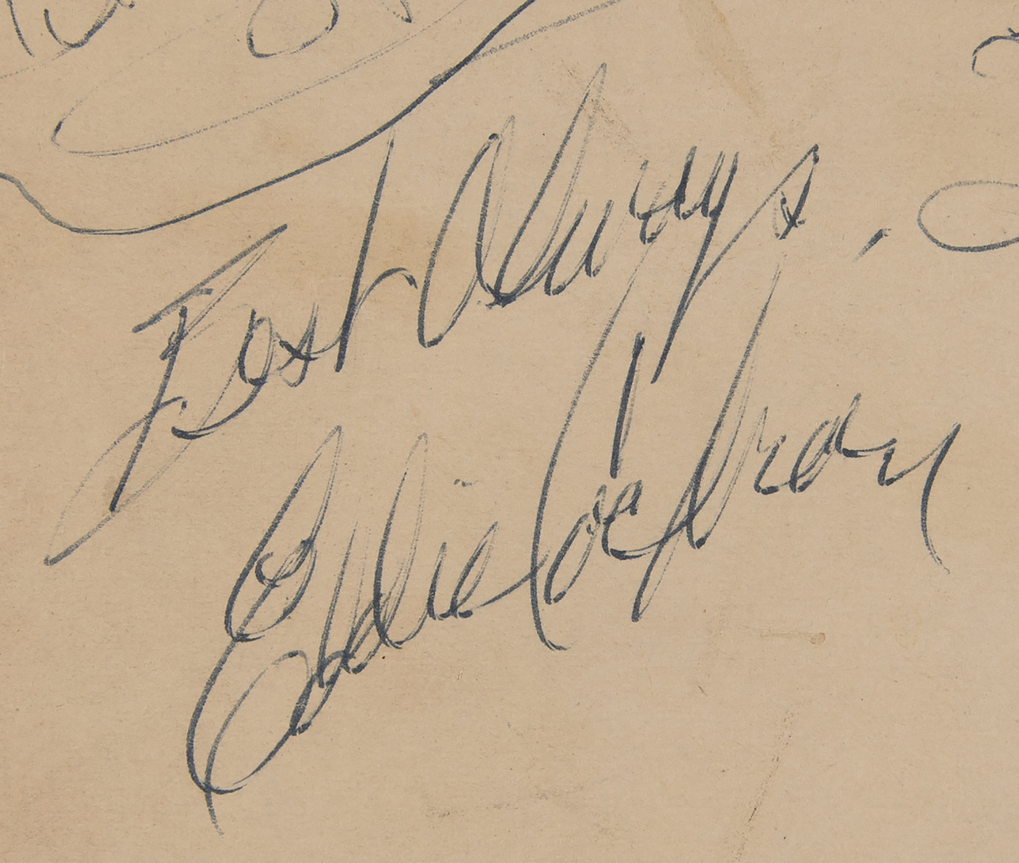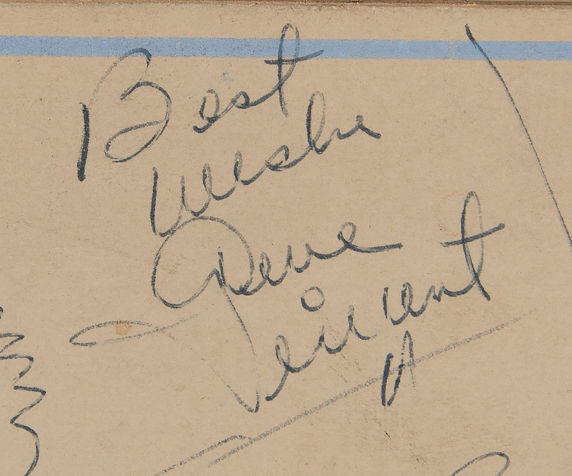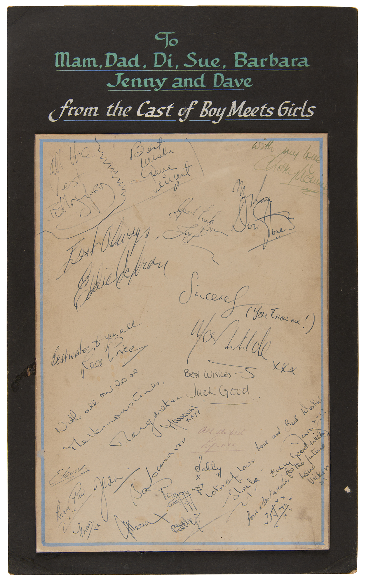 Vintage ballpoint signatures, “Best always, Eddie Cochran” and “Best wishes, Gene Vincent,” on an off-white 7.25 x 10.5 sheet signed by numerous cast members from the popular music TV show Boy Meets Girls. The sheet is affixed to an 8.75 x 14.25 presentation mount that is calligraphically inscribed, “To Mam, Dad, Di, Sue, Barbara, Jenny and Dave, from the Cast of Boy Meets Girls.” In fine condition, with some light soiling.