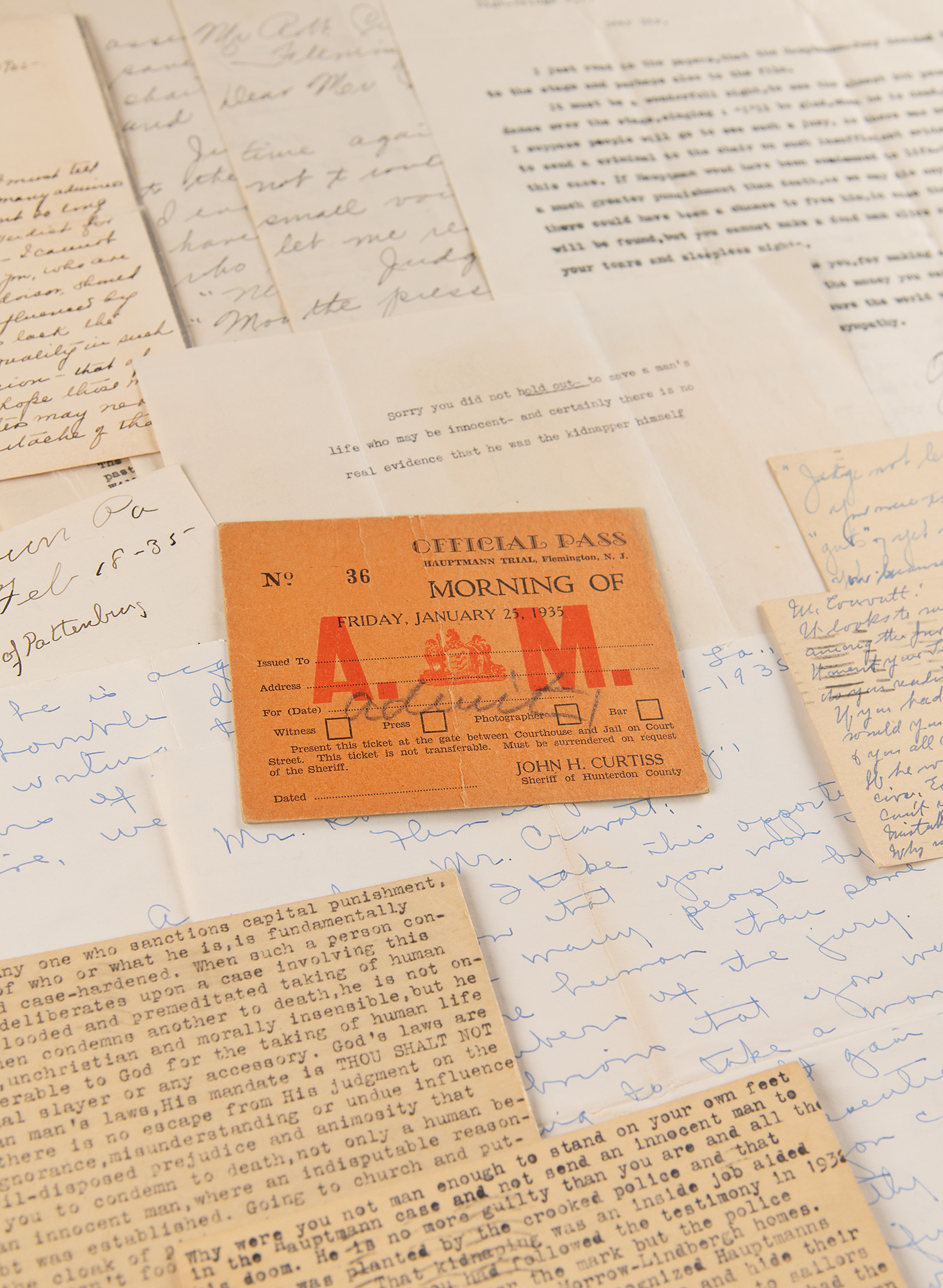 Letter collection from a Hauptmann trial juror, highlighted by a rare original “Official Pass, Hauptmann Trial” for January 25, 1935