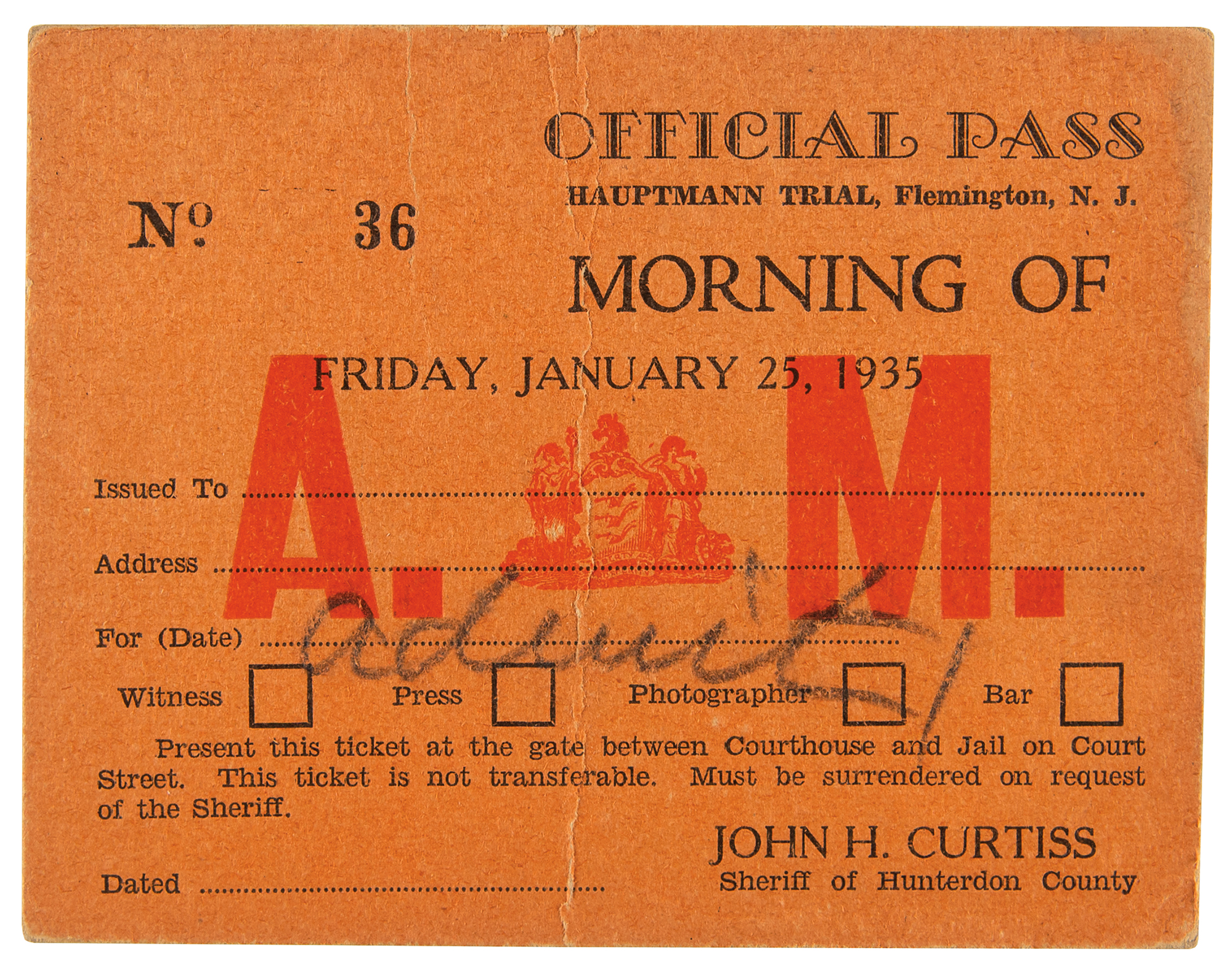 Lindbergh Kidnapping: Juror Robert Cravatt Letter Collection and Rare “Official Pass" for the 1935 Hauptmann Trial