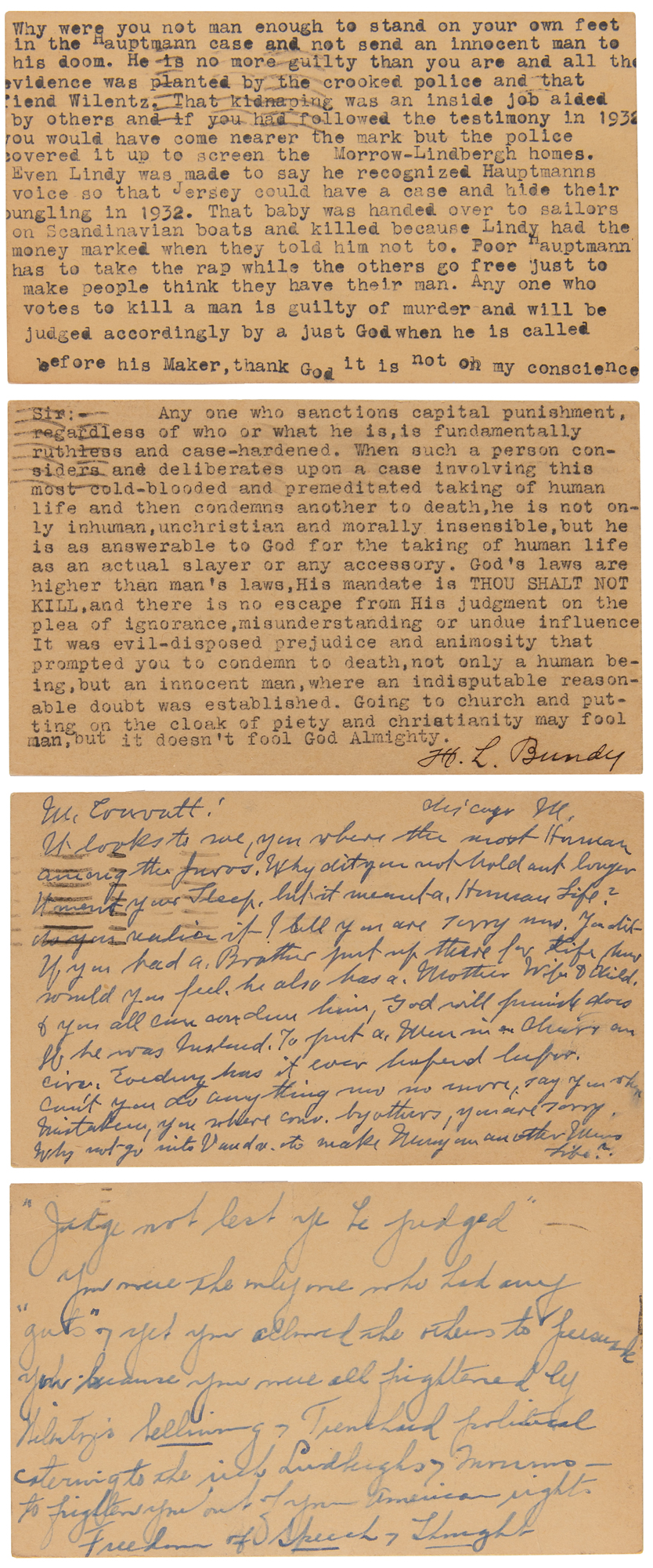 An unsigned type postcard, postmarked February 13, 1935, in part: “Why were you not man enough to stand on your own feet in the Hauptmann case and not send an innocent man to his doom…the police covered it up to screen the Morrow-Lindbergh homes…The baby was handed over to sailors on Scandinavian boats and killed because Lindy had the money marked when they told him not to.”