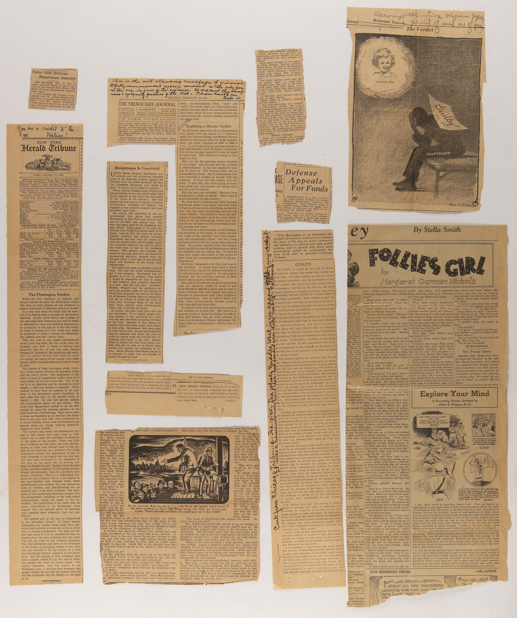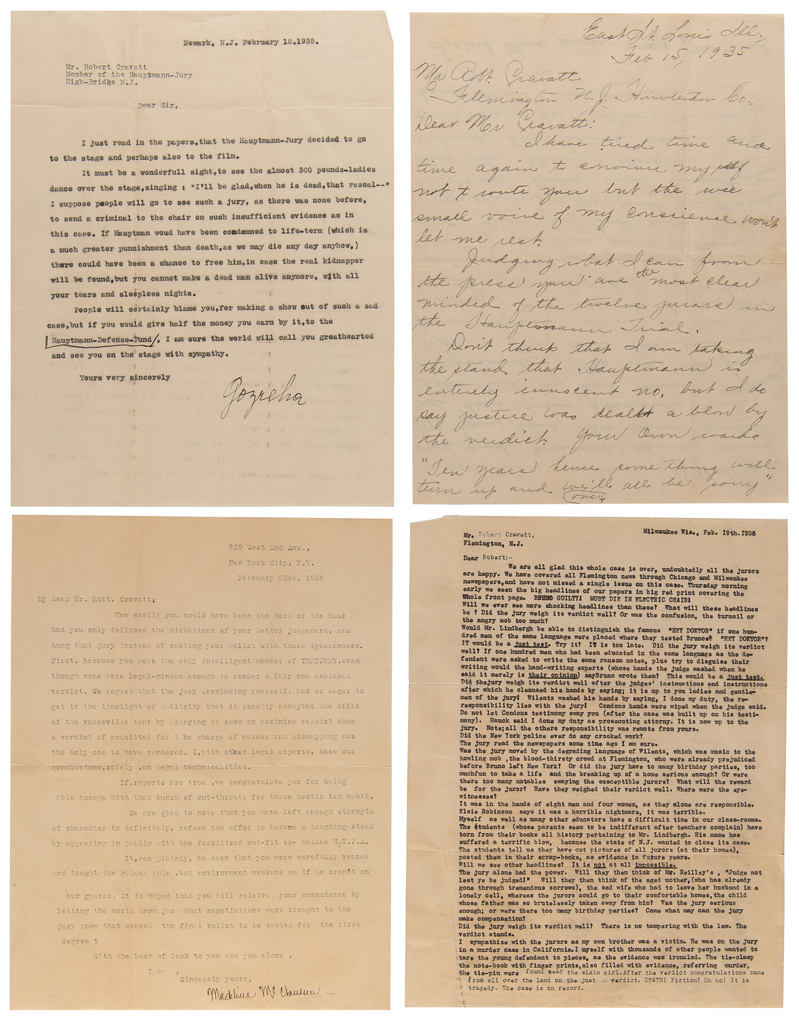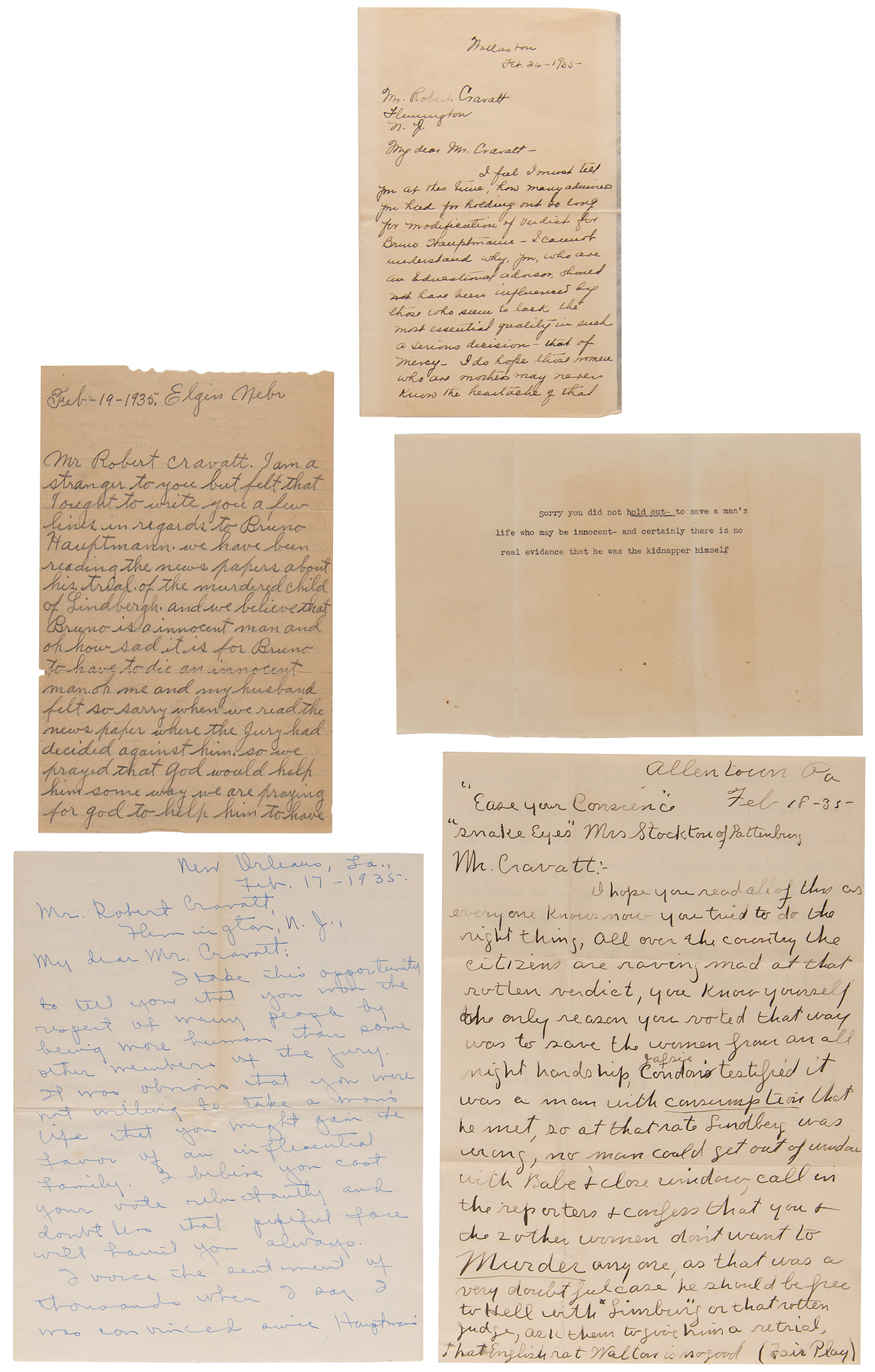 Collection of 13 letters sent to Robert Cravatt, a juror of the famed trial of Richard Hauptmann, who was arrested for the abduction and murder of Charles Augustus Lindbergh, Jr., the 20-month-old son of aviator Charles Lindbergh and his wife Anne Morrow Lindbergh. The trial began on January 3, 1935, and lasted until February 13th. Hauptmann was convicted and was ultimately sentenced to death, with Cravatt, a 28-year-old camp supervisor, the last juror to approve the motion for capital punishment. In addition to the letters is an original “Official Pass, Hauptmann Trial,” for the morning of Friday, January 25, 1935, 4.5 x 3.5, annotated “admit” in pencil and issued as No. 36. The letters, a mixture of typed and handwritten, reveal a public torn over Hauptmann’s innocence, with some expressing delight in the verdict and others indignant. A sampling of newspaper clippings is included, which also contain handwritten notes from the letter writers.