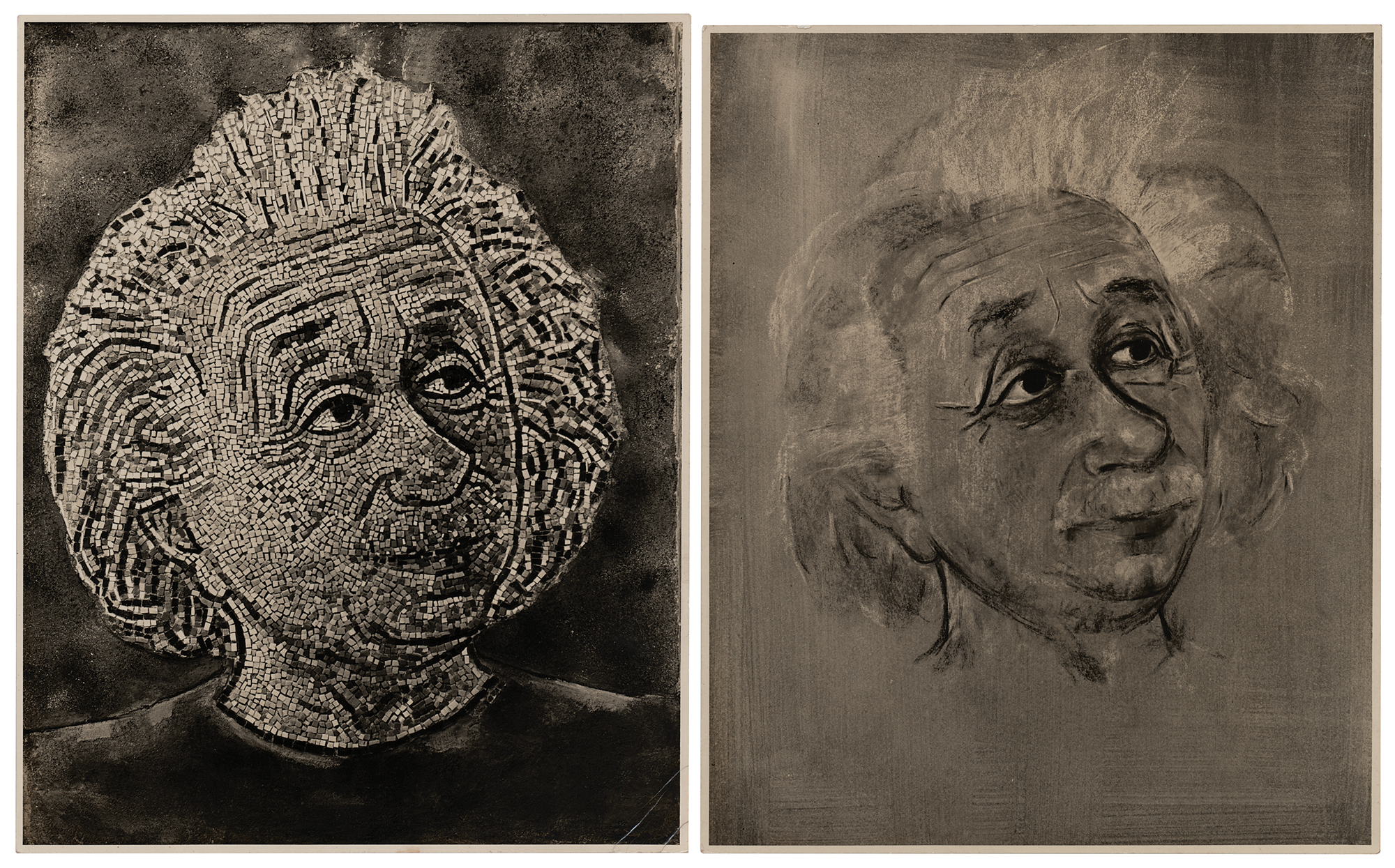 Two original glossy photos of artistic portraits of Albert Einstein by German artist Elsa Schmid, including a 7.75 x 9.5 photo of a drawing of Einstein in mixed media, and a 7.75 x 9.75 photo of the same pose accomplished as a mosaic, which was Schmid’s specialty. The reverse of both photos bears a John D. Schiff photography stamp. In overall fine condition.