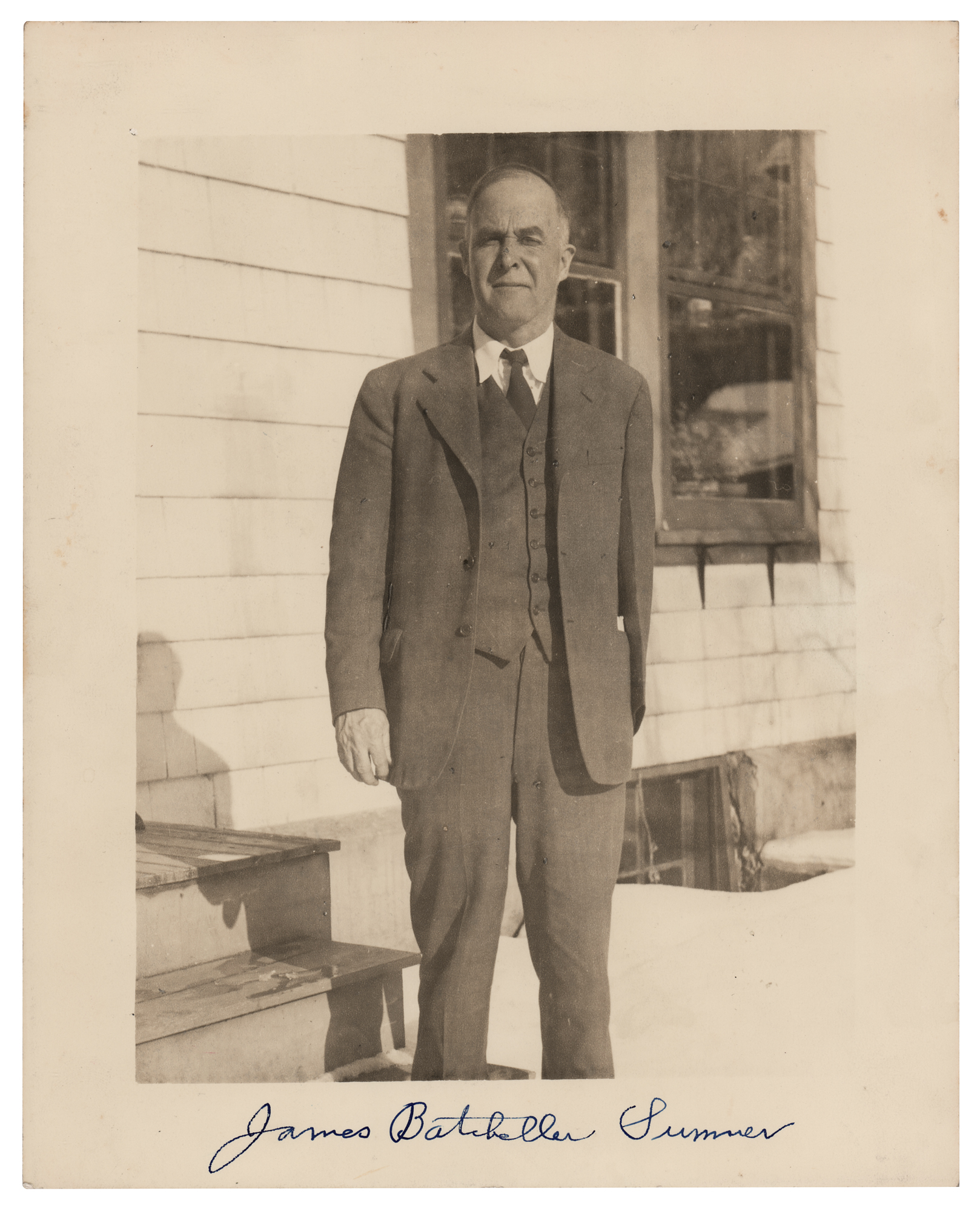 American chemist (1887-1955) who discovered that enzymes can be crystallized, for which he shared the Nobel Prize in Chemistry in 1946 with John Howard Northrop and Wendell Meredith Stanley. He was also the first to prove that enzymes are proteins. Vintage matte-finish 8 x 10 photo of Sumner standing outdoors in a handsome three-quarter-length pose, signed in the lower border in fountain pen, "James Batcheller Sumner." Notation on reverse dates the photo to Christmas 1945 in Ithaca, New York. In fine condition. The only signed photo of Sumner we have ever offered.