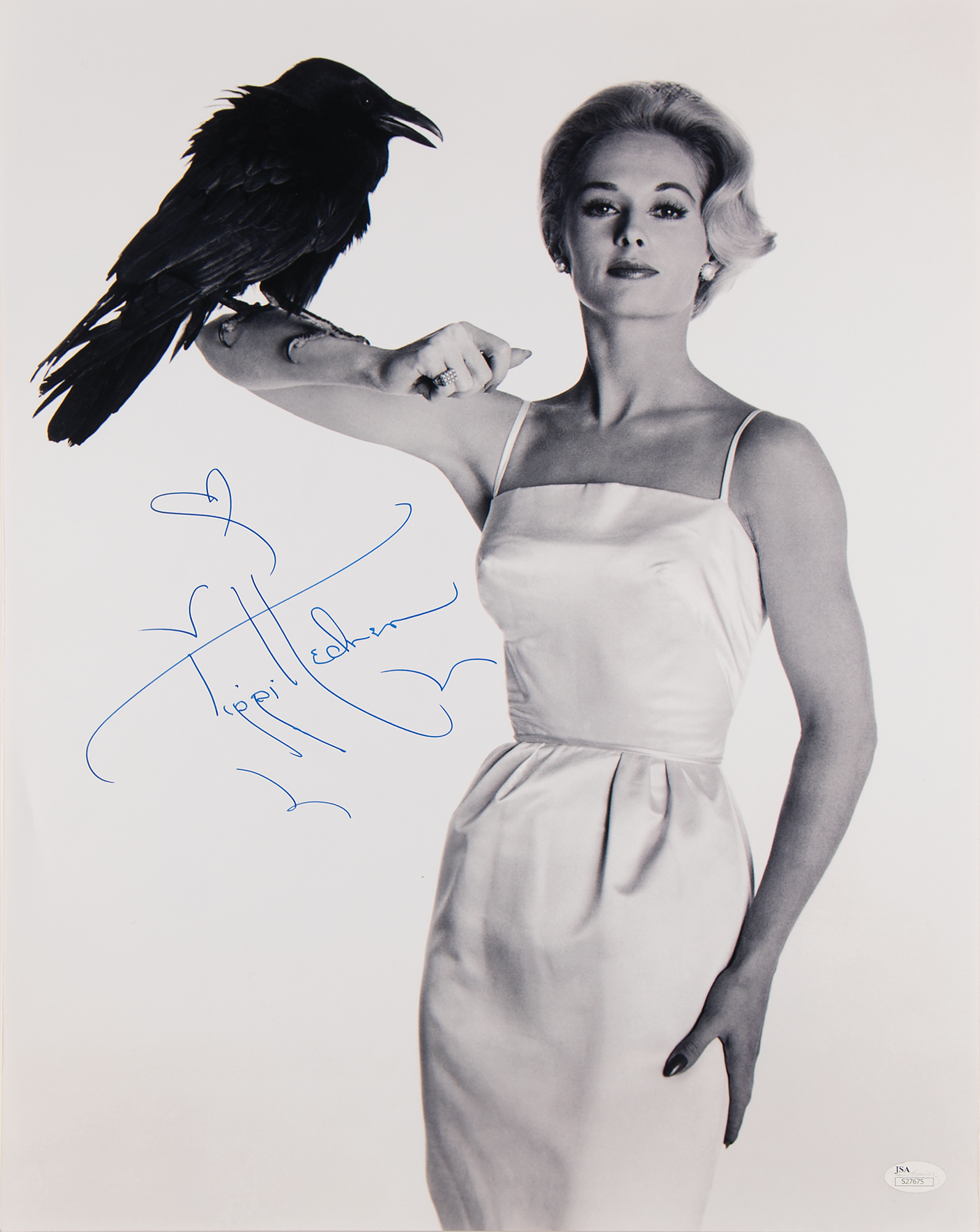 Satin-finish 16 x 20 photo of Tippi Hedren posing with a large raven on her arm, prominently signed in blue felt tip by the actress. In fine condition, with scattered small surface creases.