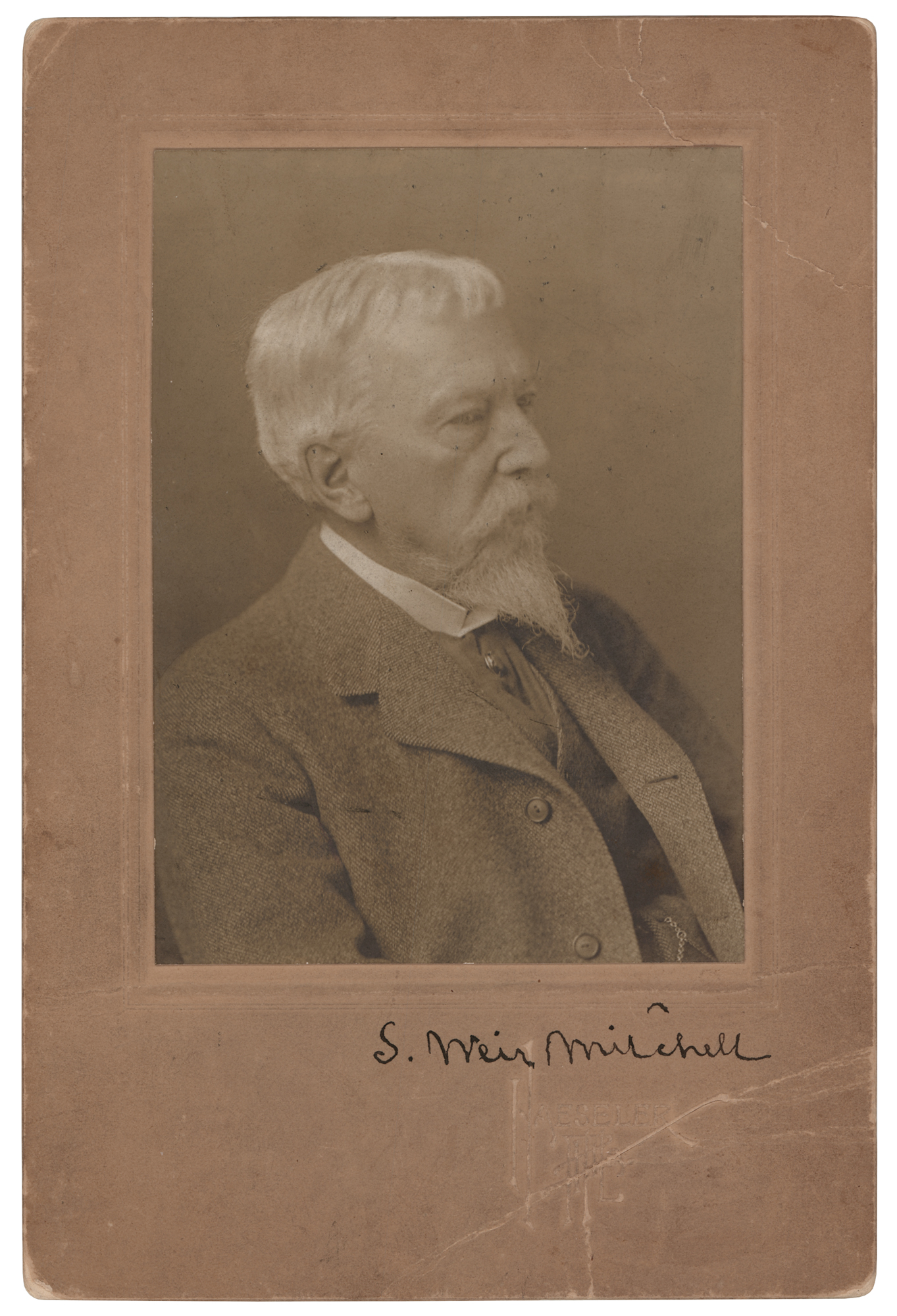 Physician and writer (1829–1914) considered to be the 'father of medical neurology,' known for his discovery of causalgia. Uncommon matte-finish 4 x 5.75 photo of Mitchell in a bust-length pose, affixed to its original 6 x 9 Hessler studio mount, signed on the mount in ink, "S. Weir Mitchell." In very good to fine condition, with creasing and soiling to the mount, not affecting either the signature of the image.