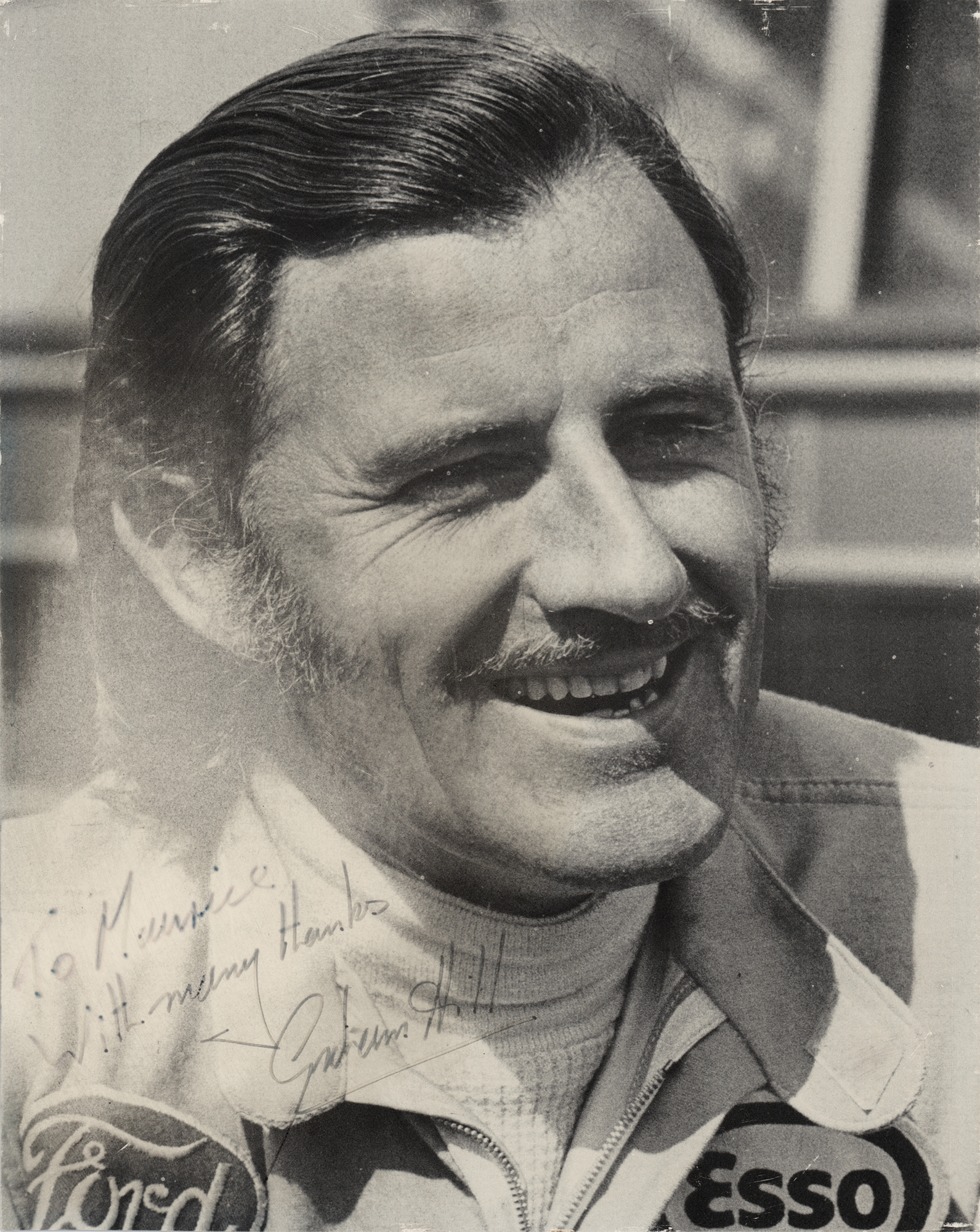 British racing driver (1929–1975) who was twice the Formula One World Champion. He is the only driver ever to win the Triple Crown of Motorsport—the 24 Hours of Le Mans, Indianapolis 500, and the Monaco Grand Prix. Uncommon 8 x 10 cardstock close-up photo of the racing legend, signed and inscribed in black felt tip, "To Maurice, With many thanks, Graham Hill.” In very good condition, with light discoloration and fading to the signature area.