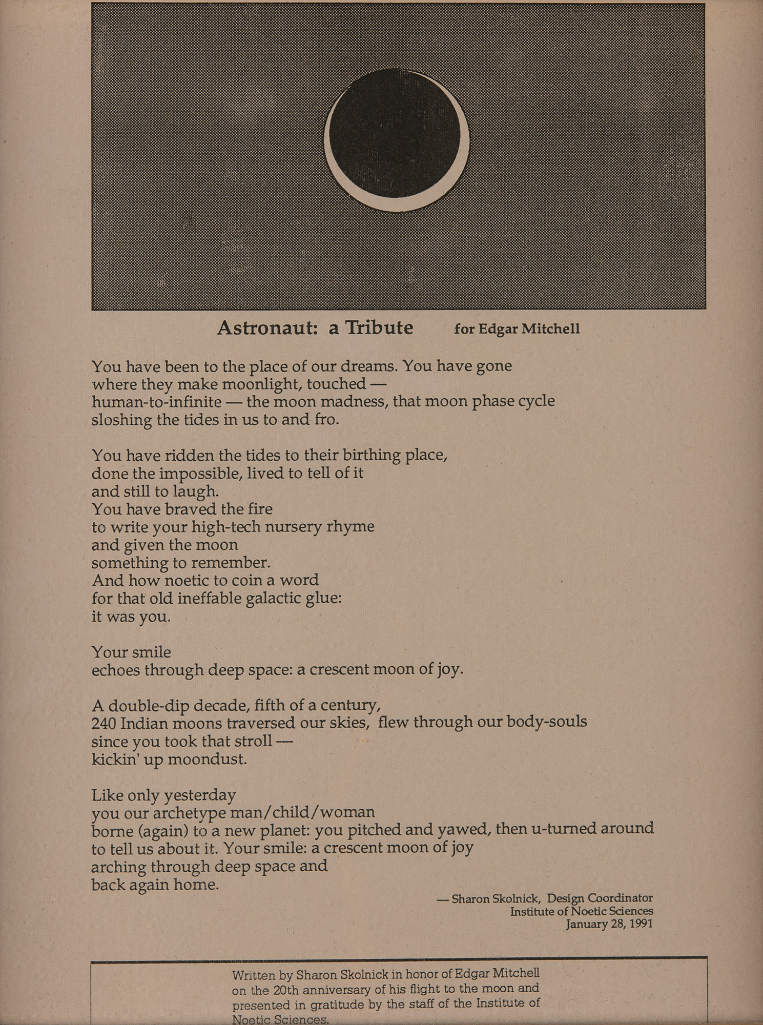 Printed poem entitled "Astronaut: a Tribute for Edgar Mitchell" by Sharon Skolnick, design coordinator for the Institute for Noetic Sciences, one page, 7.25 x 9.5, written by Skolnick "in honor of Edgar Mitchell on the 20th anniversary of his flight to the moon and presented in gratitude by the staff of the Institute of Noetic Sciences." Framed and in fine condition.