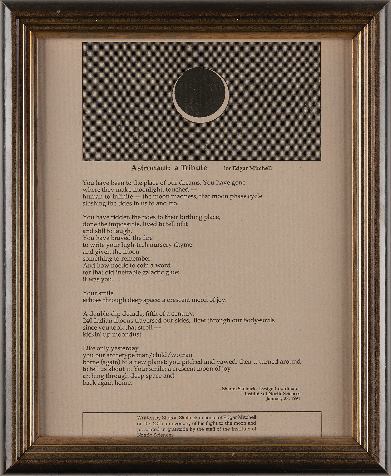Printed poem entitled "Astronaut: a Tribute for Edgar Mitchell" by Sharon Skolnick, design coordinator for the Institute for Noetic Sciences, one page, 7.25 x 9.5, written by Skolnick "in honor of Edgar Mitchell on the 20th anniversary of his flight to the moon and presented in gratitude by the staff of the Institute of Noetic Sciences." Framed and in fine condition.