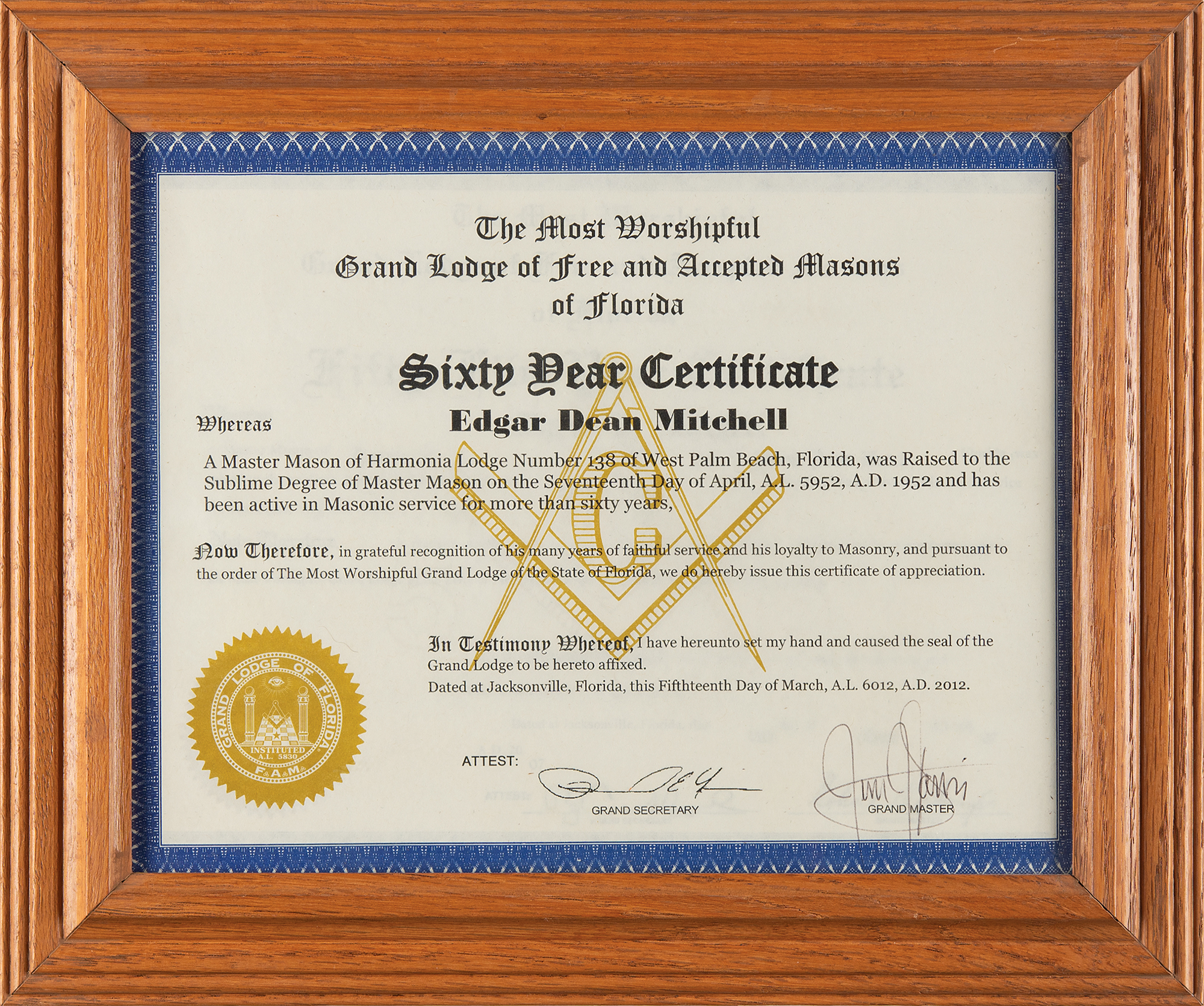 Certificate of appreciation presented to Edgar Mitchell by "The Most Worshipful Grand Lodge of Free and Accepted Masons of Florida," one page, 9.5 x 7.5, March 15, 2012. In part: "Whereas Edgar Dean Mitchell, A Master Mason of Harmonia Lodge Number 138 of West Palm Beach, Florida, was Raised to the Sublime Degree of Master Mason on the Seventeenth Day of April, AL. 5952, A.D. 1952 and has been active in Masonic service for more than sixty years, Now Therefore, in grateful recognition of his many years of faithful service and his loyalty to Masonry, and pursuant to the order of The Most Worshipful Grand Lodge of RS State of Florida, we do hereby issue this certificate of appreciation." Framed and in fine condition.