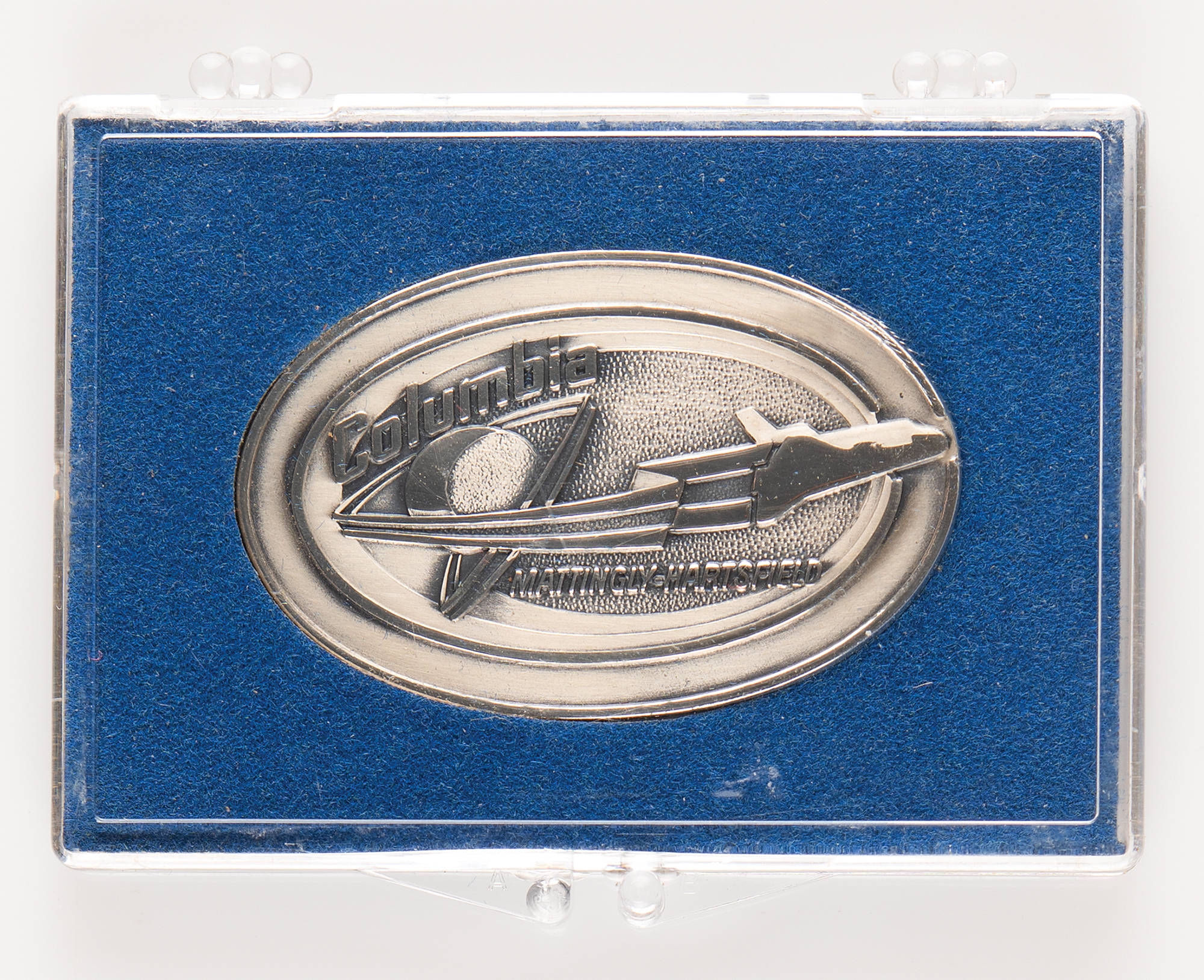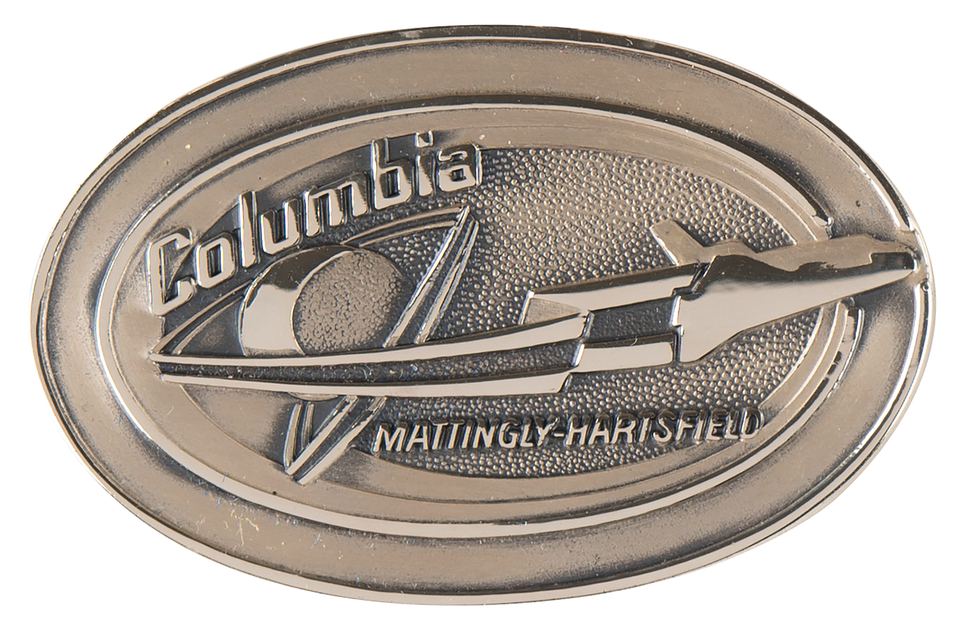 Edgar Mitchell's unflown STS-4 Robbins medallion, approximately 2˝ x 1.25˝, with a raised design on the face featuring the mission insignia for the fourth flight of Space Shuttle Columbia. The reverse is encircled by the names of the astronauts, "Thomas K. Mattingly II" and "Henry W. Hartsfield, Jr.," and is engraved with the launch date of June 27, 1982, and landing date of July 4, 1982. . The medallion is serial numbered "186" on the edge, and stamped with the Robbins "Ster." hallmark. Condition is mint state. Includes its original matching plastic case.