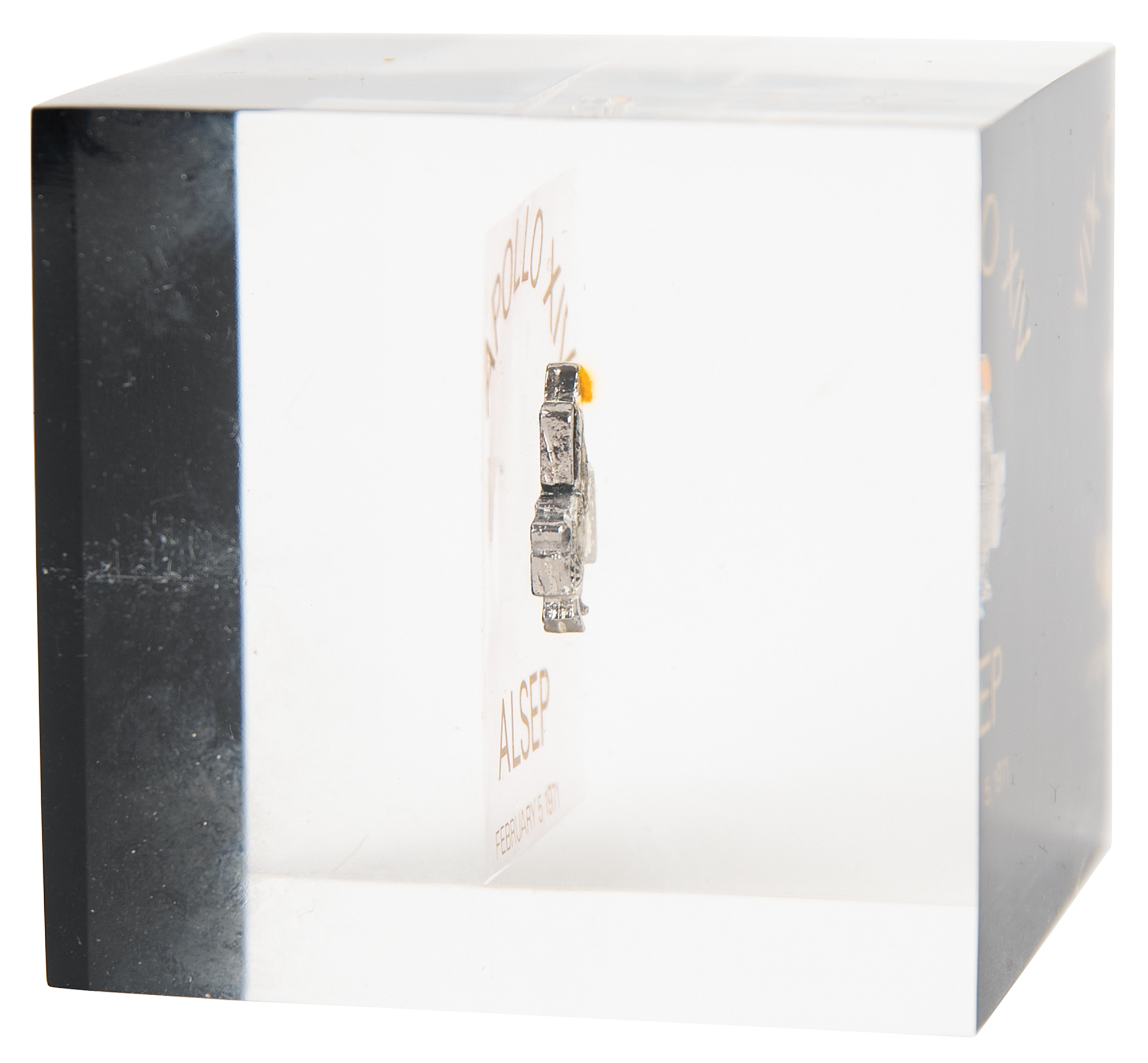 Edgar Mitchell’s flown ‘Astronaut with ALSEP’ emblem that was carried to the lunar surface on the Lunar Module Antares during the Apollo 14 mission. The small emblem, which measures .75˝ x .75˝ and depicts an astronaut with an orange visor carrying the Apollo Lunar Surface Experiments Package (ALSEP), is encased in a Lucite block, 2.5˝ x 2.75˝ x 2.5˝, with upper and lower golden text, “Apollo XIV, ALSEP, February 6, 1971.” The bottom of the block features additional NASA/Bendix caption text: “This emblem of the Apollo Lunar Surface Experiments Package being carried to its deployment site on Fra Mauro was taken to the surface of the Moon and returned to Earth on the Apollo XIV spacecraft by Astronauts Shepard, Roosa and Mitchell. February 5, 1971." In fine condition.