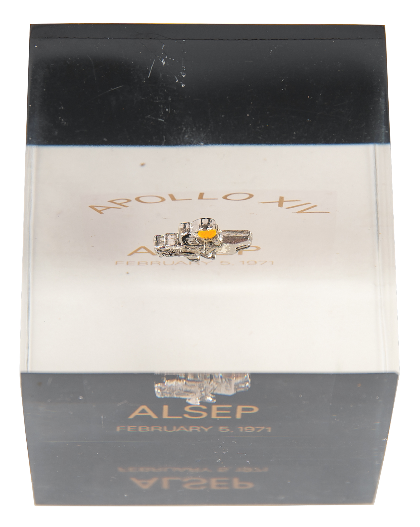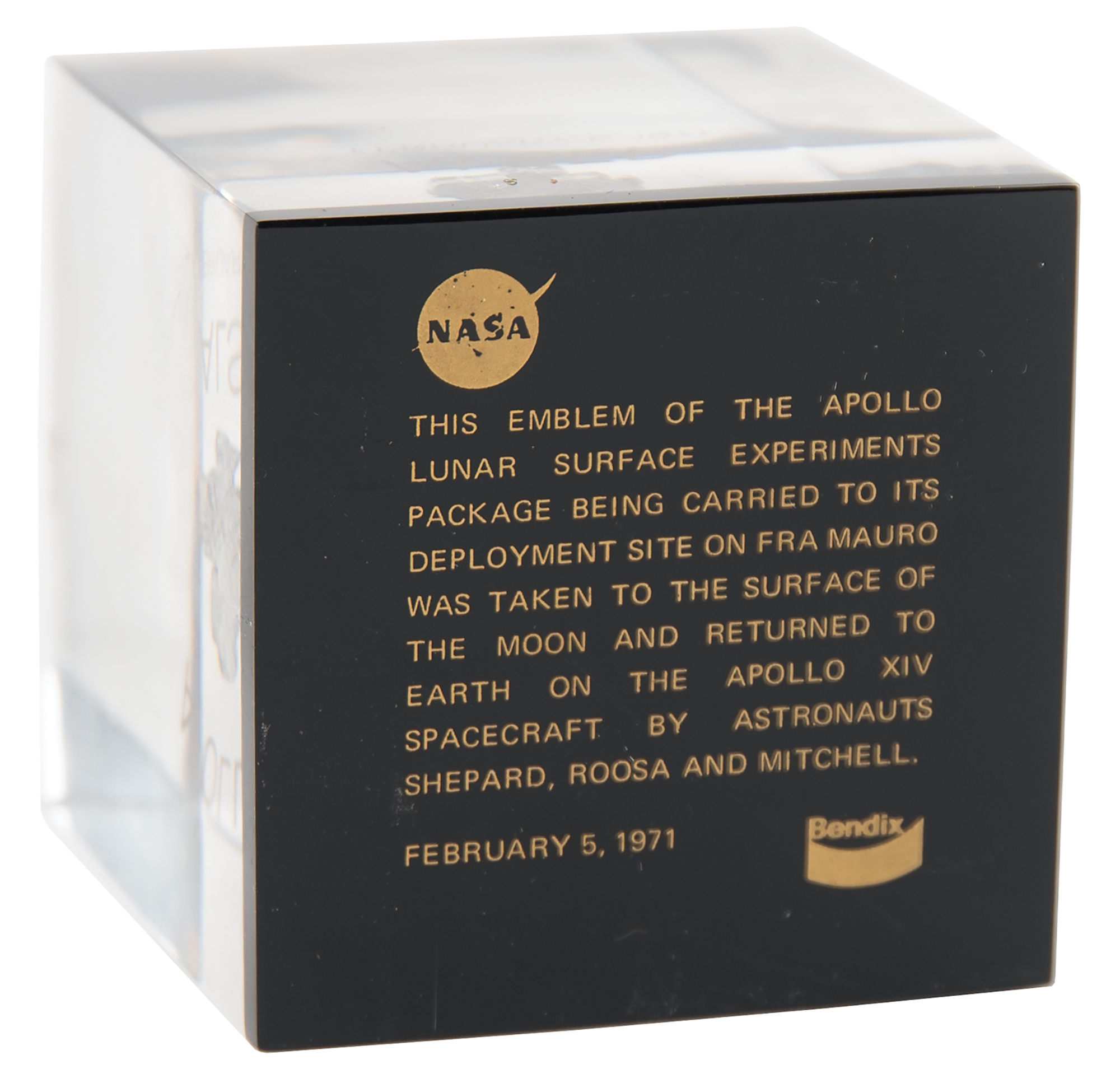 The Bendix Aerospace Company, selected by NASA to design and manufacture the ALSEP, produced a small quantity of these metallic emblems to be given as gifts once they were returned to Earth. Mitchell carried the emblems to the moon in his Personal Preference Kit (PPK), then returned them to Bendix to be transformed into these Lucite presentations commemorating the successful deployment of the ALSEP. The Apollo 14 ALSEP carried an Active Seismic Experiment, Suprathermal Ion Detector Experiment, and Radioisotope Thermoelectric Generator, which Mitchell helped to place and operate on the lunar surface at Fra Mauro. As a testament to its durable construction, the Apollo 14 ALSEP station continued to broadcast experimental data until 1977.