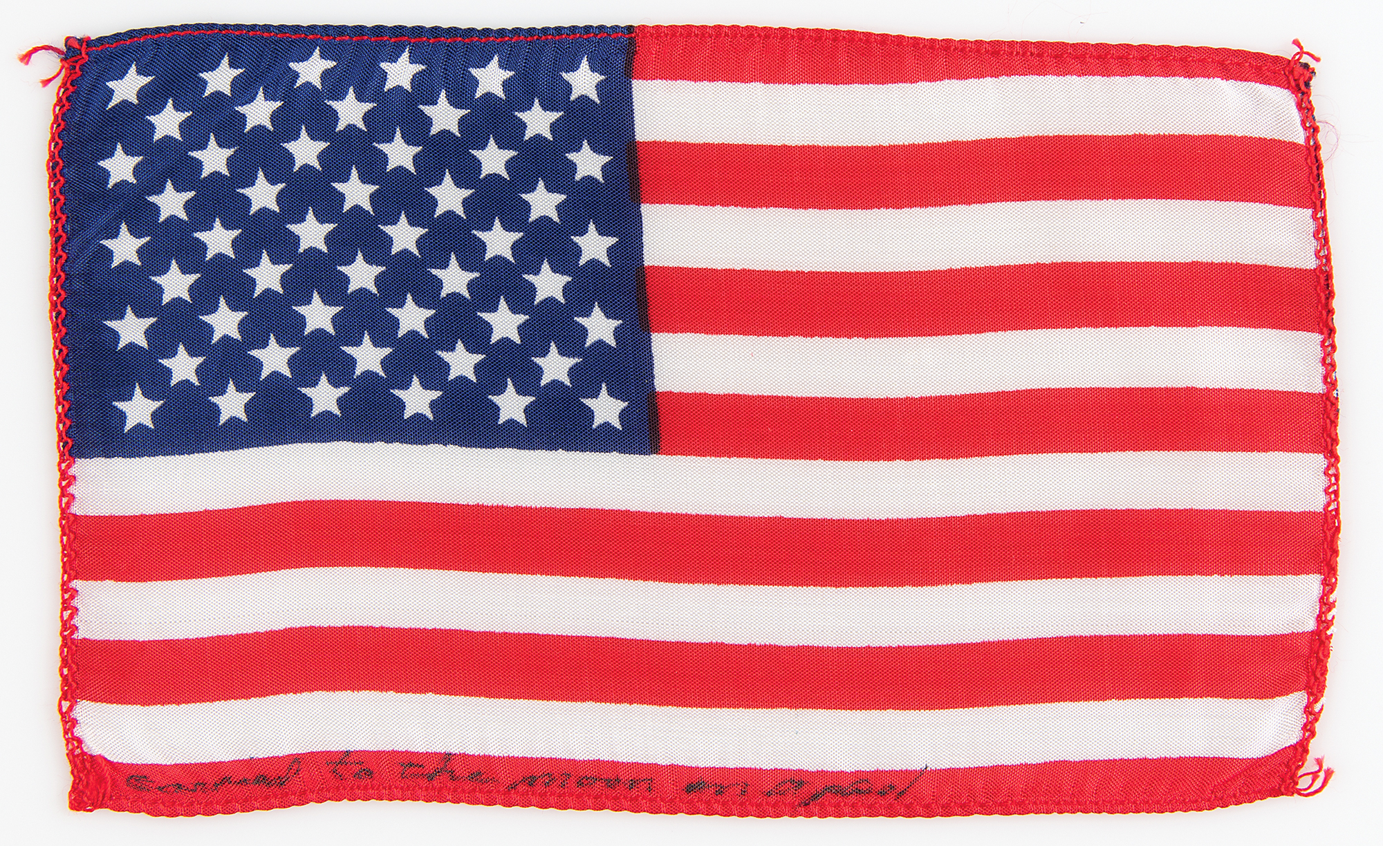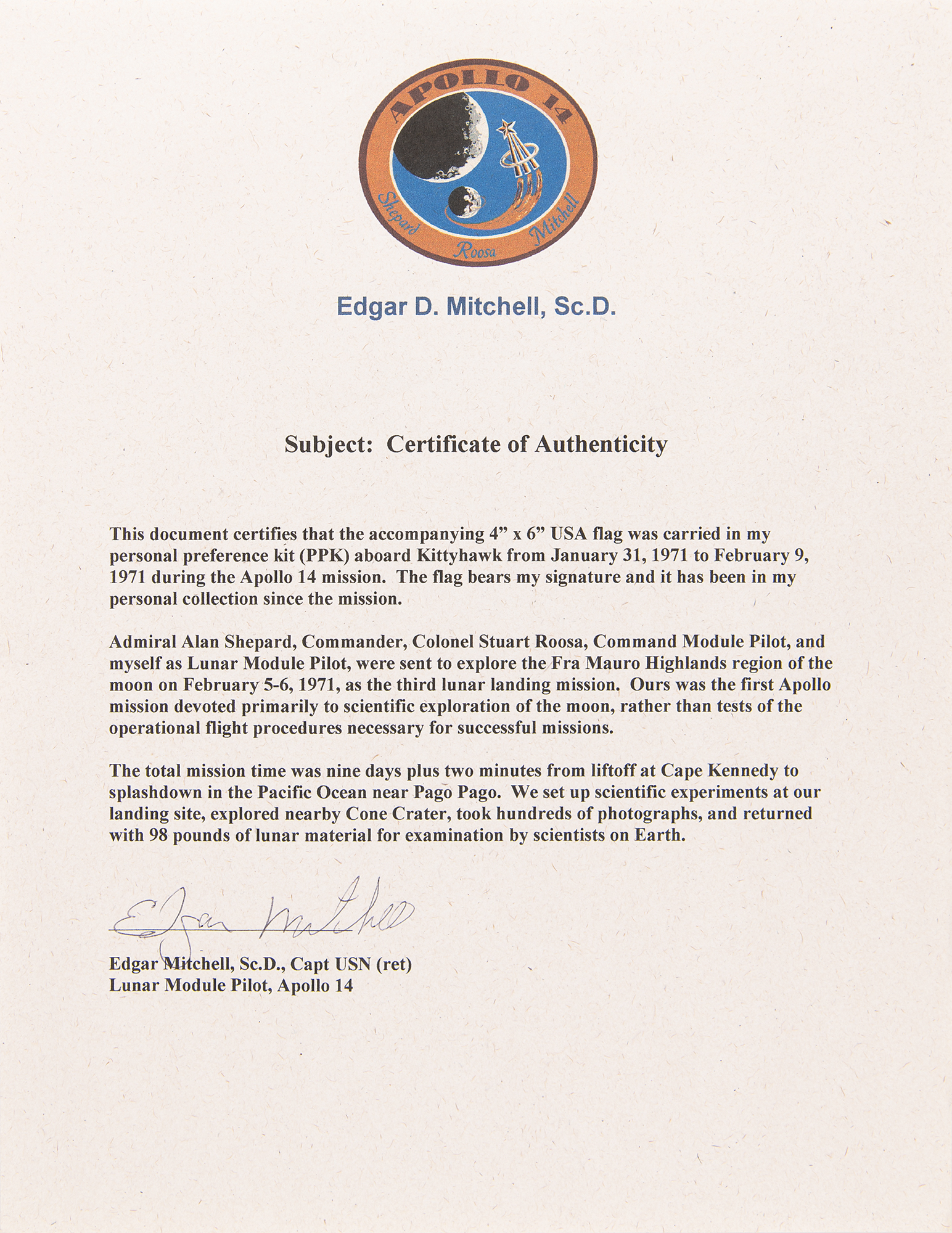 From the personal collection of Apollo 14 moonwalker Edgar Mitchell—a flown 6.25˝ x 4˝ American flag carried into lunar orbit on Apollo 14, flight-certified along the bottom in black felt tip, "Carried to the moon on Apollo," and attested to in a certificate of authenticity signed by Mitchell, who writes that this "USA flag was carried in my personal preference kit (PPK) aboard Kittyhawk from January 31, 1971 to February 9, 1971 during the Apollo 14 mission." It seems that Mitchell did not finish preparing these flown flag presentations prior to his passing, as the certificate erroneously states that the flag bears his signature; it is one of several such examples originating directly from his personal collection. In fine condition.