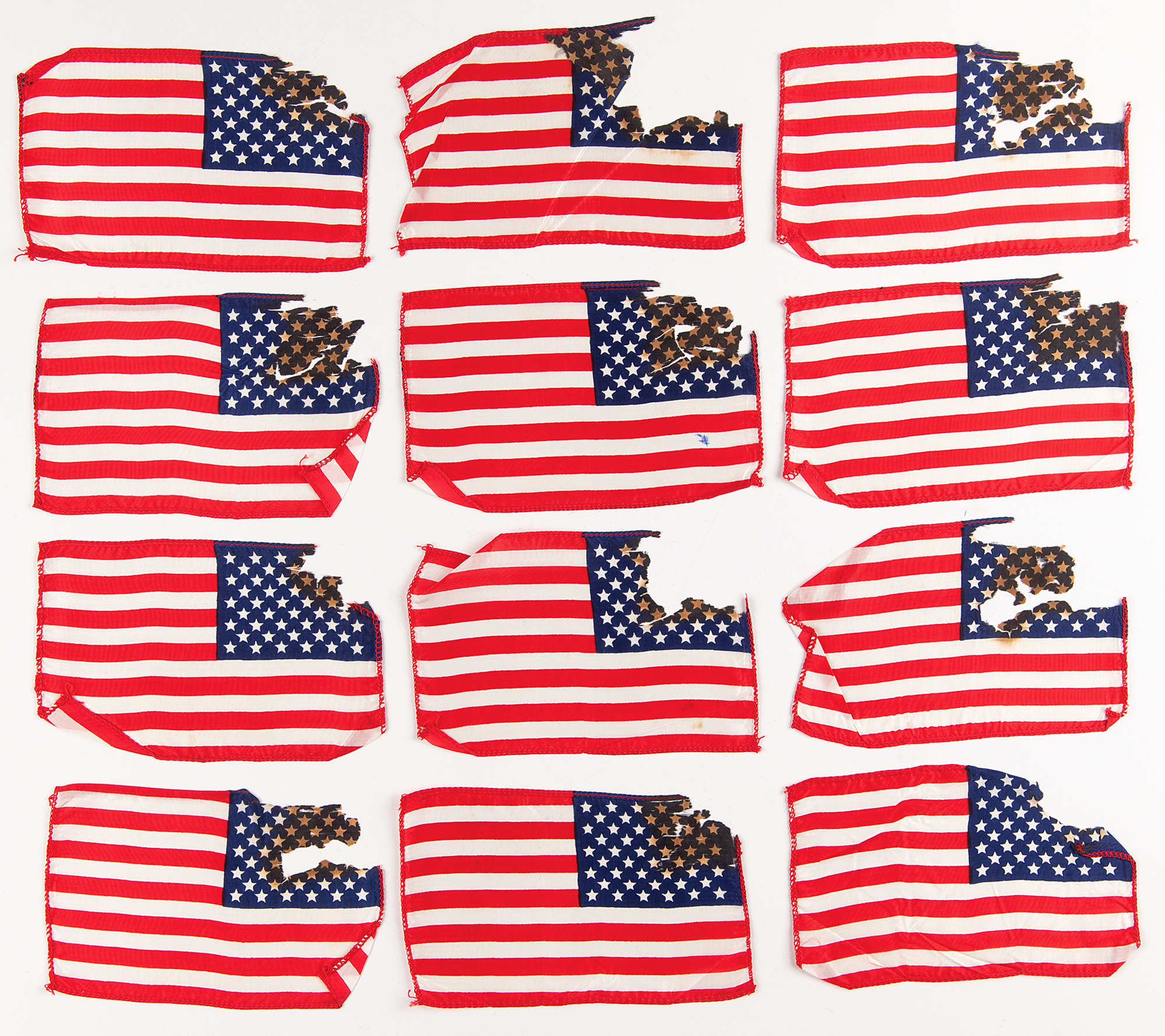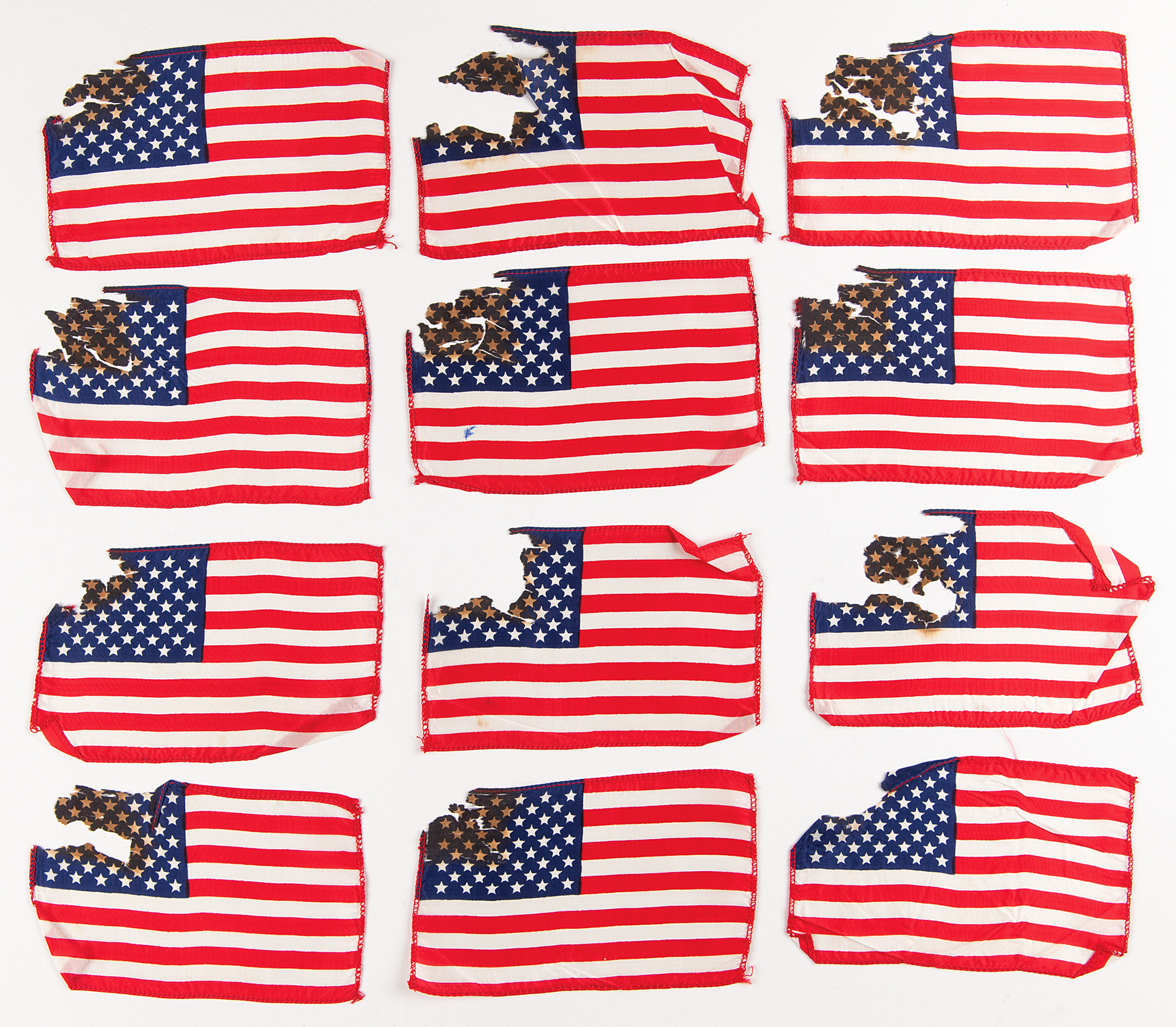 From the personal collection of Apollo 14 moonwalker Edgar Mitchell—a group of 12 flown 6.25˝ x 4˝ American flags attested as carried into lunar orbit on Apollo 14, all exhibiting varying degrees of damage and degradation to the blue union (or canton) at upper left. The lot is accompanied by a lengthy report by McCrone Associates, Inc., prepared at the request of James Ferrigan, curator of The Flag Center, Santa Cruz, California, on Mitchell's behalf, in part: "On 25 November 2008, we received a 4˝ x 6˝ American flag which had been carried on the Apollo 14 moon mission. The flag showed severe degradation, and you requested that we analyze the flag to attempt to determine the cause…A significant amount of material in the blue union was missing, and the remaining areas had ragged edges." Following examination using scanning electron microscopy with energy dispersive X-ray spectrometry, they found evidence of alum salt which might have caused long term acidic degradation. Complete with an appendix that includes ultra close-up images of the flag and technical results from the analysis.