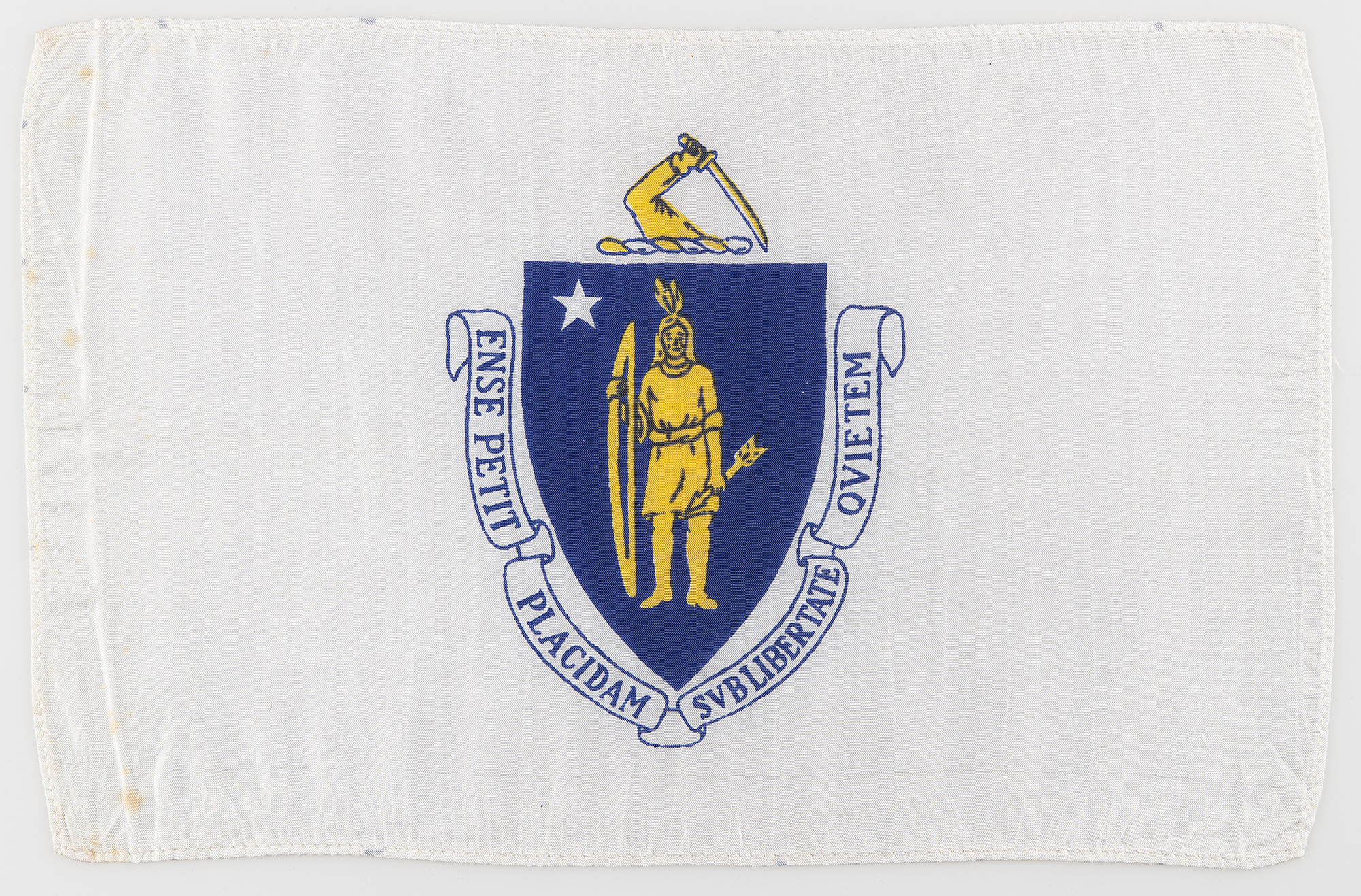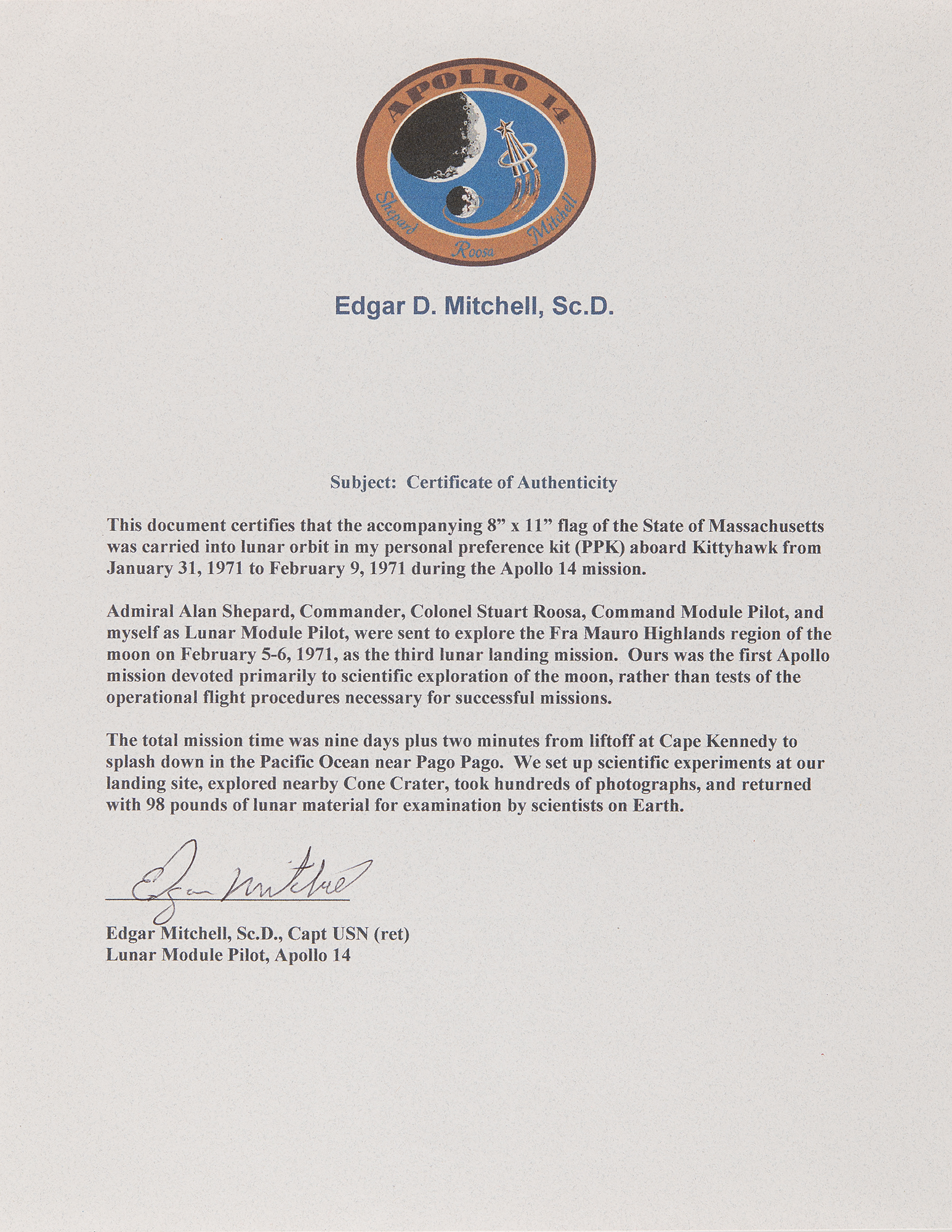 From the personal collection of Apollo 14 moonwalker Edgar Mitchell—a scarce medium-size flag of the Commonwealth of Massachusetts carried into lunar orbit on Apollo 14, 11.75˝ x 7.5˝, attested to in a certificate of authenticity signed by Mitchell, who writes that this "flag of the State of Massachusetts was carried into lunar orbit in my personal preference kit (PPK) aboard Kittyhawk from January 31, 1971 to February 9, 1971 during the Apollo 14 mission." In fine condition, with a bit of foxing to one edge.