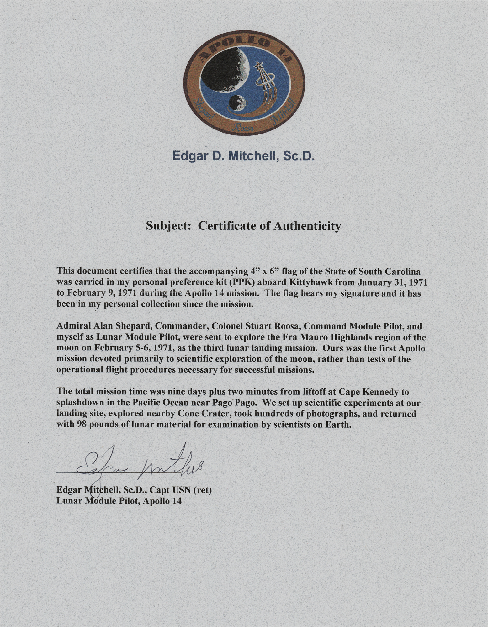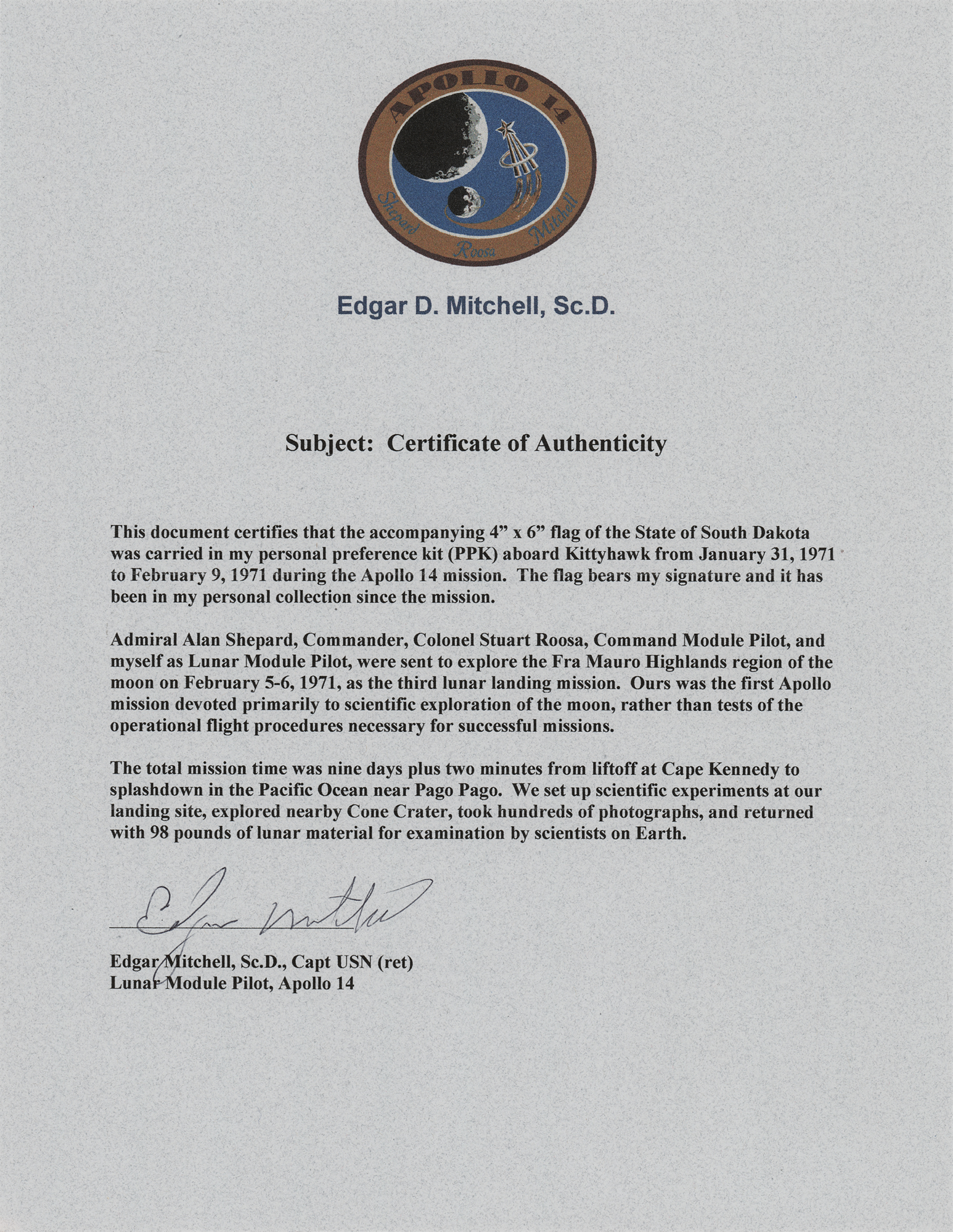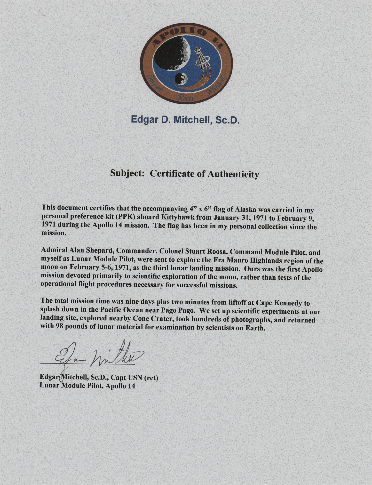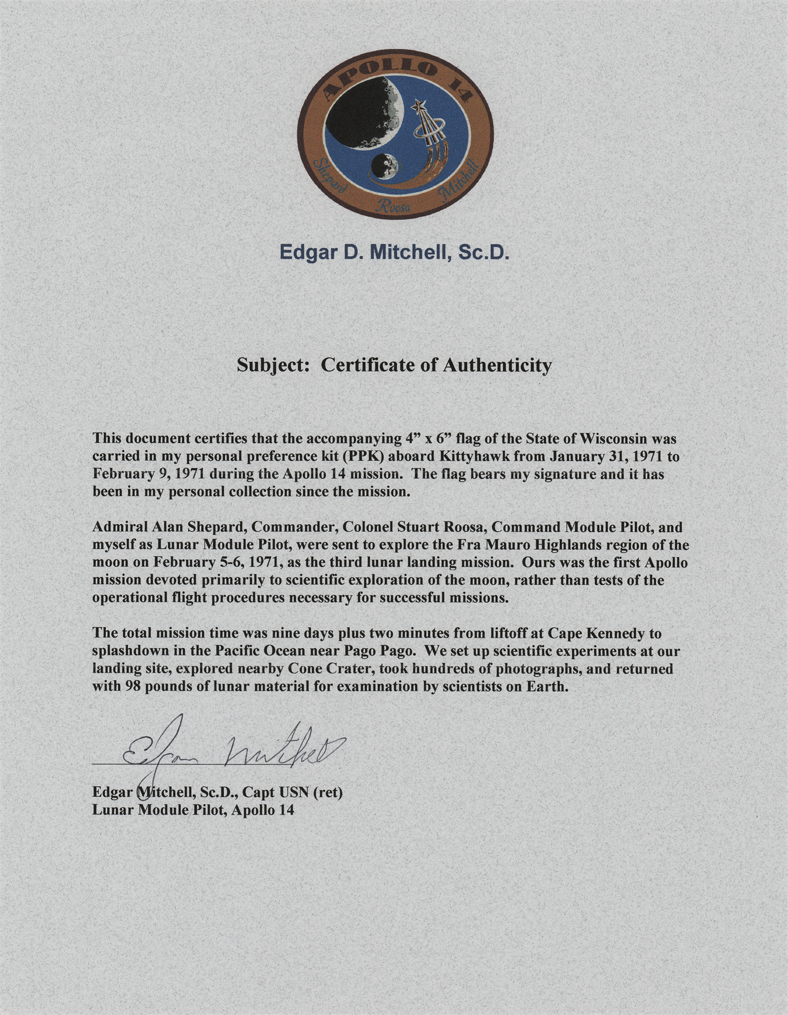 Accompanied by a letter of authenticity from Karlyn Mitchell, the daughter of Edgar Mitchell.