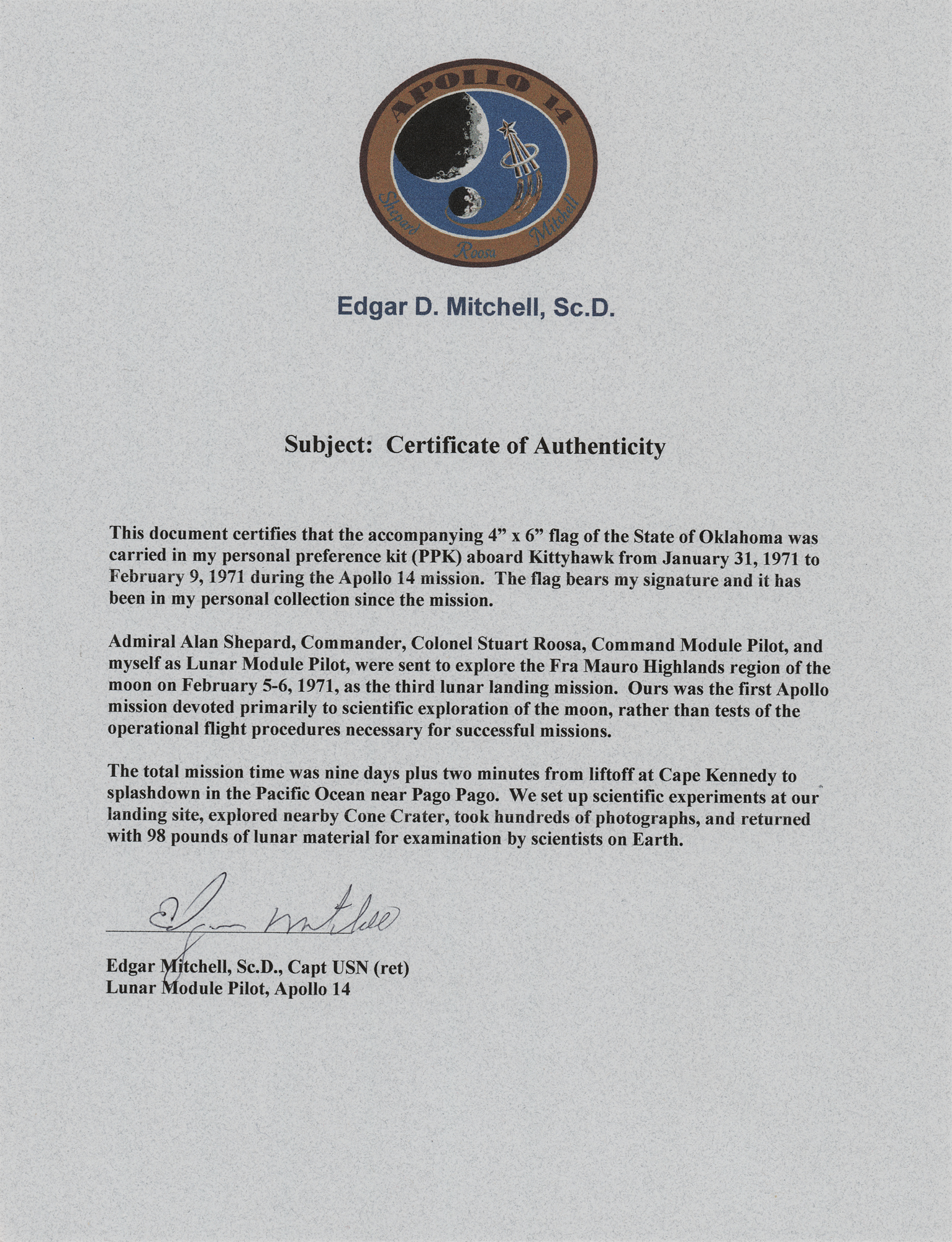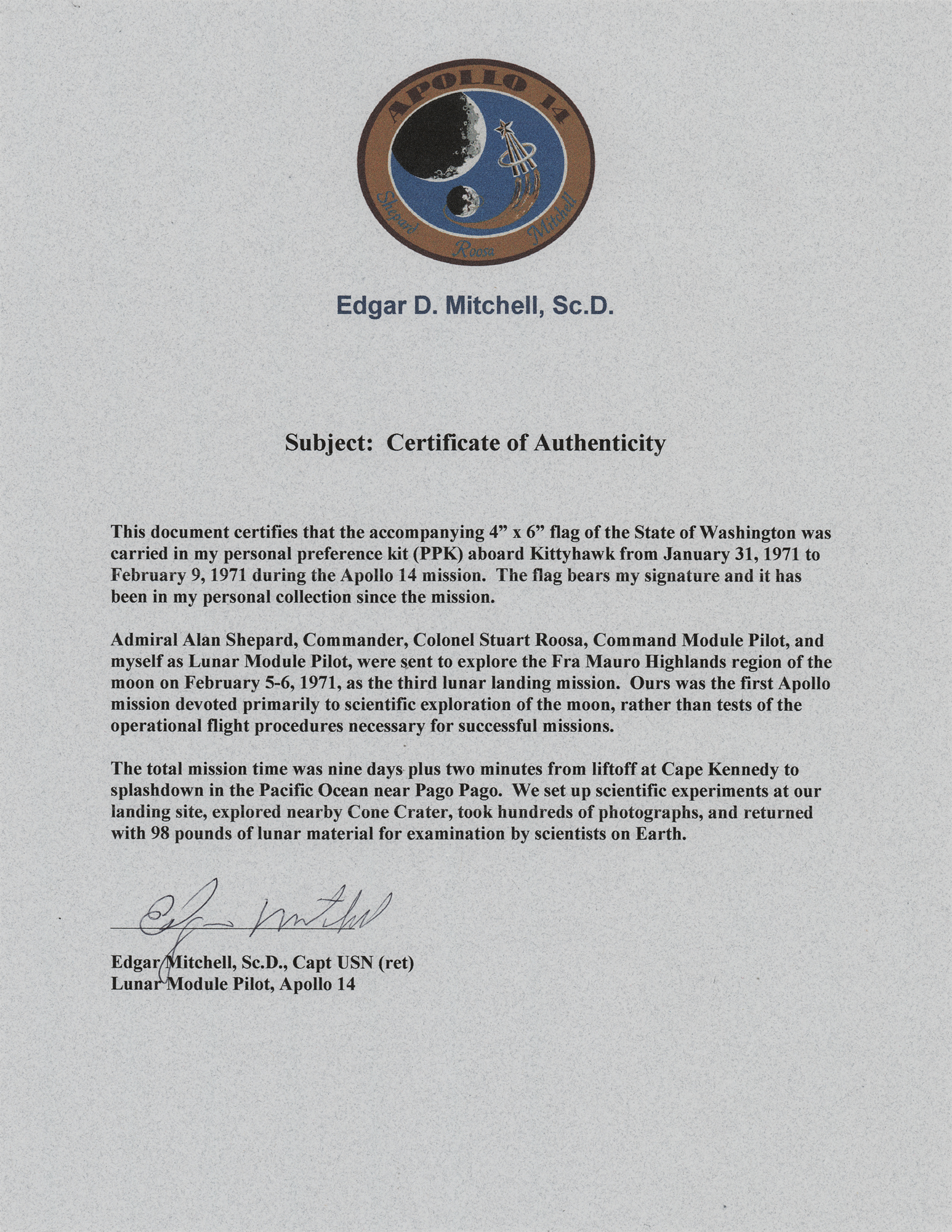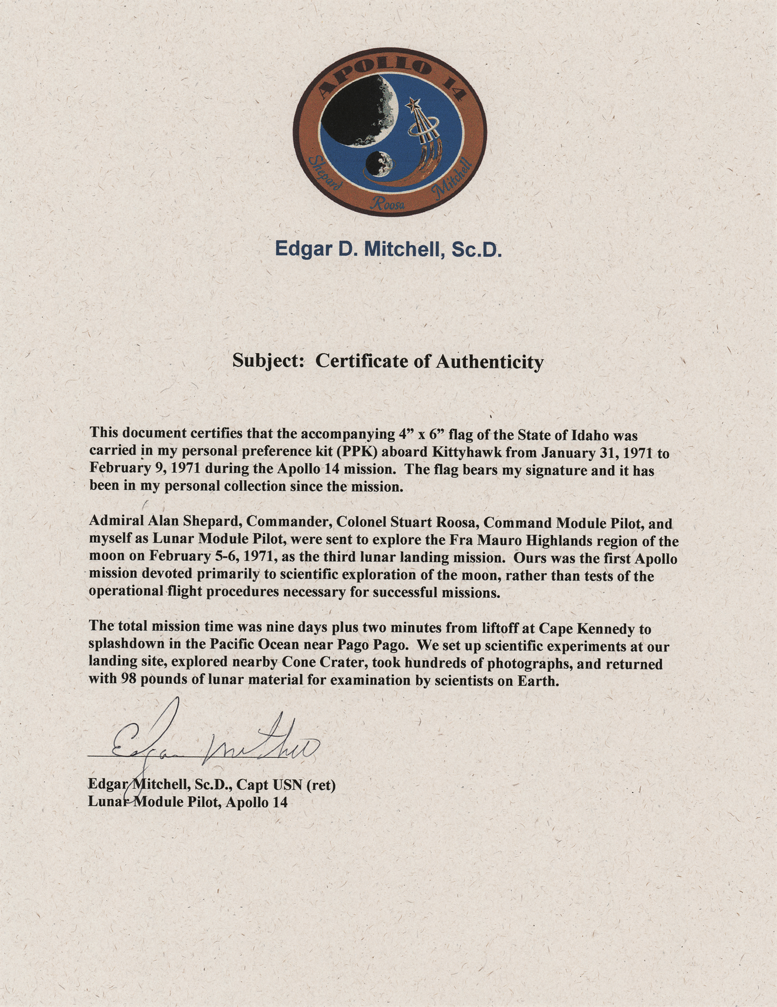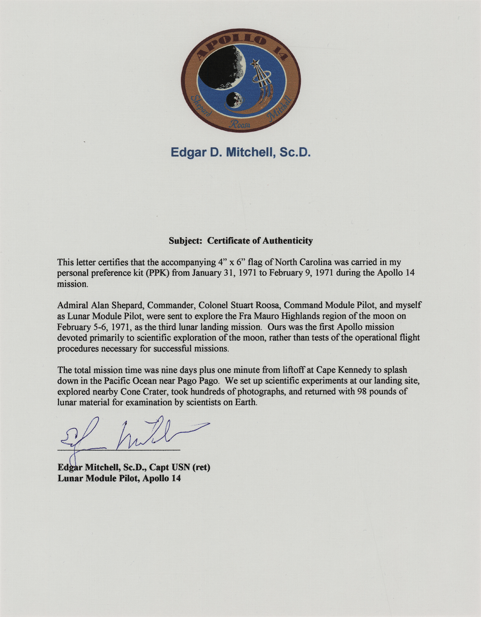 Accompanied by a letter of authenticity from Karlyn Mitchell, the daughter of Edgar Mitchell.
