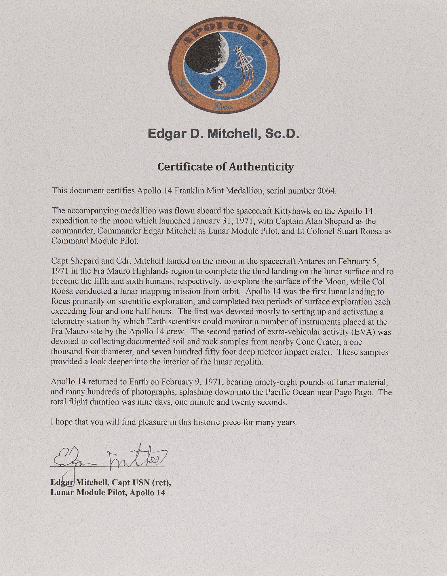 Accompanied by a letter of authenticity signed by Edgar Mitchell, in part: "This document certifies Apollo 14 Franklin Mint Medallion, serial number 0064. The accompanying medallion was flown aboard the spacecraft Kittyhawk on the Apollo 14 expedition to the moon which launched January 31, 1971."