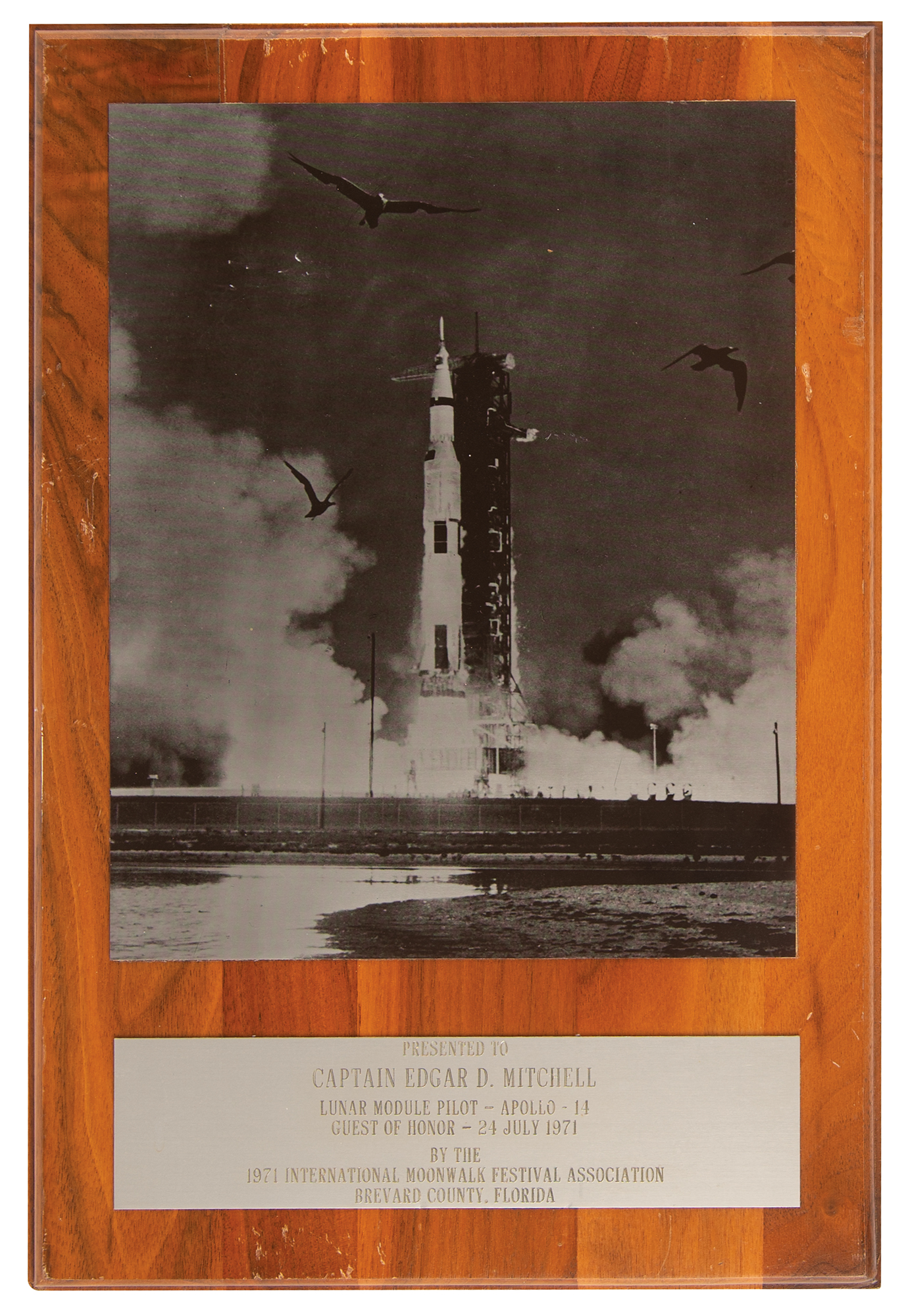 Plaque presented to Edgar Mitchell as an honored guest of the 1971 International Moonwalk Festival, 10˝ x 15˝, featuring a metallic image of the Saturn V blasting off, and an engraved plate below: "Presented to Captain Edgar D. Mitchell, Lunar Module Pilot - Apollo 14, Guest of Honor - 24 July 1971, By the 1971 International Moonwalk Festival Association, Brevard County, Florida." In very good to fine condition, with a bit of surface scuffing to the image.