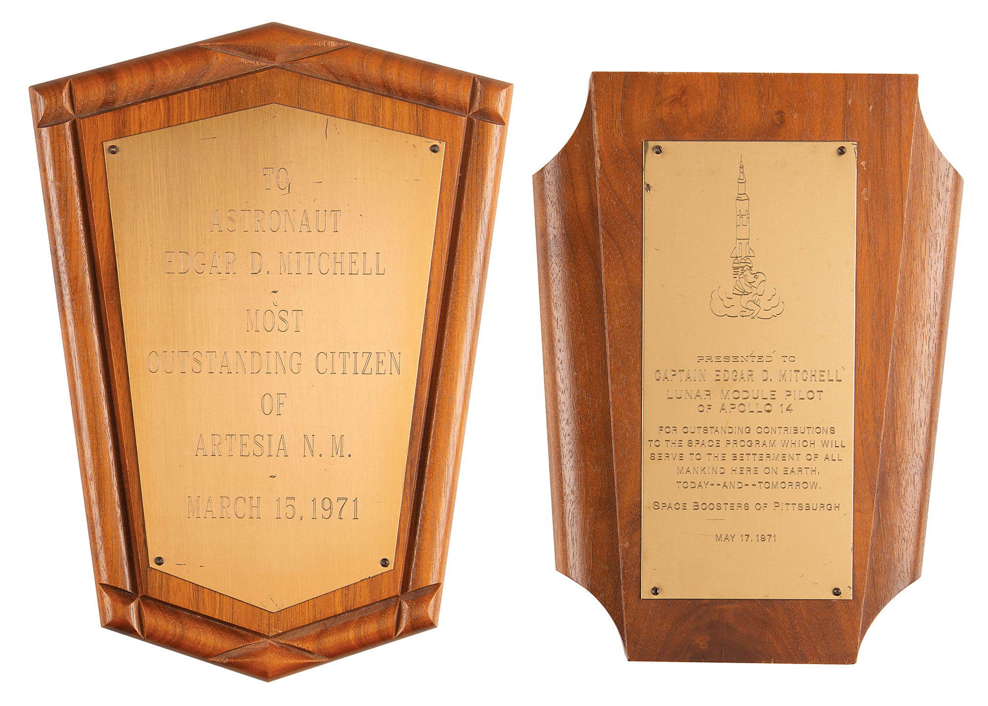 Two award plaques from the personal collection of Apollo 14 moonwalker Edgar Mitchell—a 6.75 x 9 plaque with an engraved plate depicting the Saturn V launch vehicle, "Presented to Captain Edgar D. Mitchell, Lunar Module Pilot of Apollo 14, for outstanding contributions to the space program which will serve to the betterment of all mankind here on Earth, today—and—tomorrow. Space Boosters of Pittsburgh, May 17, 1971"; and a 7.5 x 10 plaque with an engraved plate, "To Astronaut Edgar D. Mitchell, Most Outstanding Citizen of Artesia N.M., March 15, 1971." In overall fine condition.