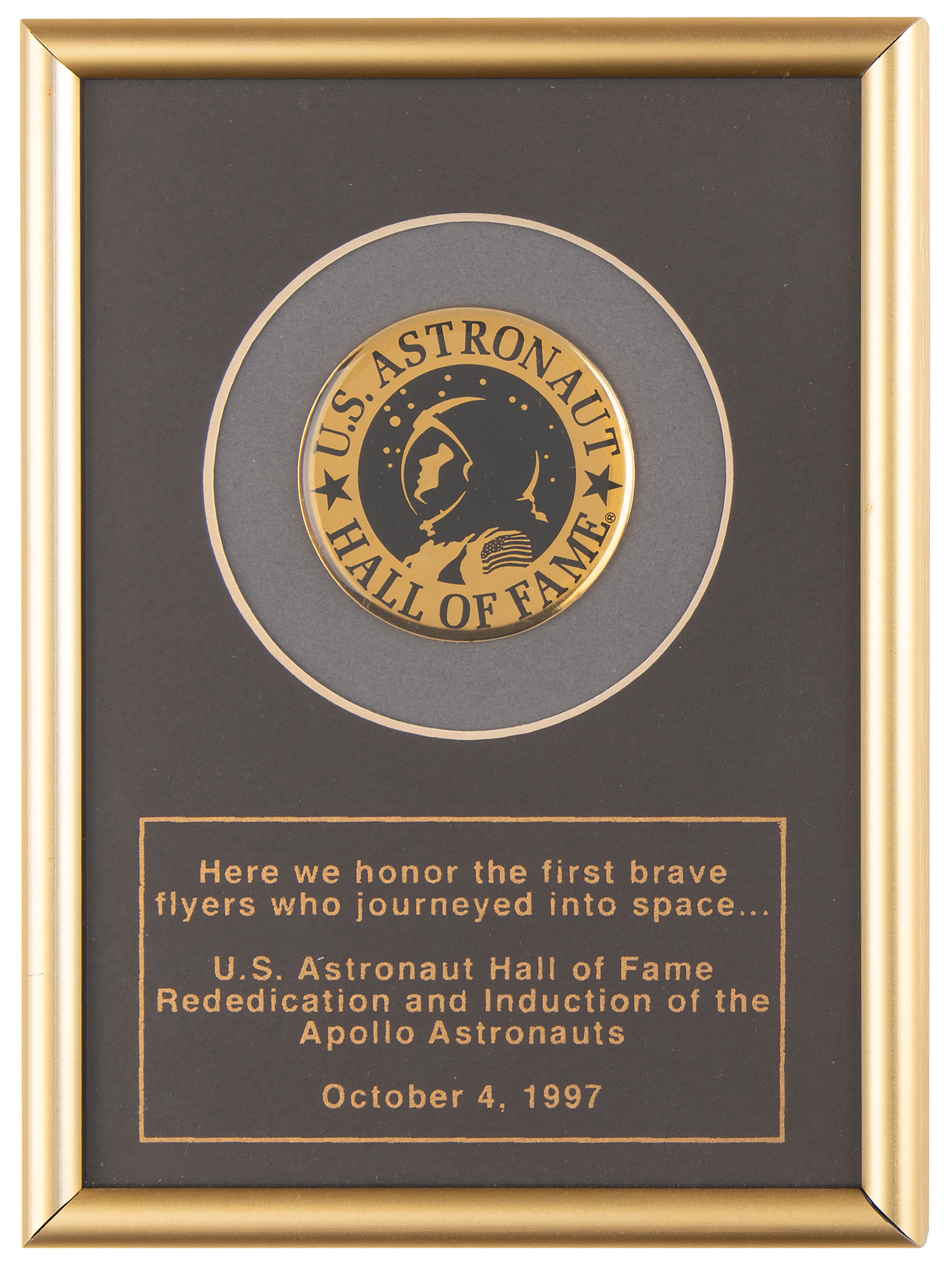 From the personal collection of Apollo 14 moonwalker Edgar Mitchell—an attractive U.S. Astronaut Hall of Fame plaque presented to Mitchell upon his induction on October 4, 1997, 5.5 x 7.5, featuring a golden "U.S. Astronaut Hall of Fame" medallion with text below: "Here we honor the first brave flyers who journeyed into space… U.S. Astronaut Hall of Fame Rededication and Induction of the Apollo Astronauts, October 4, 1997." In fine condition.