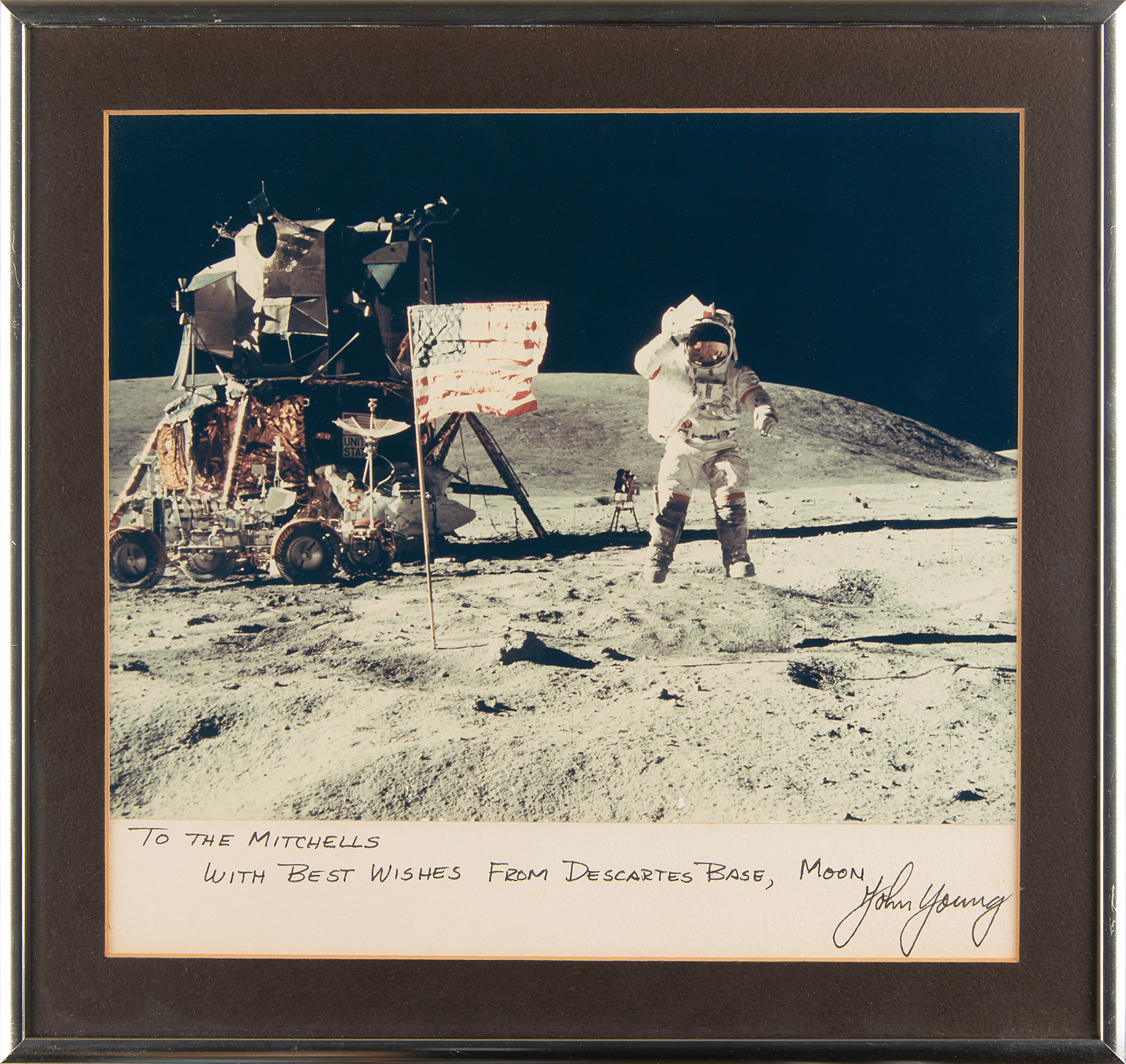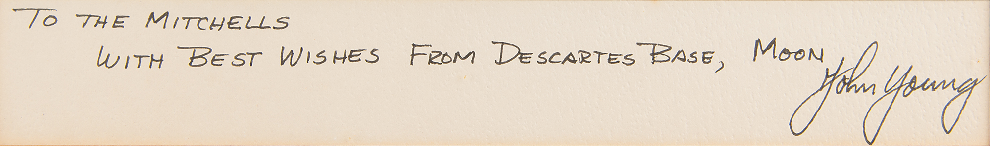 Color glossy 9.5 x 7.5 photo of John Young saluting the American flag on the lunar surface during Apollo 16, affixed to its original 9.5 x 9 mount, signed and inscribed on the mount in black felt tip, "To the Mitchells, With Best Wishes from Descartes Base, Moon, John Young.” Matted and framed to an overall size of 11.75 x 11. In fine condition. A fantastic association piece, presented by one moonwalker to another.
