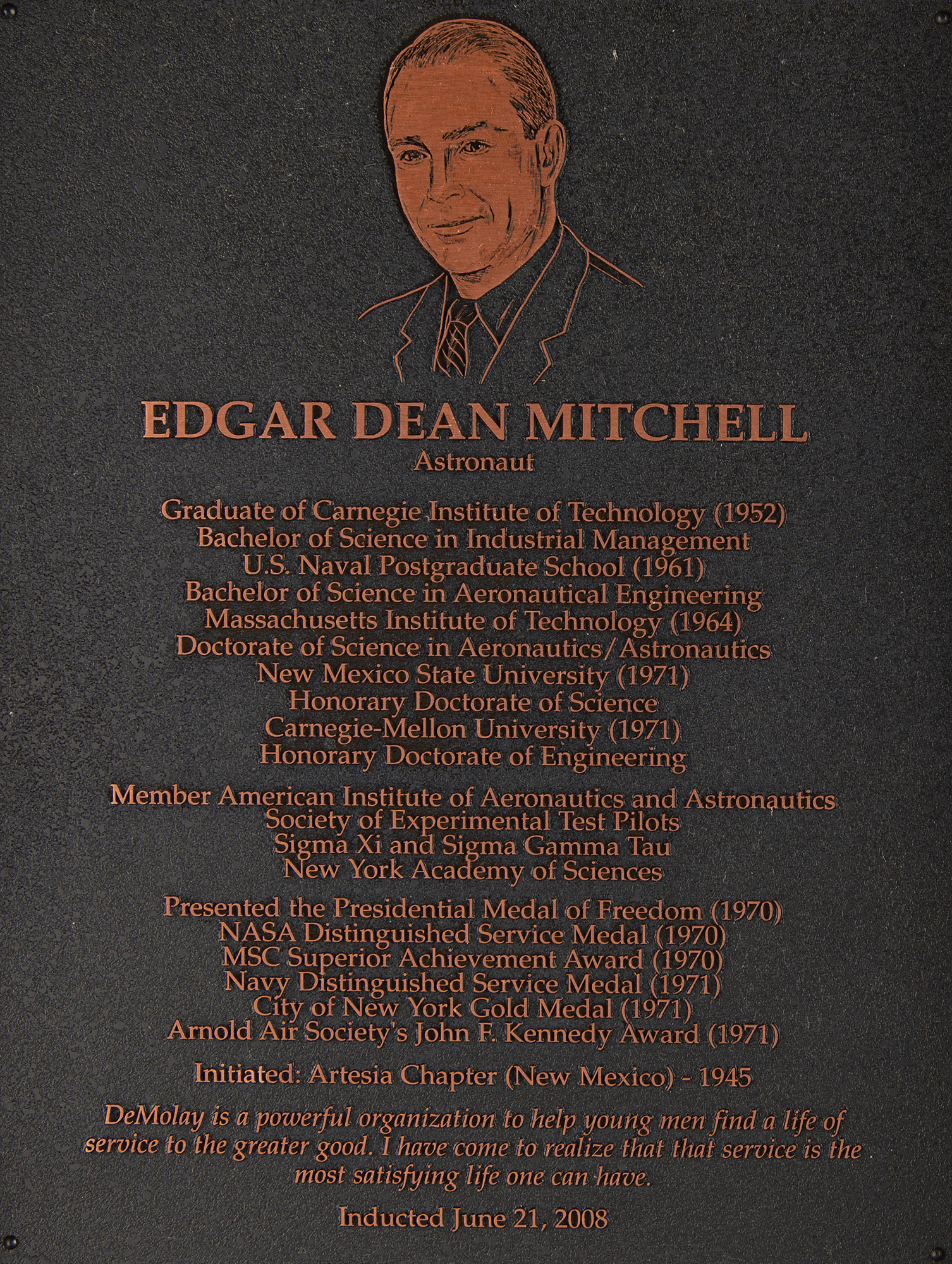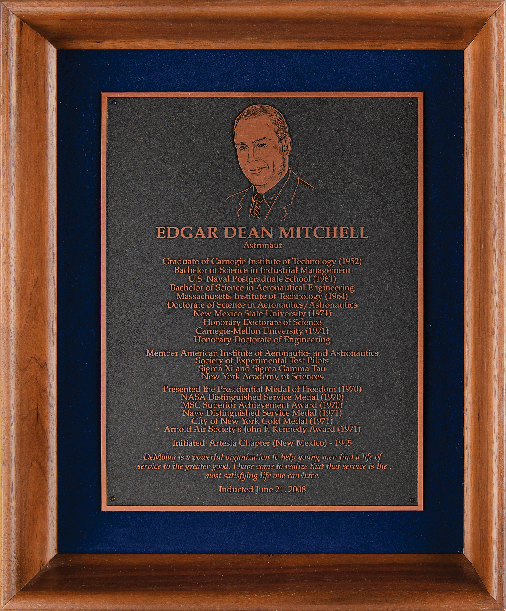 Hall of Fame induction plaque awarded to Edgar Mitchell by the Masonic organization DeMolay International, 10 x 12, featuring a portrait of the astronaut and a lengthy list of his accomplishments, with his his DeMolay bona fides and a quote about the group at the bottom: "Initiated: Artesia Chapter (New Mexico) - 1945, 'DeMolay is a powerful organization to help young men find a life of service to the greater good. I have come to realize that that service is the most satisfying life one can have,' Inducted June 21, 2008." In fine condition.