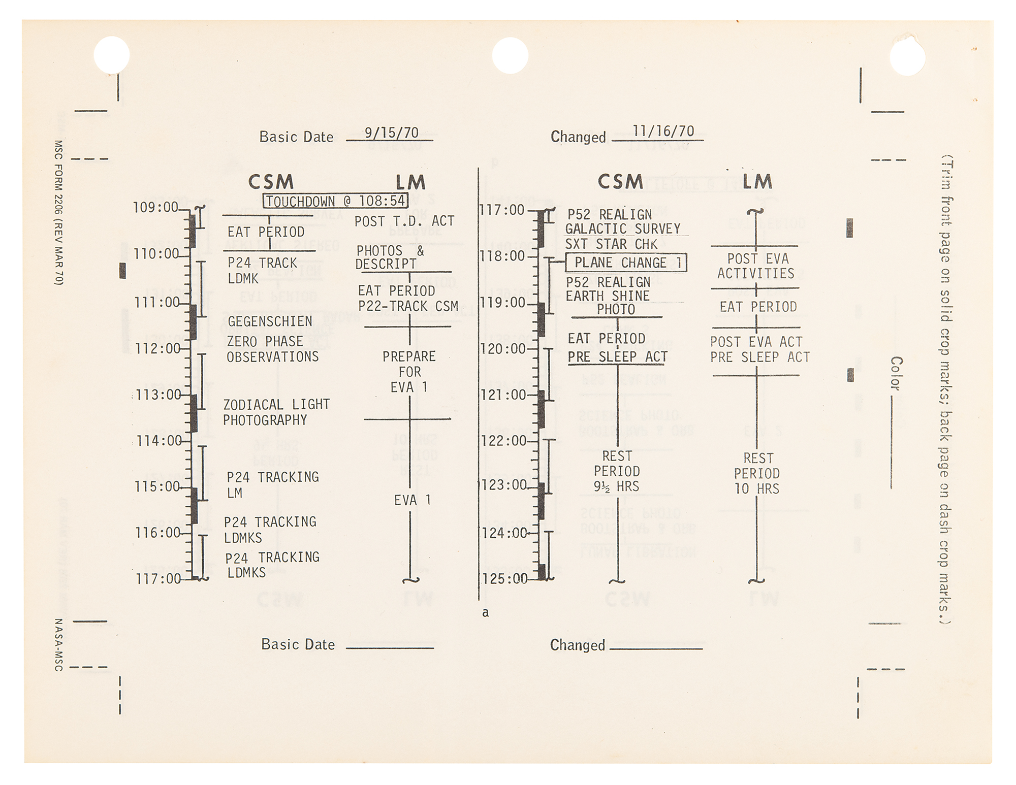 Bracket-bound official "Apollo 14, LM-8, Revision A, LM Lunar Surface Checklist" prepared by EVA Procedures Section, Flight Crew Support Division at the Manned Spacecraft Center, 9 x 11.5, November 16, 1970, with the front binder cover stamped, "Provenance: The Edgar D. Mitchell Space Collection," and signed along the bottom edge in thick black felt tip, "Edgar D. Mitchell"; also marked "Scott" in the upper right corner. Additionally signed on the title page in blue ballpoint, "Edgar Mitchell." The checklist provides a timeline for Apollo 14's lunar surface activities, beginning with "Touchdown" at 108:54 MET, substantial details about EVA activities, small diagrams of the lunar terrain to be explored, and some contingency plans. In fine condition, with edge toning to the binder and a bit of foxing to the title sheet.