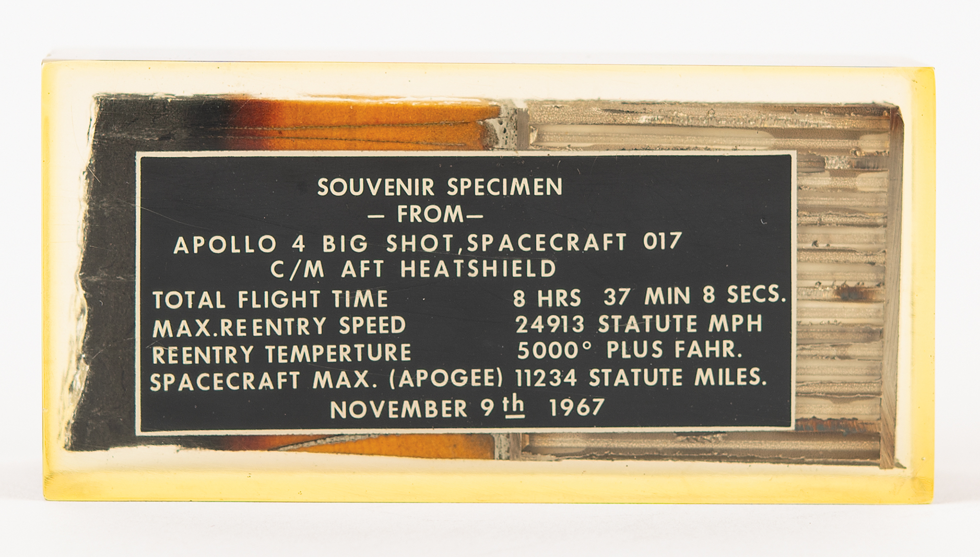 Apollo 4 Flown Heatshield Slice in Lucite - From the Personal Collection of Edgar Mitchell