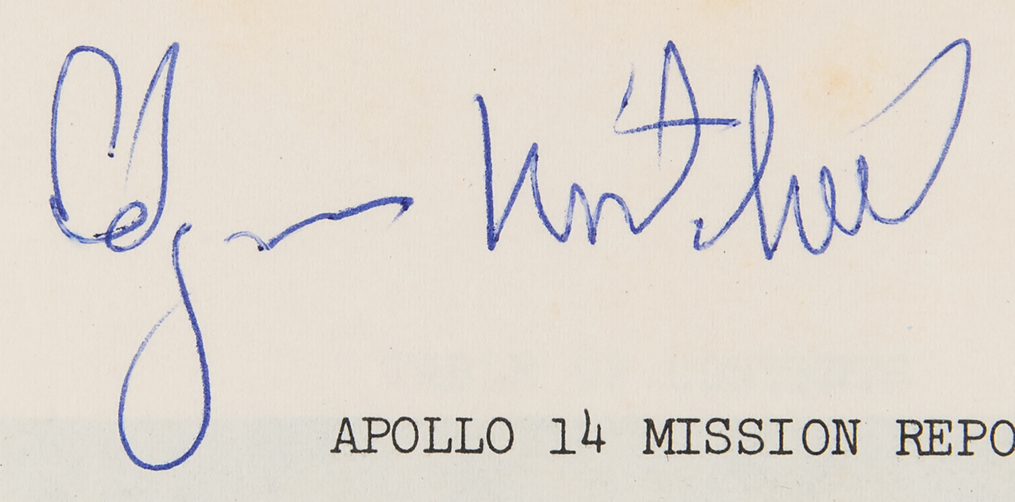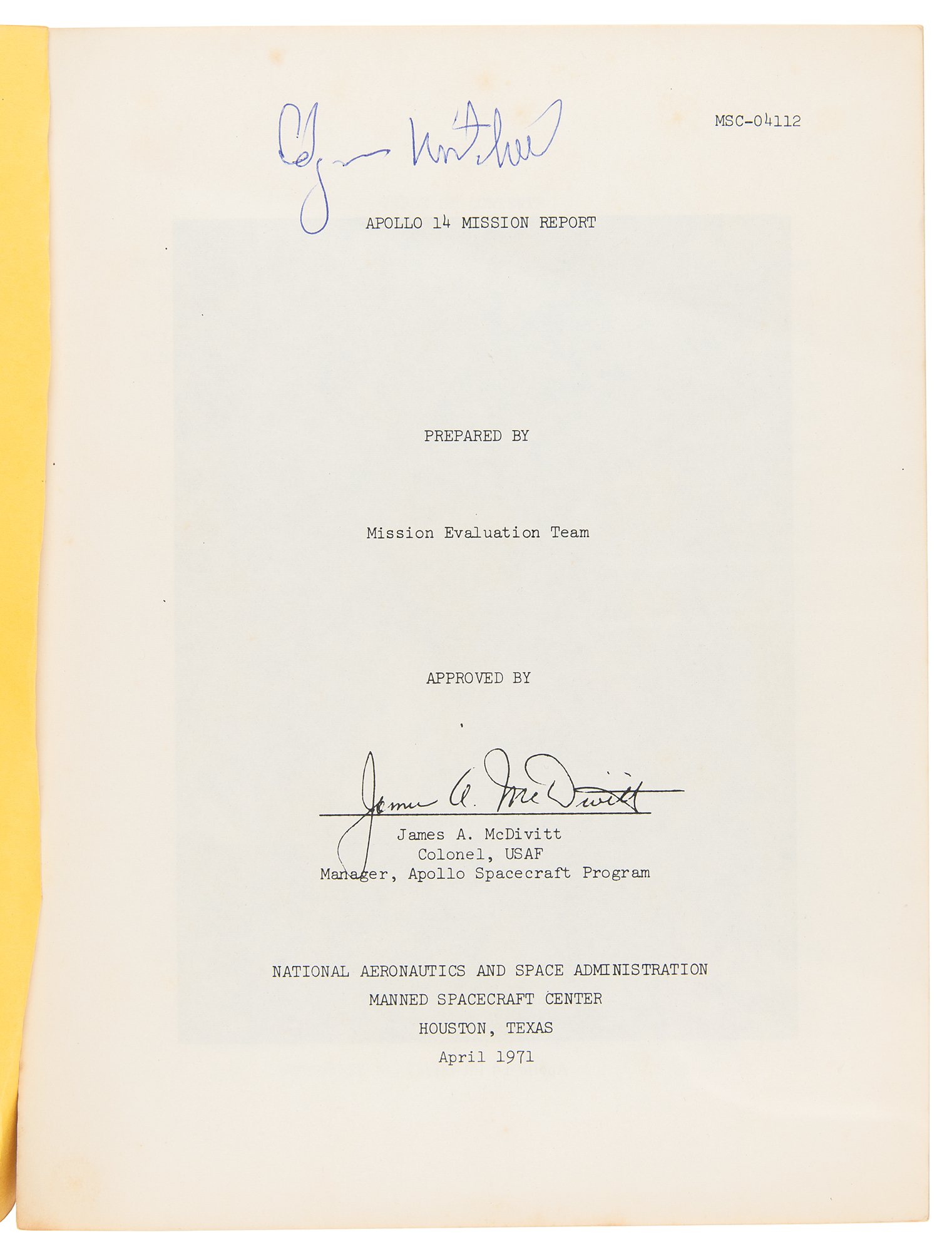 Staple-bound official Apollo 14 Mission Report (MSC-04112) published by NASA's Manned Spacecraft Center, 8 x 10.5, May 1971, with the front cover stamped, "Provenance: The Edgar D. Mitchell Space Collection," and signed along the bottom edge in thick black felt tip, "Edgar Mitchell"; also marked "Scott" in the upper right corner. Additionally signed on the title page in blue ballpoint, "Edgar Mitchell." The report offers numerous charts, summaries, and images associated with Apollo 14's "Lunar Surface Experiments," "Lunar Orbital Experiments," "Inflight Demonstrations," "Trajectory," "Command and Service Module Performance," "Lunar Module Performance," "Pilot's Report," "Biomedical Evaluation," "Mission Support Performance," "Assessment of Mission Objectives," "Launch Phase Summary," and "Anomaly Summary." In fine condition.