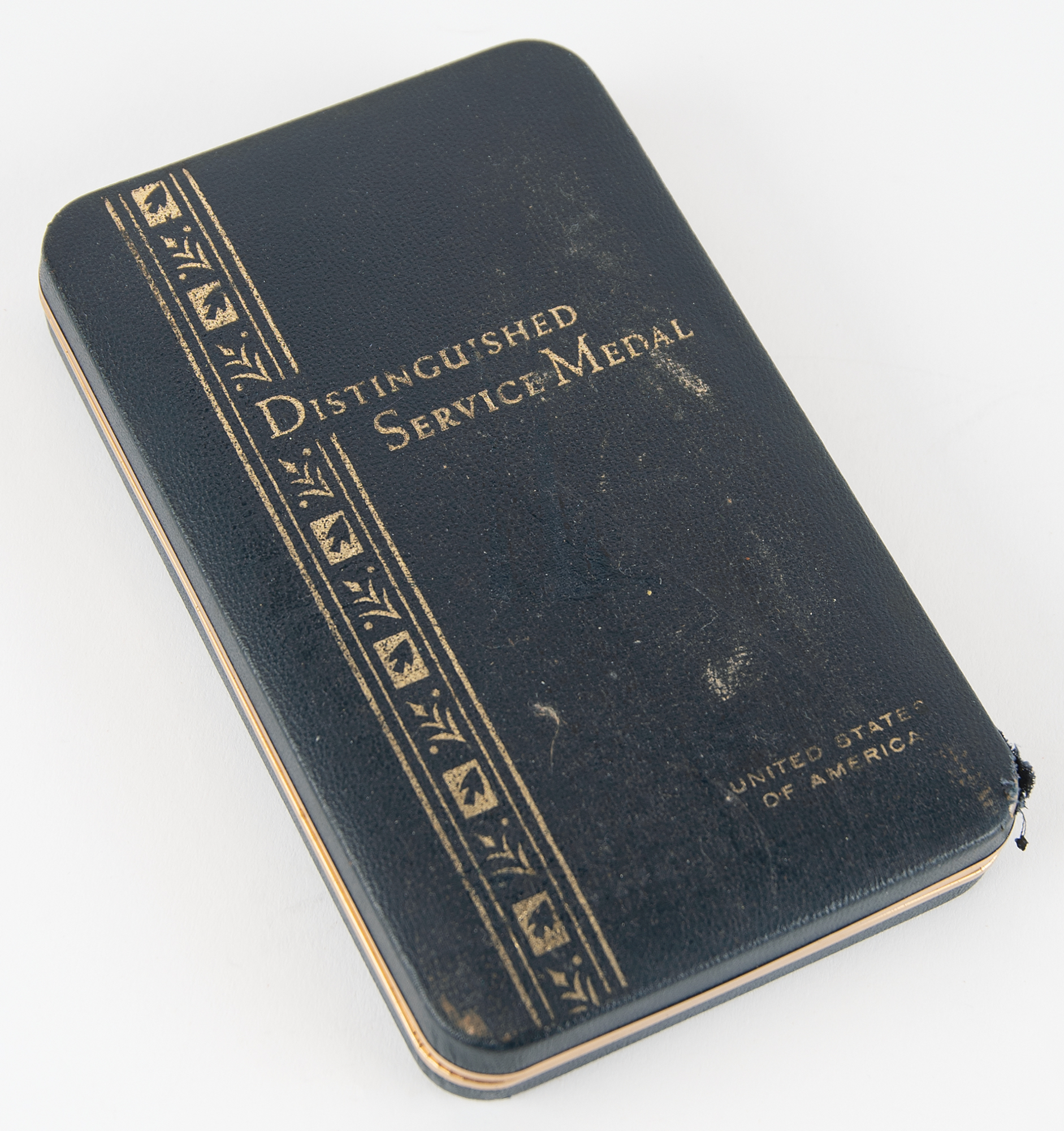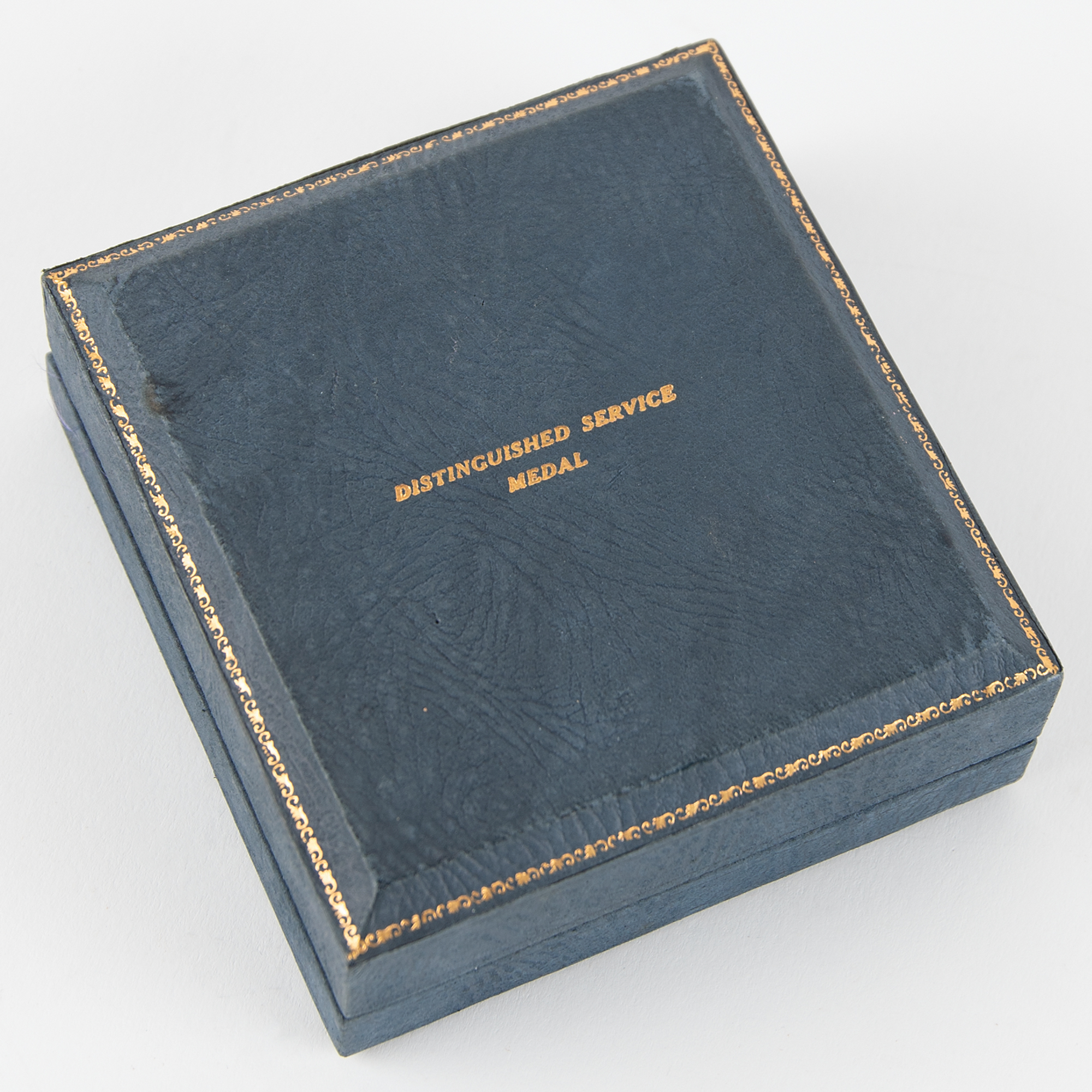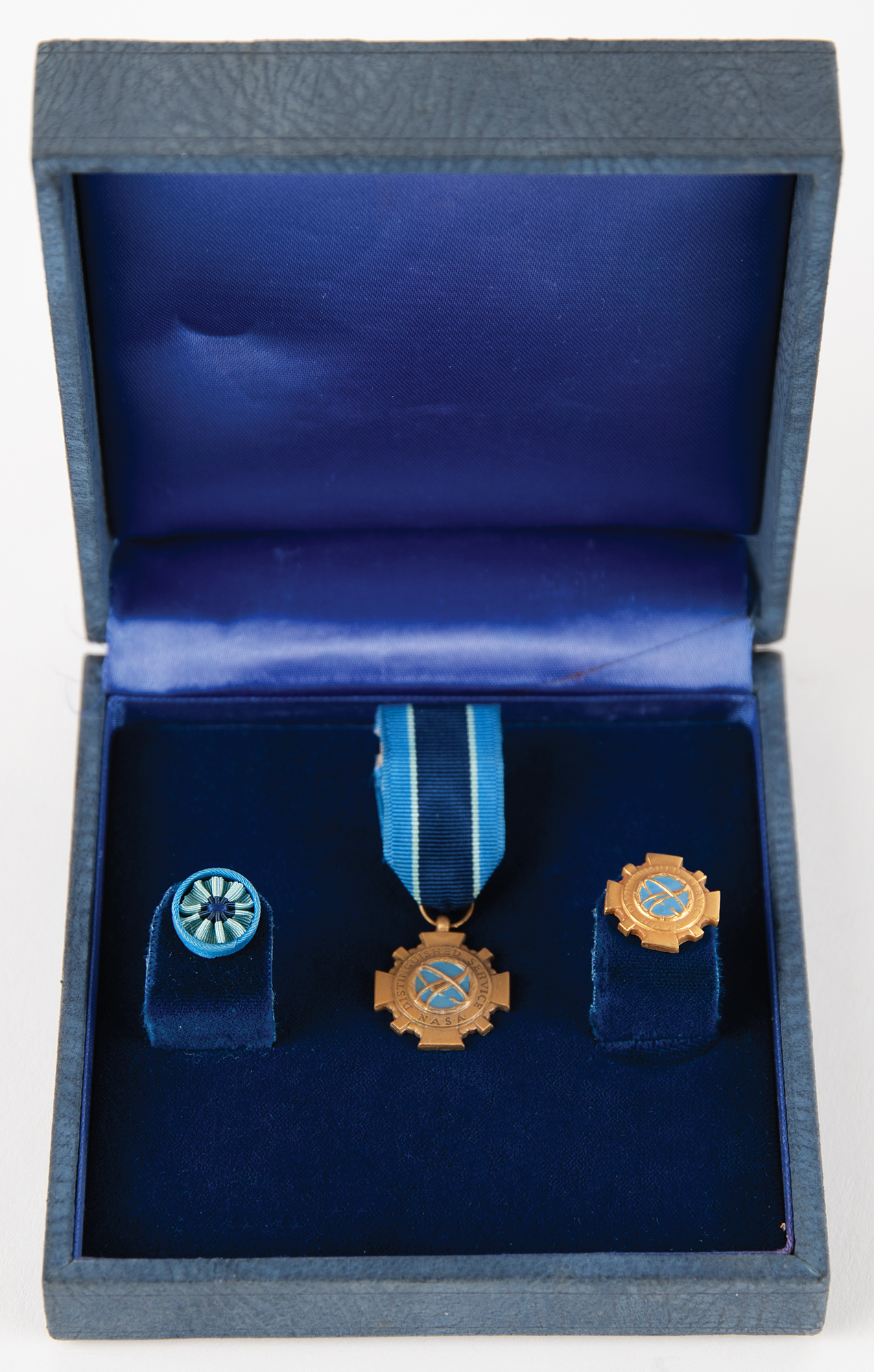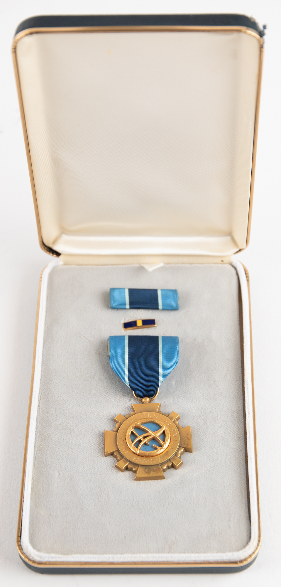 NASA Distinguished Service Medal issued to Edgar Mitchell in 1971, measuring 1.75˝ in diameter and suspended from a 1.5˝ long navy-and-teal ribbon pin. The gold-colored medal features an emblem encircled by engraved text, "Distinguished Service, NASA," and is engraved on the reverse with the name of the award's recipient, "Edgar D. Mitchell." The medal is housed in its original presentation box, stamped "Distinguished Service Medal" on the lid, along with its ribbon bar and pin. Additionally includes a smaller version of the medal, with pin and rosette, housed in a separate presentation box.