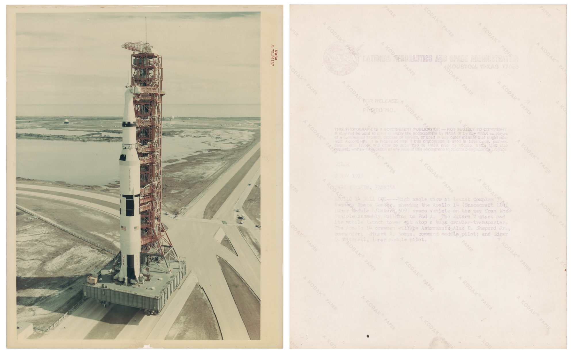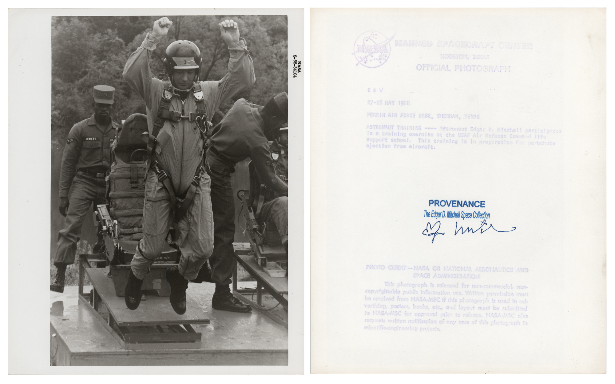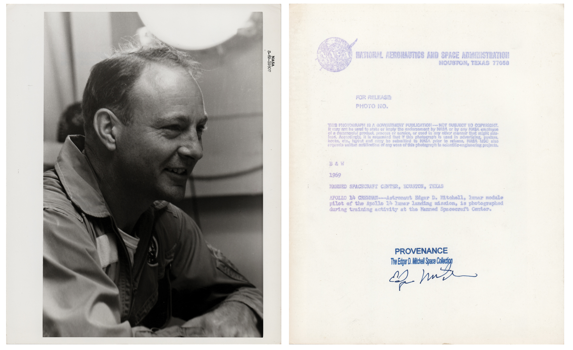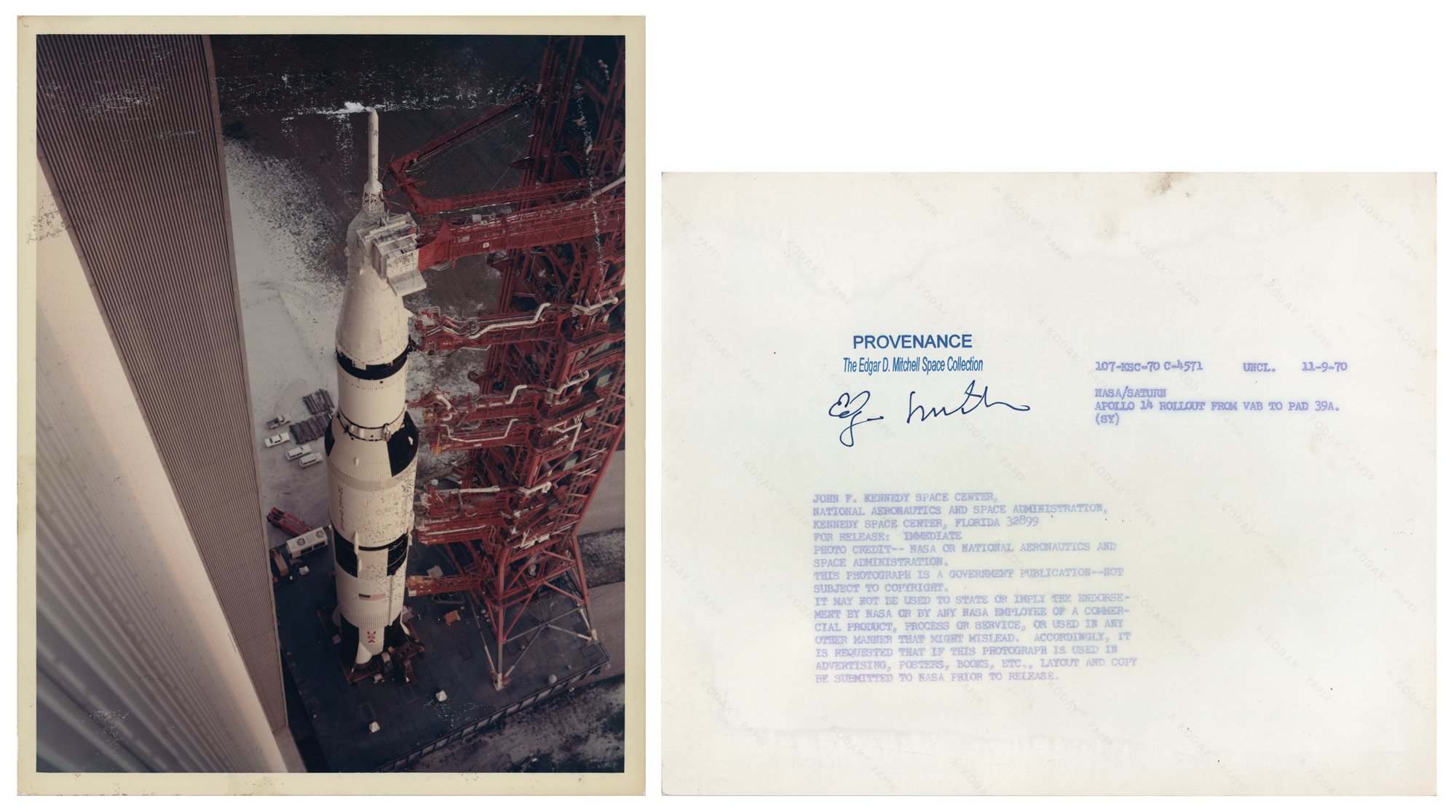 Five original vintage glossy NASA photos from the personal archives of Apollo 14 LMP Edgar Mitchell, 8 x 10 and 10 x 8, with two black-numbered and two red-numbered, each signed on the reverse in blue felt tip, "Edgar D. Mitchell," and stamped in ink, "Provenance: The Edgar D. Mitchell Space Collection." Images include: the Apollo 14 Saturn V rollout from to Pad 39A; a close-up of Mitchell during training at the Manned Spacecraft Center; Mitchell completing a training exercise at the USAF Air Command life support school; Mitchell with a machete during training at the Panama Jungle Survival School; and Mitchell ingressing a Command Module trainer during preparations for water egress training in the Gulf of Mexico.