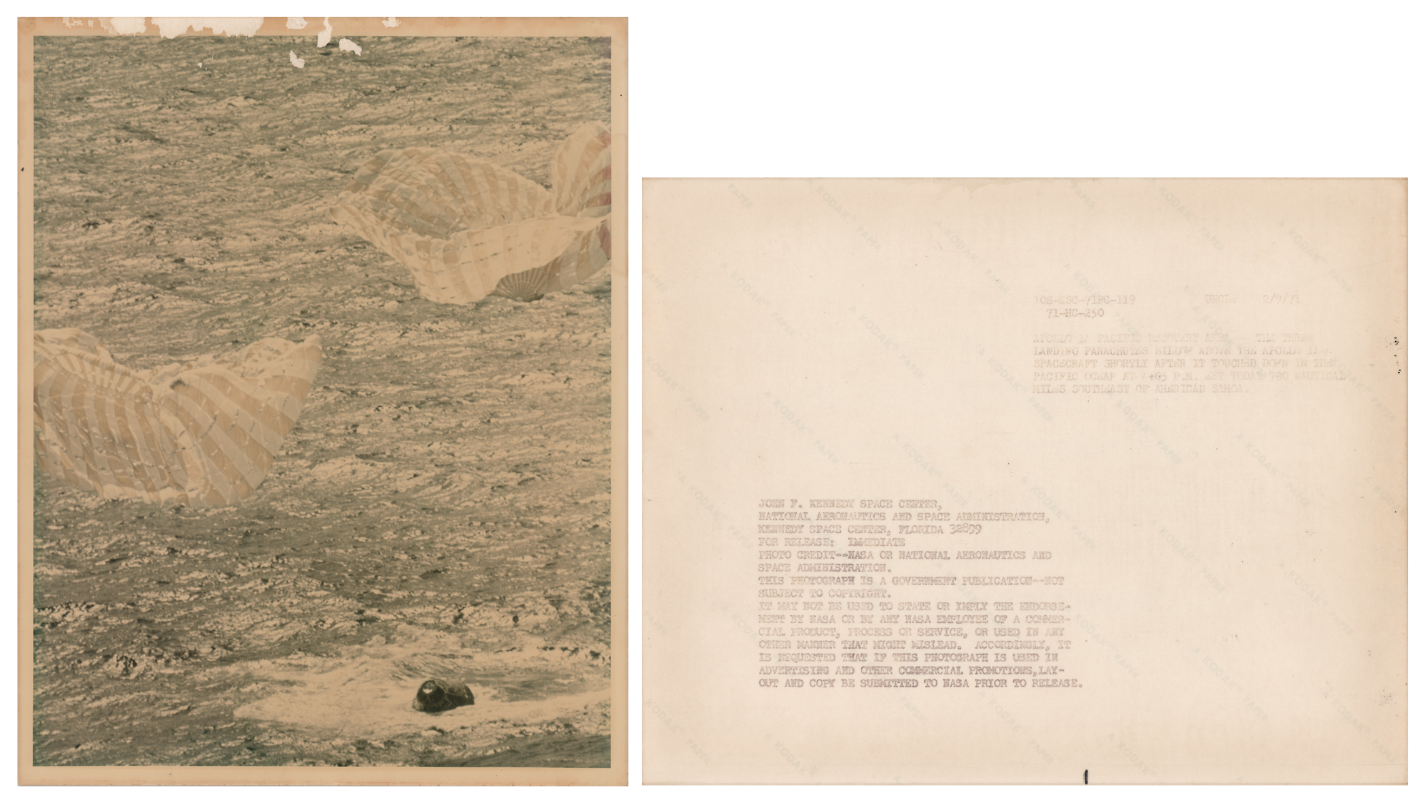 Includes two other NASA photos from Mitchell's collection, unsigned and unstamped, showing the Apollo 14 CM 'Kitty Hawk' with parachutes deployed after splashdown, and a red-numbered photo of the Apollo 14 Saturn V during rollout. All photos bear NASA caption text on the reverse, and the color photos all have "A Kodak Paper" watermarks. In overall very good to fine condition, with surface rubbing to the signed Saturn V photo, unobtrusive surface loss to the corner of the water training photo, and crazing and surface loss to the unsigned splashdown photo.