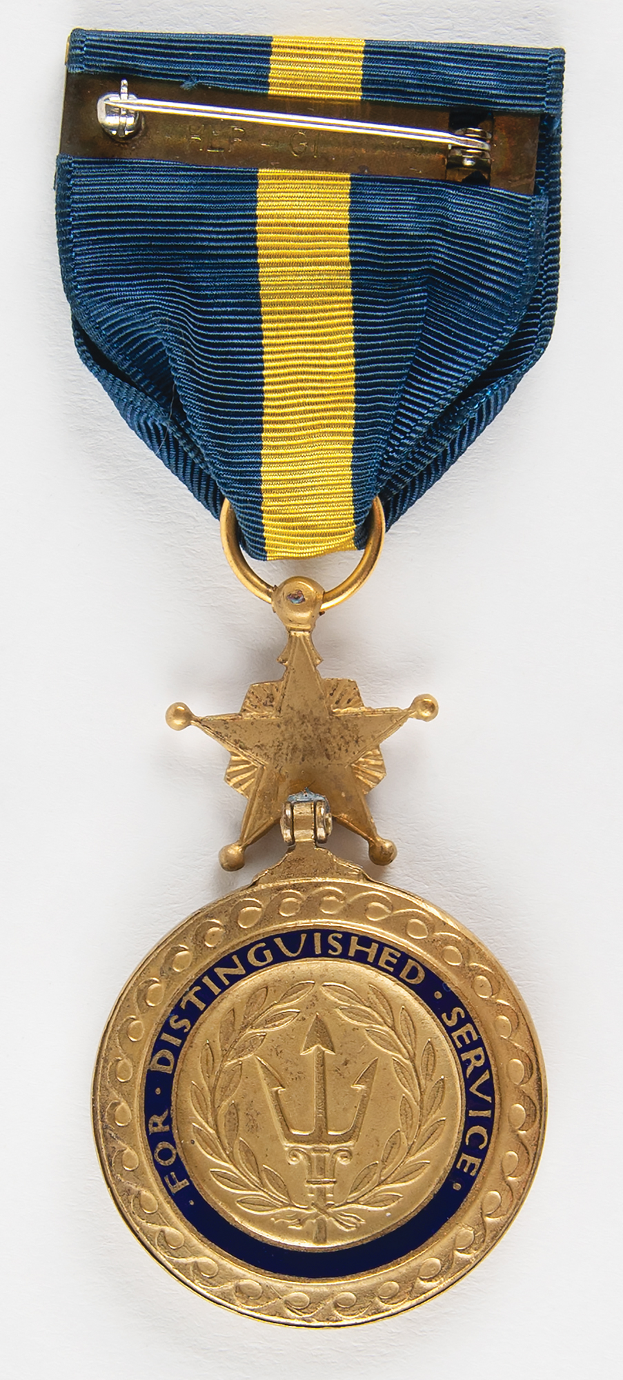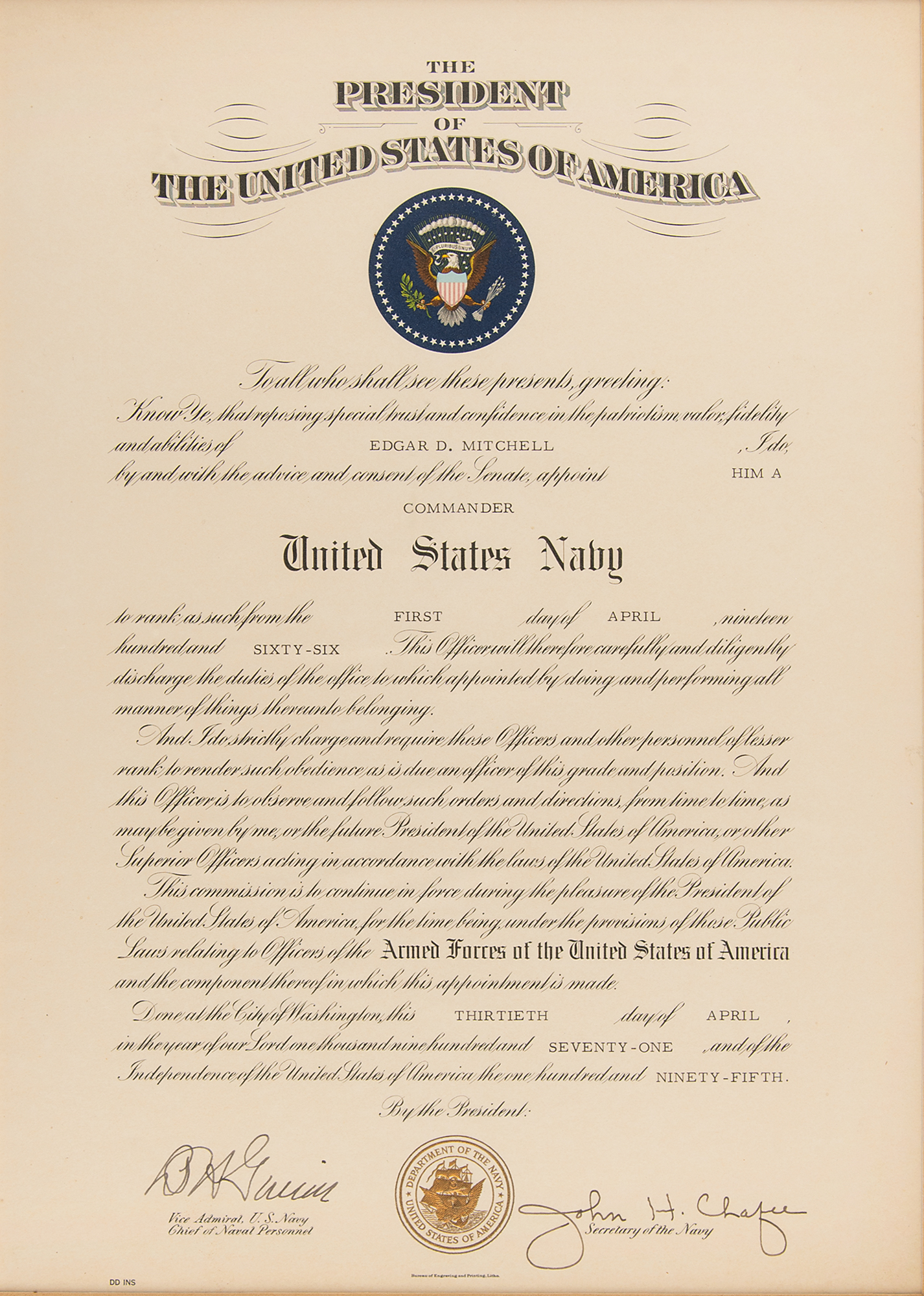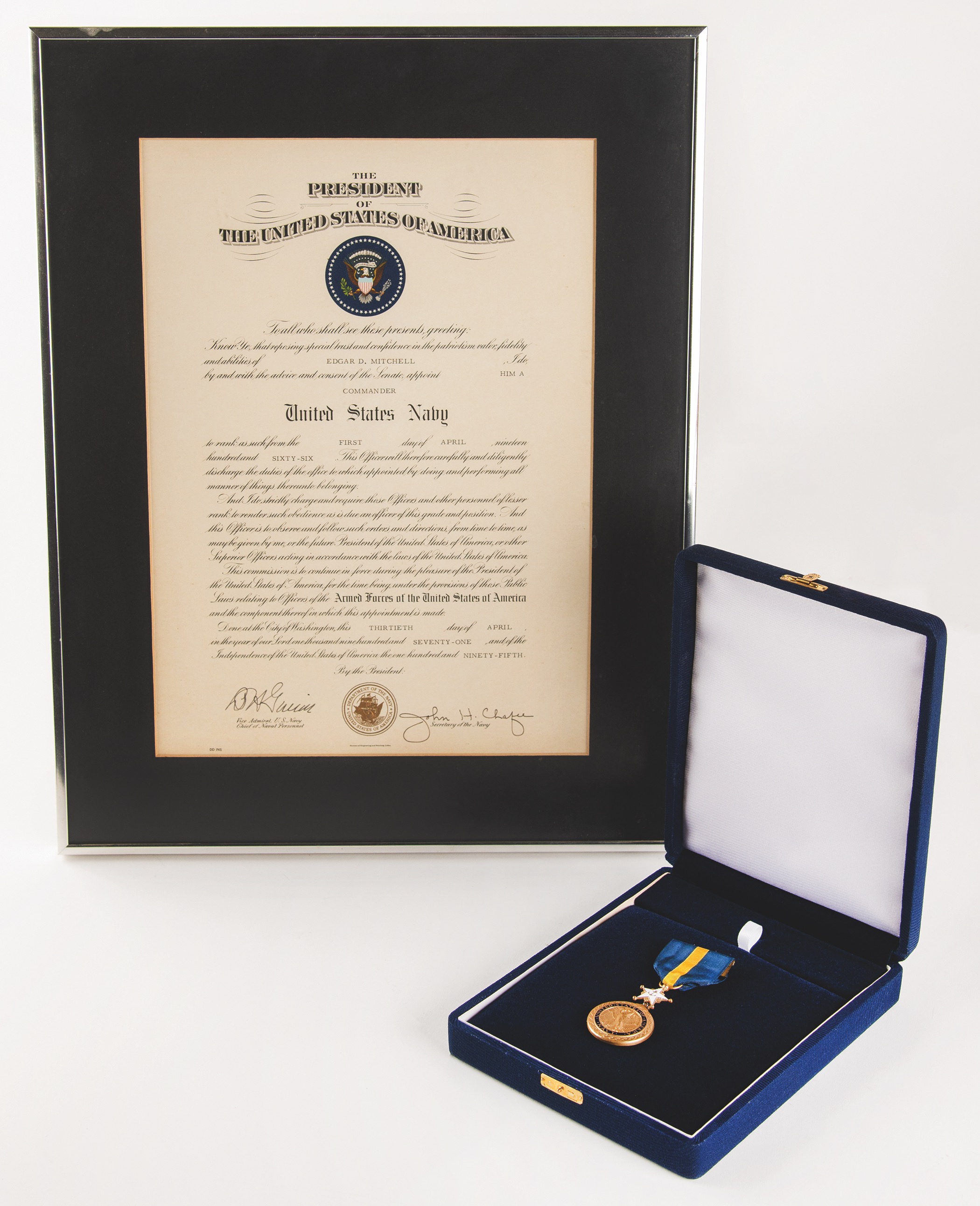 From the personal collection of Apollo 14 moonwalker Edgar Mitchell—a Navy Distinguished Service Medal, featuring a 1.25˝ gilt bronze medallion suspended from a blue-and-yellow ribbon, housed in its hinged case; and a certificate promoting him to commander in the United States Navy, one page, 10 x 13.75, April 30, 1971, with autopen signatures of Vice Admiral Dick H. Guinn and Secretary of the Navy John H. Chafee at the conclusion. In part: "Know ye, that reposing special trust and confidence in the patriotism, valor, fidelity and abilities of Edgar D. Mitchell, I do, by and with the advice and consent of the Senate, appoint him a Commander, United States Navy." The certificate is matted and framed to an overall size of 14.5 x 18.5. In overall fine condition.