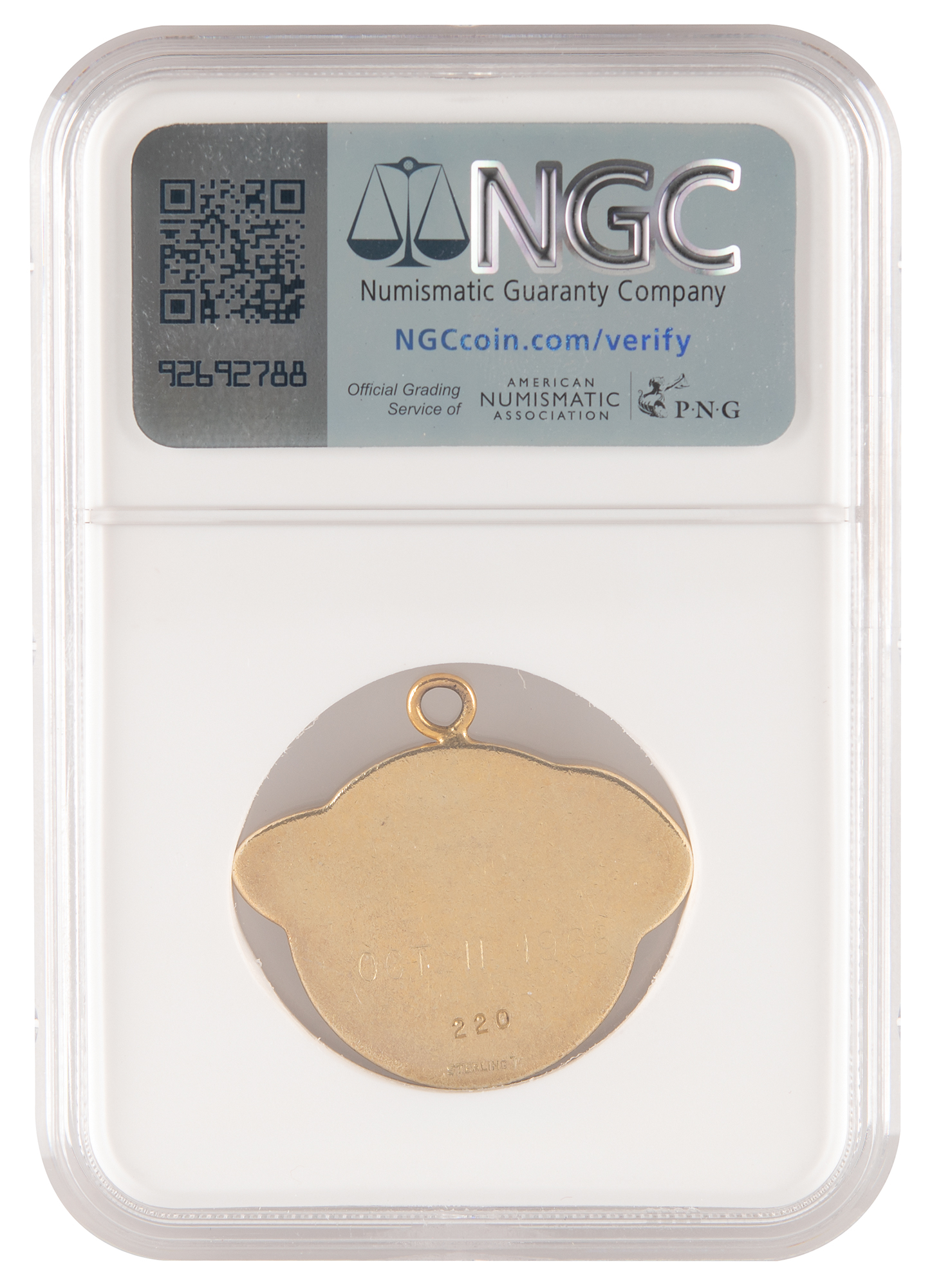 Flown sterling silver Apollo 7 Robbins medallion with later gold gilding and addition of a jump ring for inclusion on the charm bracelet of Louise Randall, the wife of Apollo 14 LMP Edgar Mitchell, measuring approximately 1.25˝ x 1˝, featuring a raised design of the mission insignia on the face—a capsule orbiting Earth, the mission number, and the last names of crew members Wally Schirra, Donn Eisele, and Walt Cunningham. The reverse is engraved with the mission's launch date, “Oct. 11, 1968," and serial number, “220.” Stamped below with the Robbins "Sterling" hallmark. Encapsulated and graded by NGC as "AU Details," with the label noting the provenance, "Ex. Edgar Mitchell." Accompanied by a certificate depicting the complete charm bracelet, which carried flown medallions from eleven Gemini and Apollo missions.
