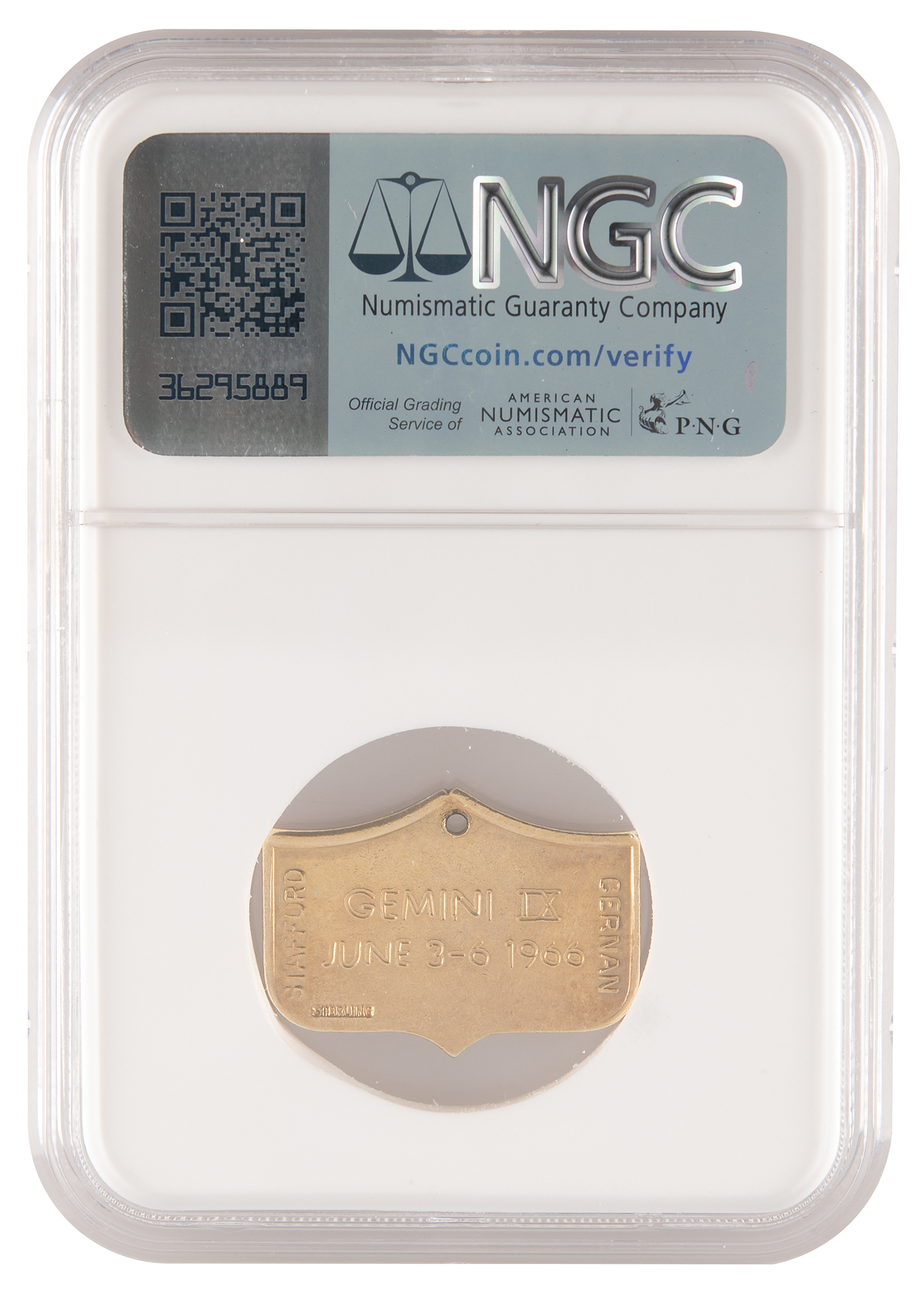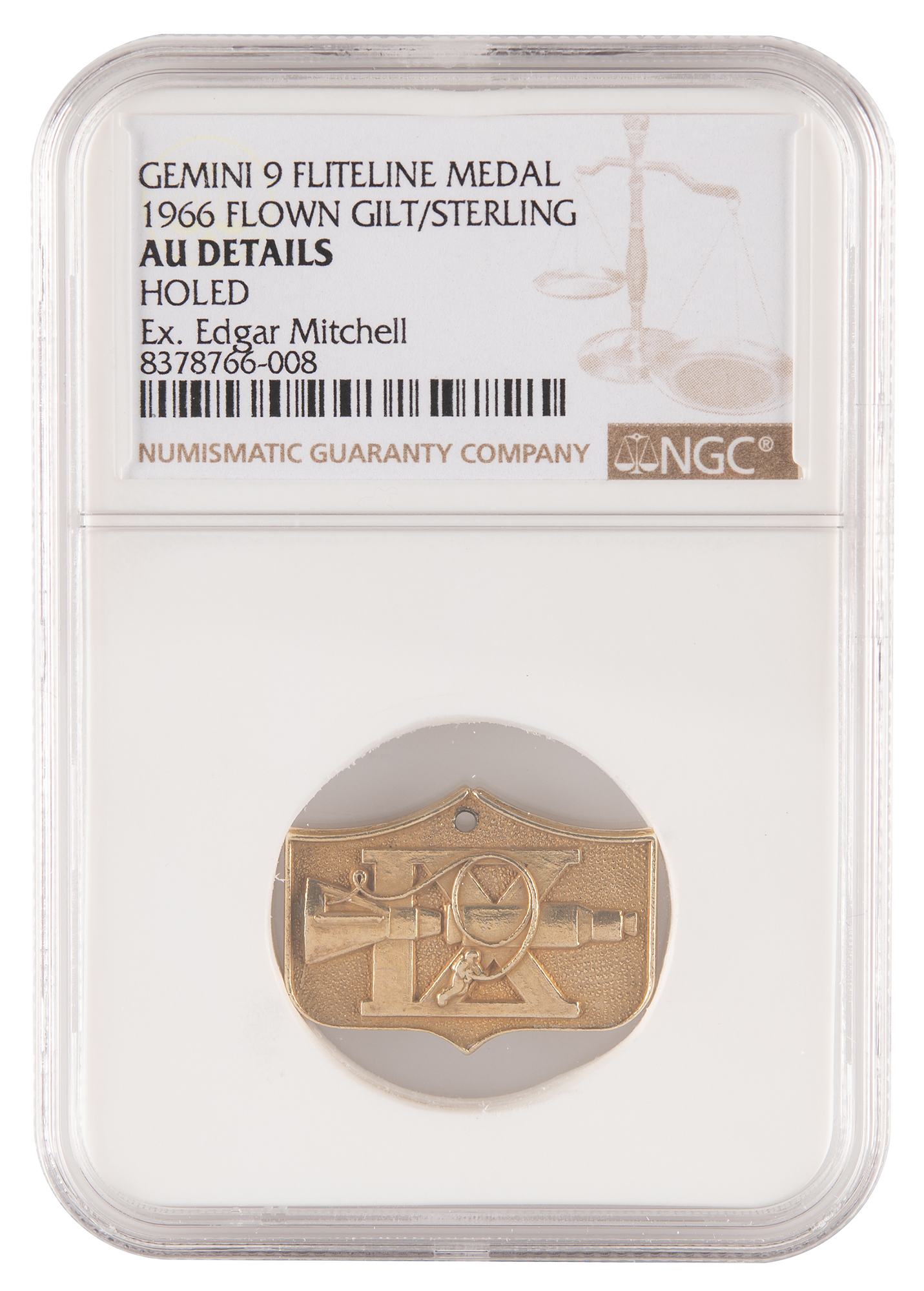 Flown gold-plated sterling silver Gemini 9 Fliteline medallion with hole bored for inclusion on the charm bracelet of Louise Randall, the wife of Apollo 14 LMP Edgar Mitchell, measuring 1˝ x .75˝, featuring a raised design of the shield-shaped mission insignia on the front—the Gemini spacecraft in rendezvous with the Agena target vehicle, with astronaut performing a tethered EVA over the Roman numerals "IX." The reverse is engraved with the mission name and dates, "Gemini IX, June 3–6, 1966," with the astronauts' names on either side, "Stafford" and "Cernan." Hallmarked "Sterling" at the bottom. Encapsulated and graded by NGC as "AU Details," with the label noting the provenance, "Ex. Edgar Mitchell." Accompanied by a certificate depicting the complete charm bracelet, which carried flown medallions from eleven Gemini and Apollo missions.