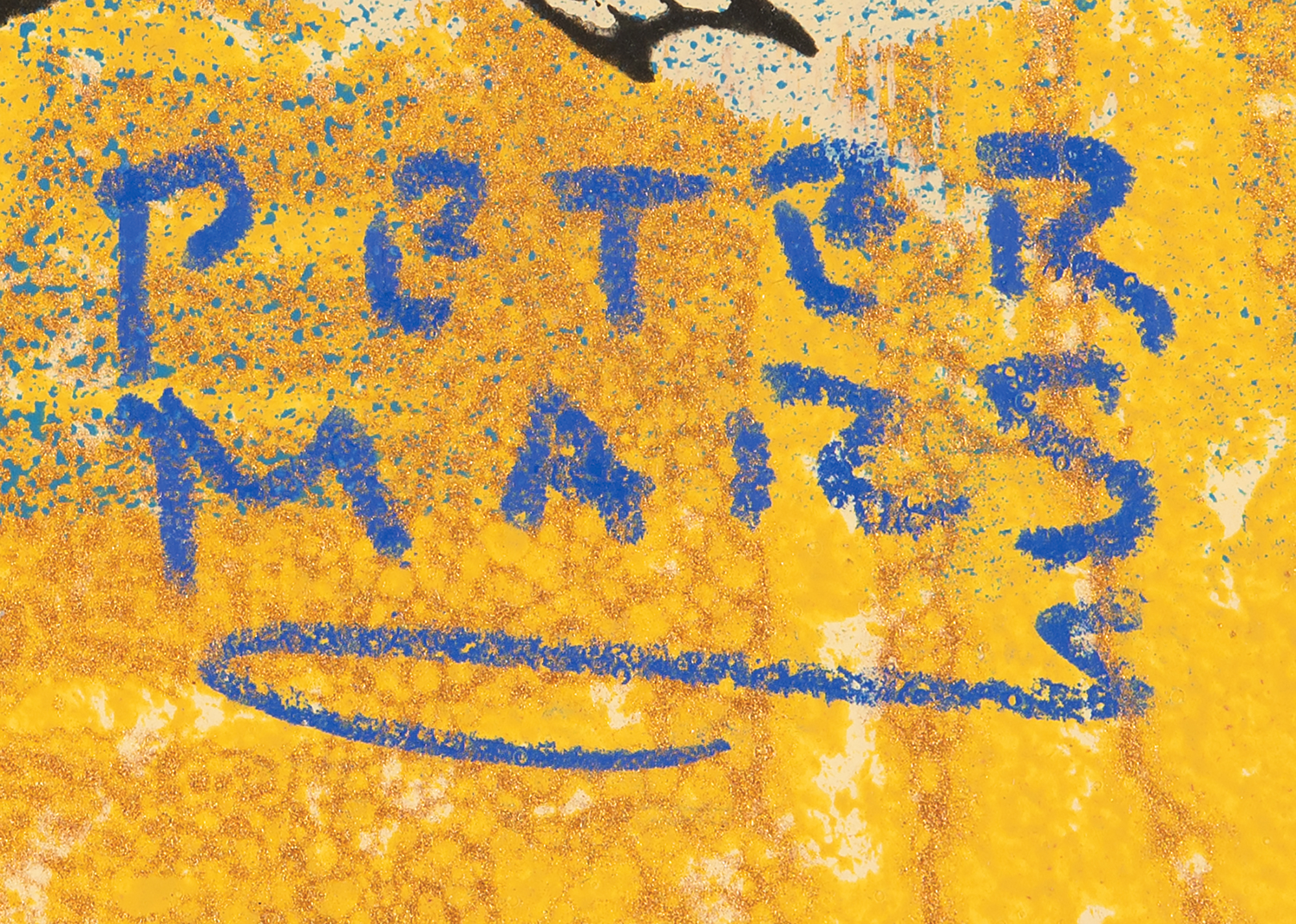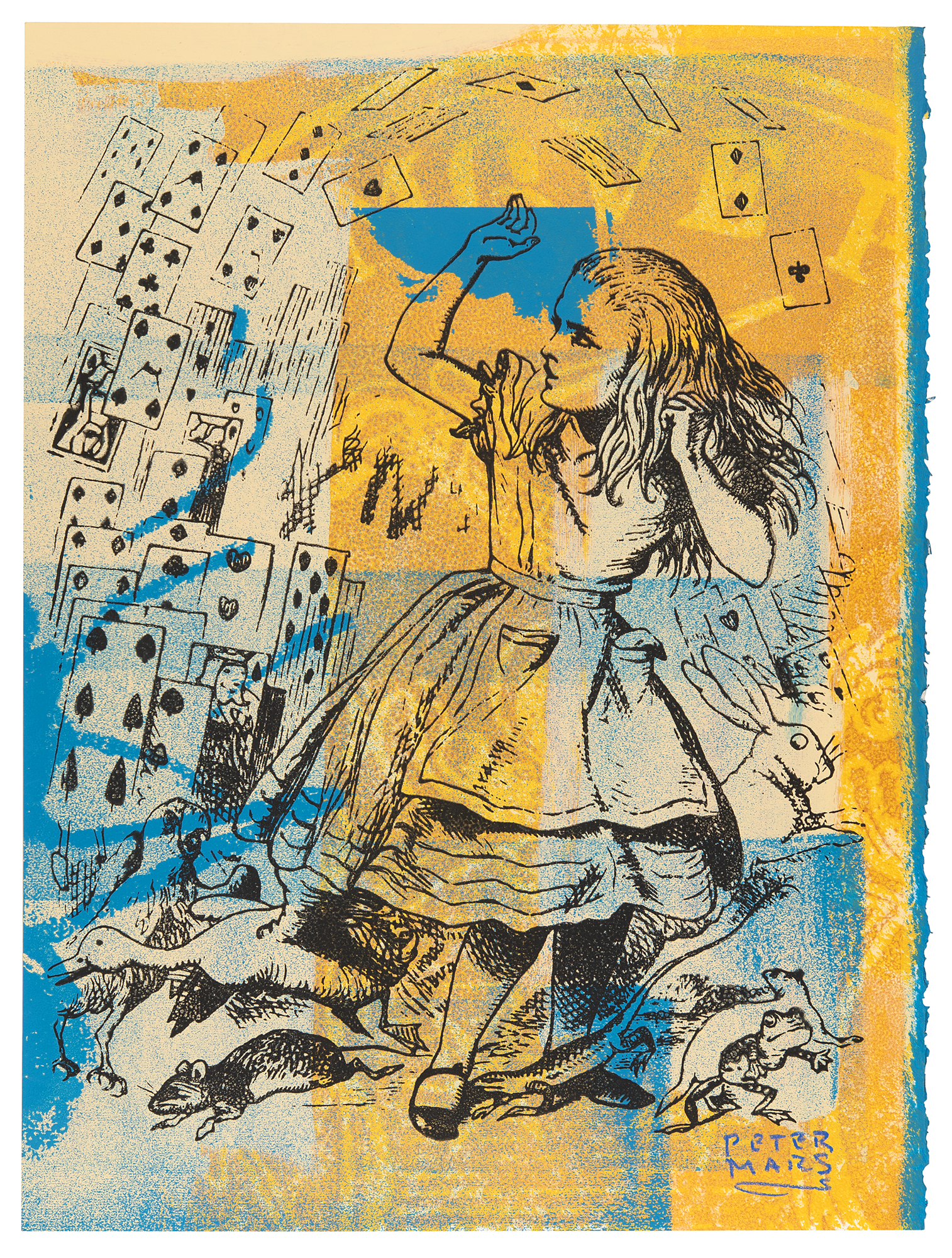 American artist (born 1959) with ties to both the Pop Art and Outsider Art movements, whose paintings incorporate the use of silkscreen or serigraphy on various mediums including wood, canvas, and paper. Beautiful original color 15 x 20 multi-layered silkscreen painting by pop artist Peter Mars entitled ‘Sense of Power,’ presented as part of his wonderful ‘Alice’s Adventures’ series, created from images made from John Tenniel’s original plates and crafted by hand-pulling acrylic paints through original 1900s redwood silkscreen frames and placed on heavyweight archival paper, signed in the lower right corner in blue artist pencil by Mars. The image, which depicts Alice with cards flying over her and animals at her feet, can be found on page 188 in Lewis Carroll’s Alice’s Adventures in Wonderland. The reverse bears two artist stamps and is signed again by Mars, who adds the name of his studio, “Kitty Joe’s Castle, Sedona.” In fine condition.