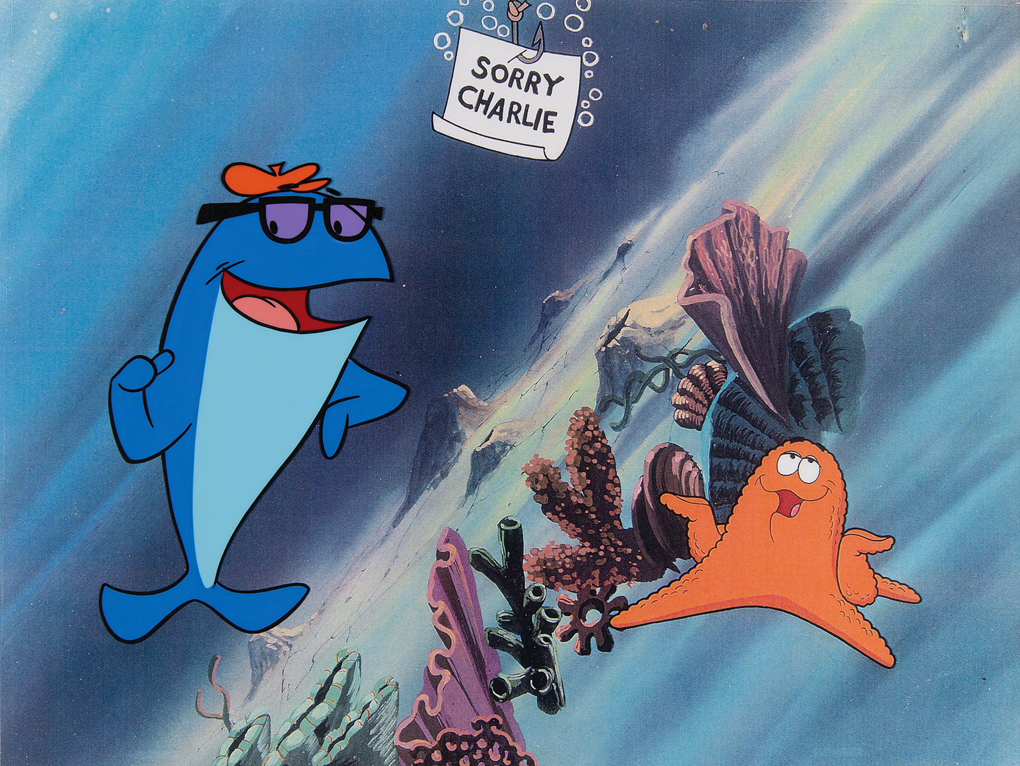 (DePatie-Freleng Enterprises, 1970s-1980s) Original vintage production cel featuring Charlie the Tuna from a StarKist television commercial, picturing the fish in a full-length pose wearing his trademark beret and thick glasses. The cel is placed on a color copy background of the ocean floor with coral, octopus, and dangling hook with a ‘Sorry Charlie’ sign. Image measures 3.5 x 5.5, with a mat opening of 12 x 9. Double-matted to an overall size of 18 x 14. In fine condition. An uncommon production cel of one of the most recognized characters in American advertising.