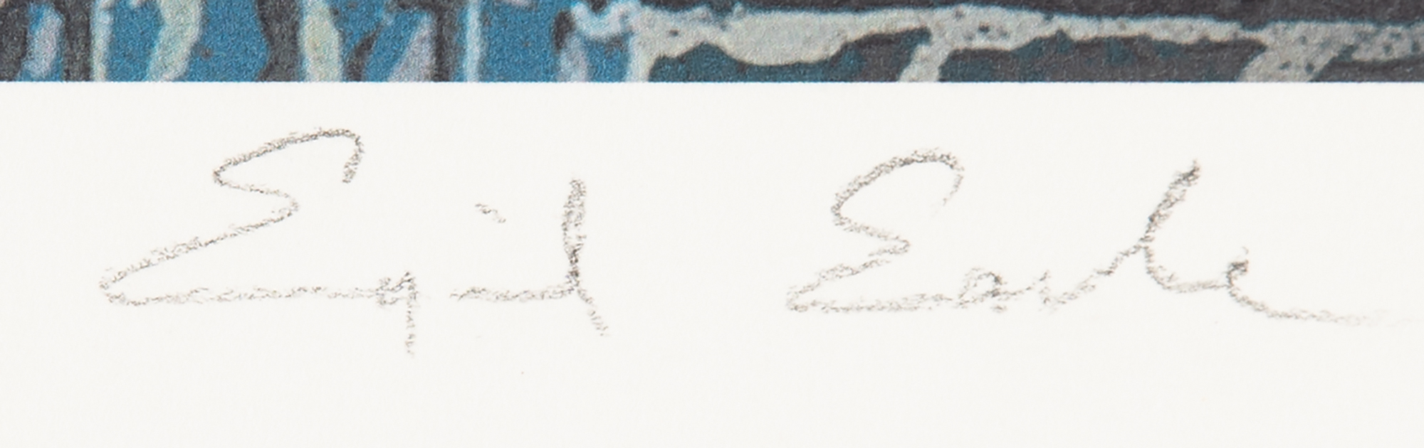 Sought-after limited edition color 20 x 16 giclee print from The Disney Gallery’s ‘Sleeping Beauty Castle Tableaus,’ a series of six giclee prints featuring the artwork of the great Eyvind Earle, who has signed in the lower border in pencil. This particular print, entitled ‘Burning Spinning Wheels,’ is numbered 2/40 and depicts King Stefan and Queen Leah watching the pyre of spinning wheels burning brightly in their castle courtyard. In very fine condition. Accompanied by the original certificate of authenticity from The Disney Gallery, which bears Earle’s facsimile signature.