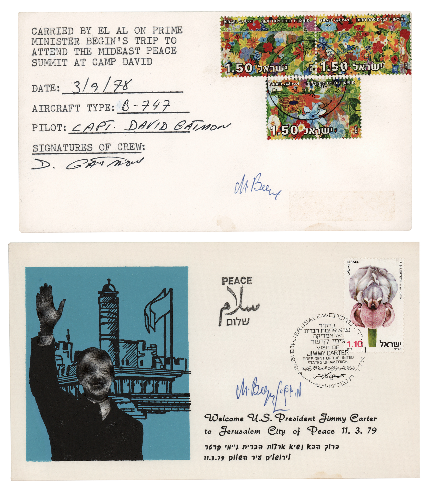 Two commemorative covers: one "carried by El Al on prime Minister Begin's trip to attend the Mideast Peace Summit at Camp David" on September 3, 1978, signed in blue ballpoint by Menachem Begin and in black felt tip by the pilot; and one honoring Jimmy Carter's visit to Jerusalem on March 11, 1979, signed in blue ballpoint by Menachem Begin. In overall fine condition.