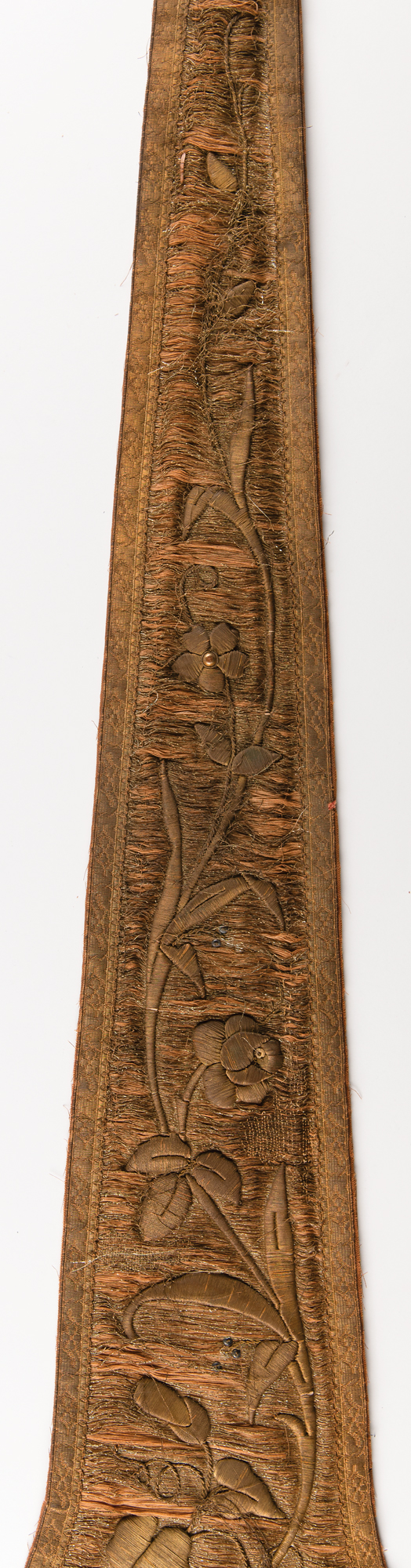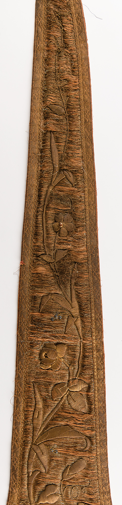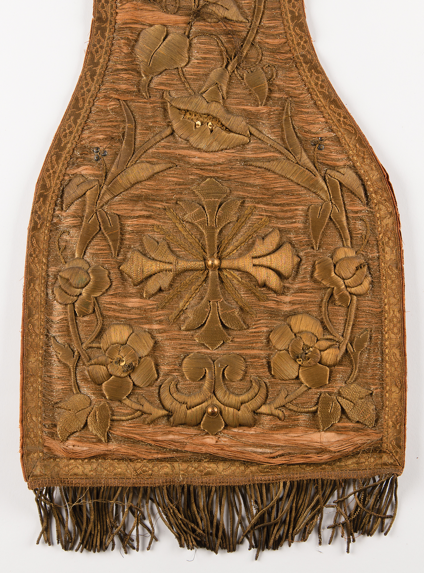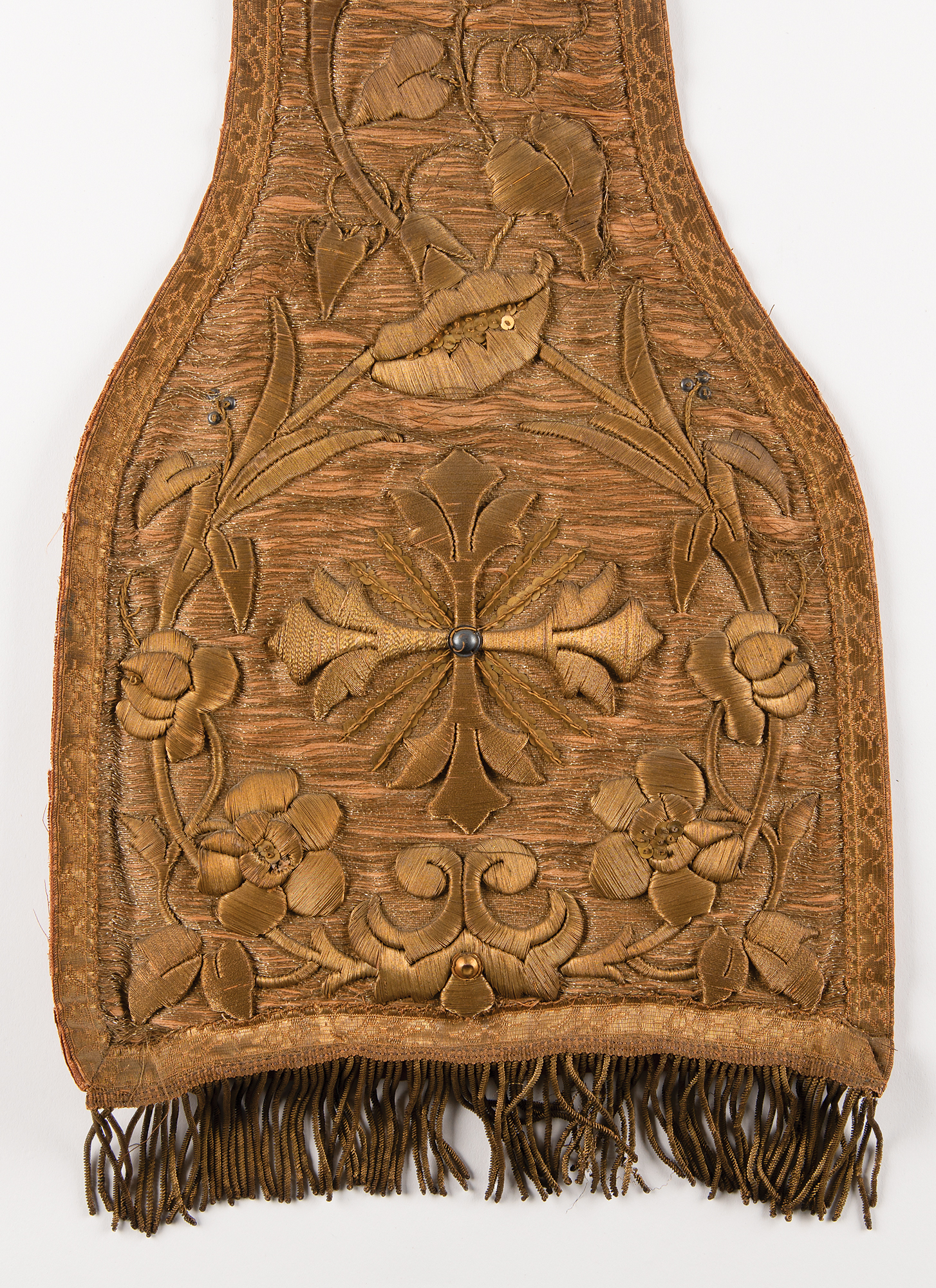 Antique circa 1900 liturgical stole made from silk and cotton, with floral and cross designs embroidered with gold wire bullion thread and sequins, measuring approximately 89˝ in length and 10.75˝ at its widest point. In fair condition, with cracked silk and damaged lining.