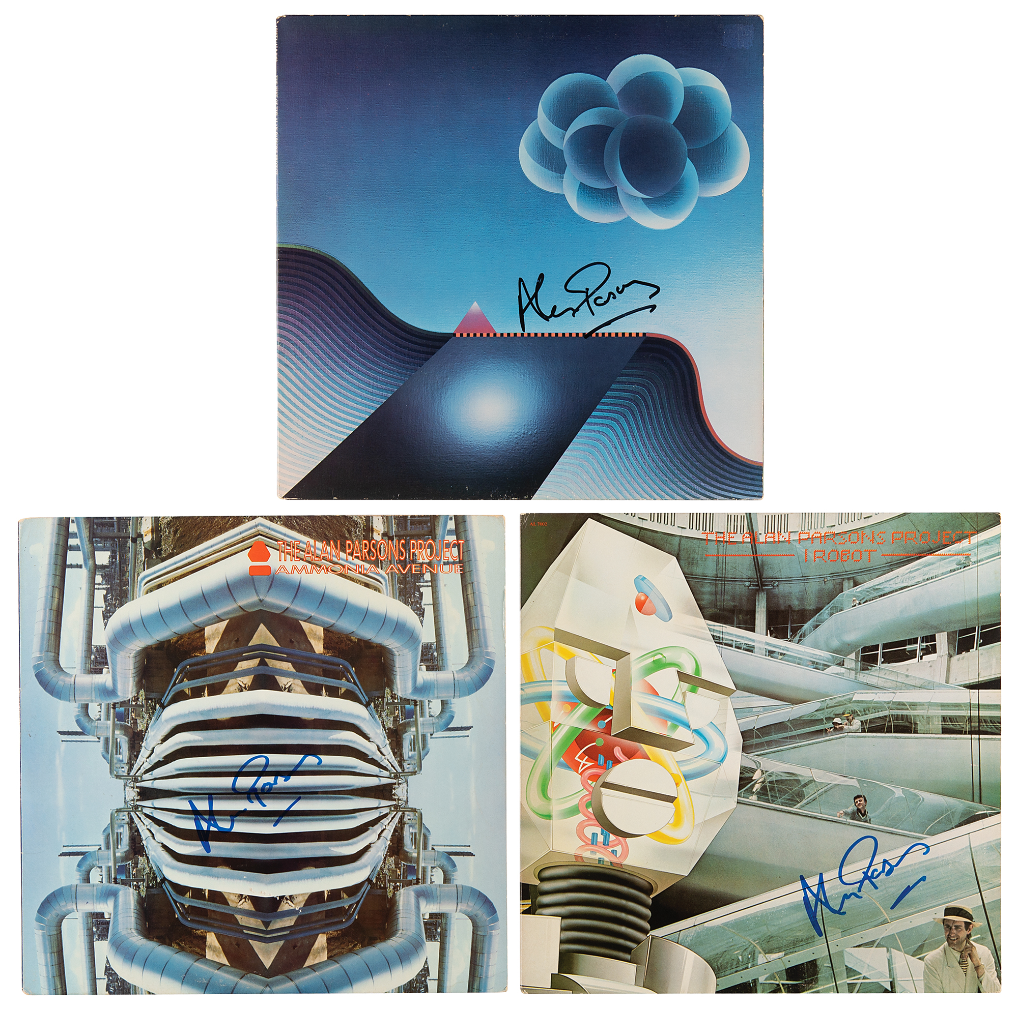 Three albums by The Alan Parsons Project — Ammonia Avenue, The Best of the Allan Parsons Project, and I Robot — each signed on the front cover in blue or black felt tip by Parsons. In overall fine condition. The records are included.