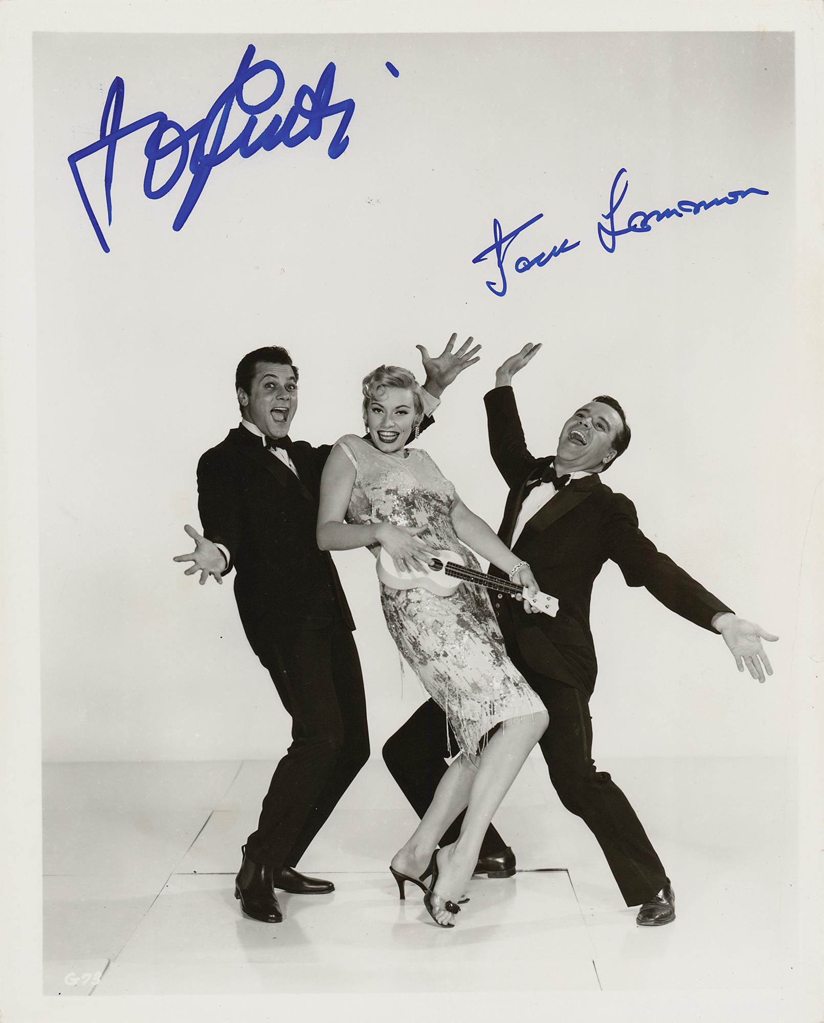 Glossy 8 x 10 photo of the Some Like It Hot stars, signed in blue felt tip by Tony Curtis and Jack Lemmon. In fine condition, with light creasing in the right border.